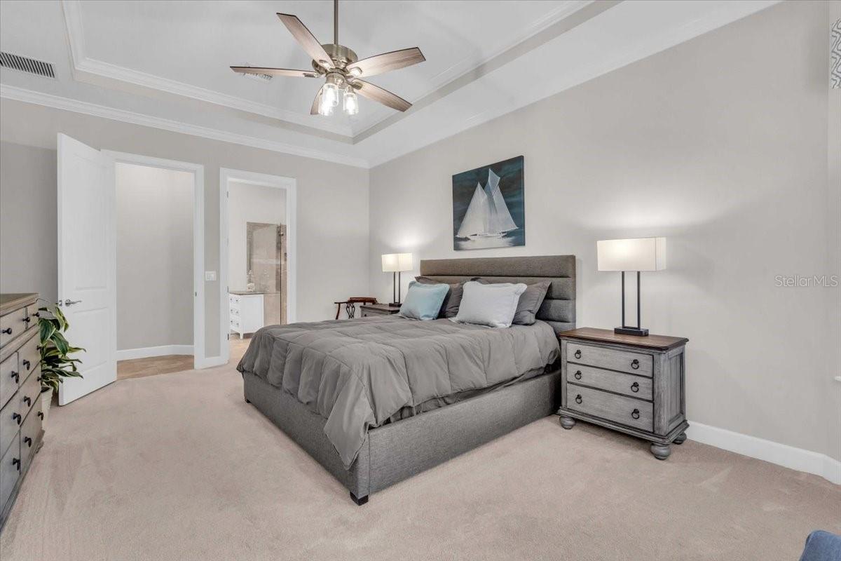 Built-in Features, Ceiling Fans(s), Crown Molding, Eat-in Kitchen, High Ceilings, Kitchen/Family Room Combo, Living Room/Dining Room Combo, Open Floorplan, Primary Bedroom Main Floor, Stone Counters, Thermostat, Tray Ceiling(s), Walk-In Closet(s), Window Treatments