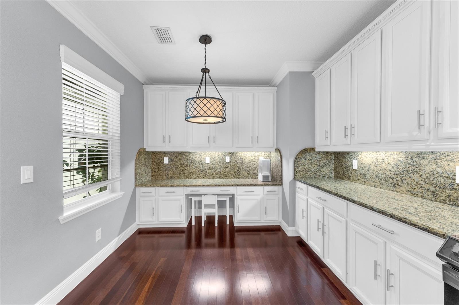 Step into this elegant Modern Mediterranean 3-bedroom, 2.5-bath home on a corner lot, where warm hardwood floors, fresh exterior paint, and timeless crown molding set the tone for elevated everyday living. With its striking tile roof, in-ceiling audio speakers in the living room and porch, and refined details throughout, this beautifully maintained property delivers comfort, quality, and curb appeal in one exceptional package. The spacious, open-concept kitchen is the heart of the home—featuring 42" cabinets, granite countertops, stainless steel appliances, a built-in desk area, and a well-appointed pantry. It flows seamlessly into the great room for easy entertaining and everyday living. Upstairs, three bright bedrooms feature hardwood floors and abundant natural light. The conveniently placed laundry room adds to the home's practicality. All bathrooms include marble countertops and 18-inch tile for a polished, timeless look. Outdoor living shines with an extended brick paver patio and mature, zero-maintenance landscaping—ideal for hosting or relaxing. Located on a quiet, low-traffic street with ample guest parking, this move-in-ready home is zoned for top-rated Baldwin Park Elementary, Glenridge Middle, and Winter Park High. The community of Baldwin Park is pre-wired for high-speed fiber internet, and 1GB service is included in the HOA. Residents also enjoy access to community pools, scenic trails, a fitness center, charming shops, popular restaurants, and a vibrant neighborhood atmosphere—all just minutes from Winter Park, Downtown Orlando, and world-class attractions.
