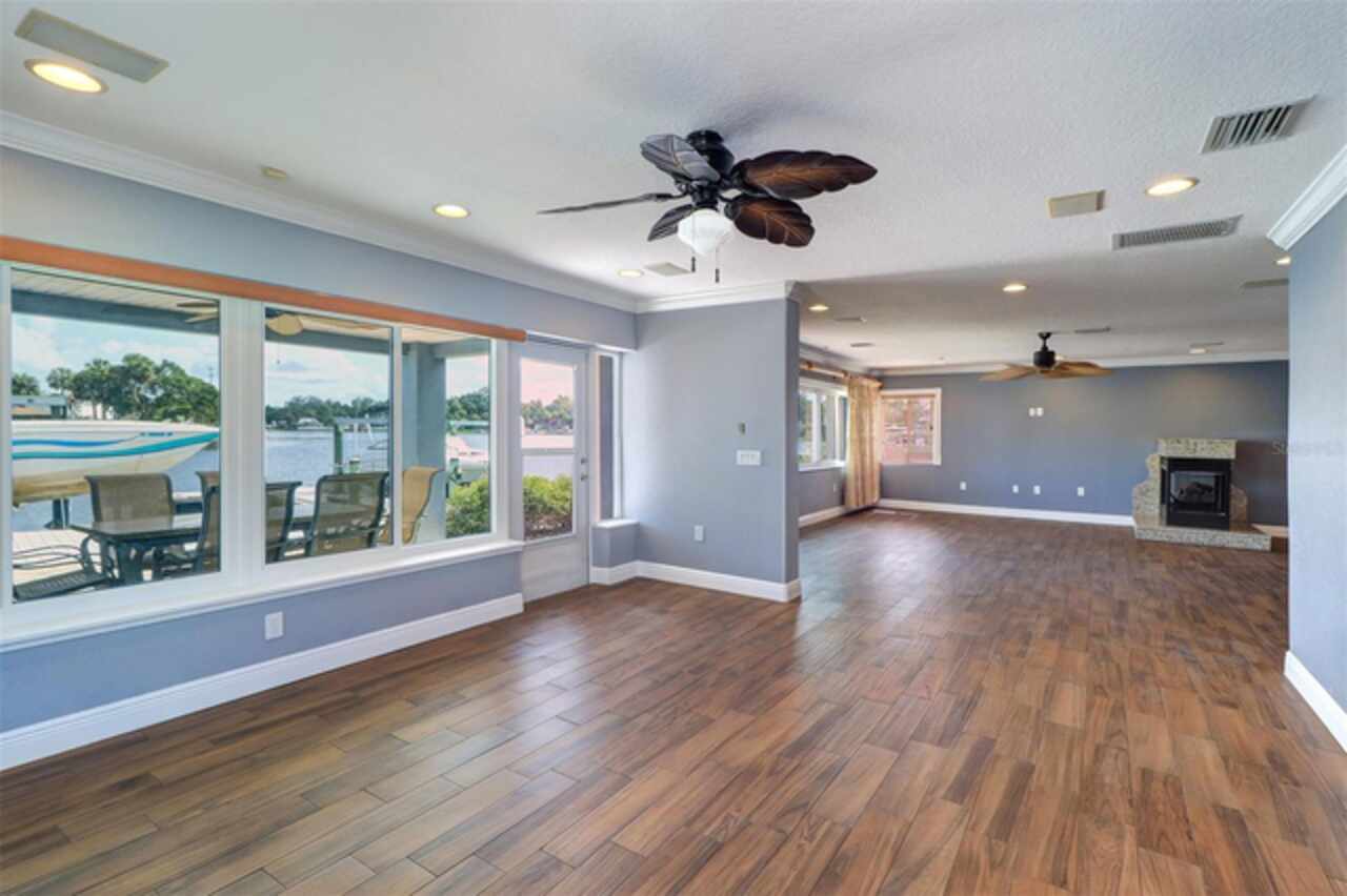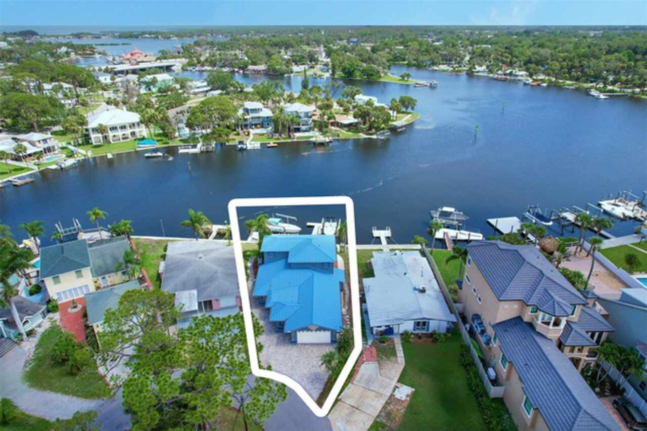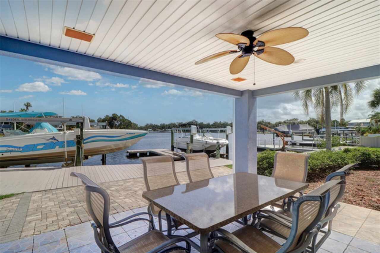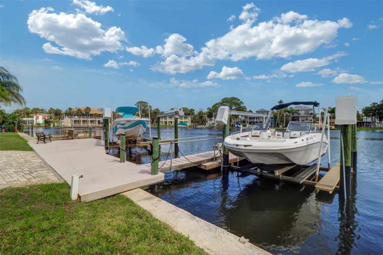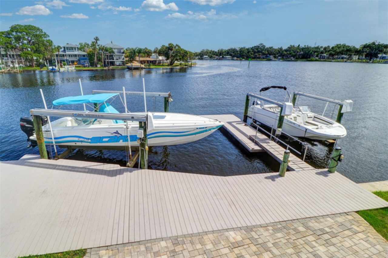 Discover this stunningly renovated Cotee Riverfront residence with 65 feet of composite board dock, a floating dock, two boat lifts, (24, 000/8, 000 PDS) and a paver lounge area, this home offers unparalleled access to the ever-active Cotee River. A spacious 20x30 oversized garage with extra Storage accommodates all your toys, complemented by an additional paved parking area and a 10x9 finished storage space with stylish c-tile flooring. The garage houses a full bath/laundry room, complete with c-tile flooring, granite counters, and a walk-in shower. Modern oversized 15x13 updated gourmet kitchen boasts 36-inch cabinets, soft-close drawers, granite countertops, and new appliances, including a coveted GAS range. C-tile and wood-grain composite flooring extend throughout, blending durability with elegance. Enjoy the breathtaking panoramic views of the Cotee River from the expansive 33x25 great room, featuring a gas fireplace. The adjoining 16x15 dining area opens onto a 16x15 covered lanai, perfect for seamless indoor-outdoor living and entertaining by the river. Two spacious bedrooms on the main level provide comfort and convenience. Upstairs, the luxurious 15x32 ensuite offers a gas fireplace, an adjacent 15x15 private sitting area, and exclusive access to an 18x12 observation platform for stunning river vistas. The ensuite bathroom showcases a wraparound walk-in shower and dual c-tile sinks. A durable metal roof ensures peace of mind. Equipped with two AC units for optimal climate control. With three bedrooms, three baths, and 2, 800 sq. ft. of refined living space, this home redefines modern riverfront living. And best of all, enjoy the golf cart friendly always active downtown New Port Richey with many upscale restaurants and unending riverfront activities for the whole family.