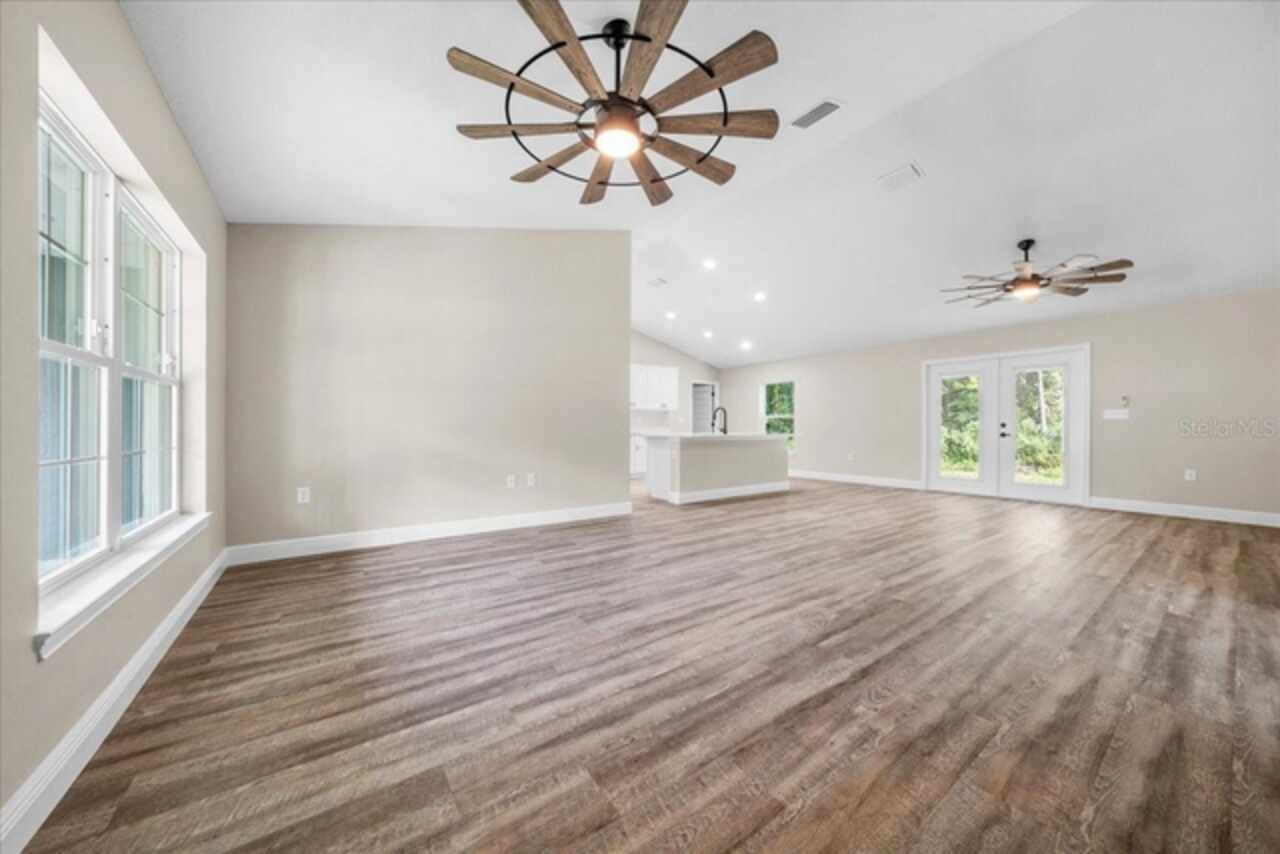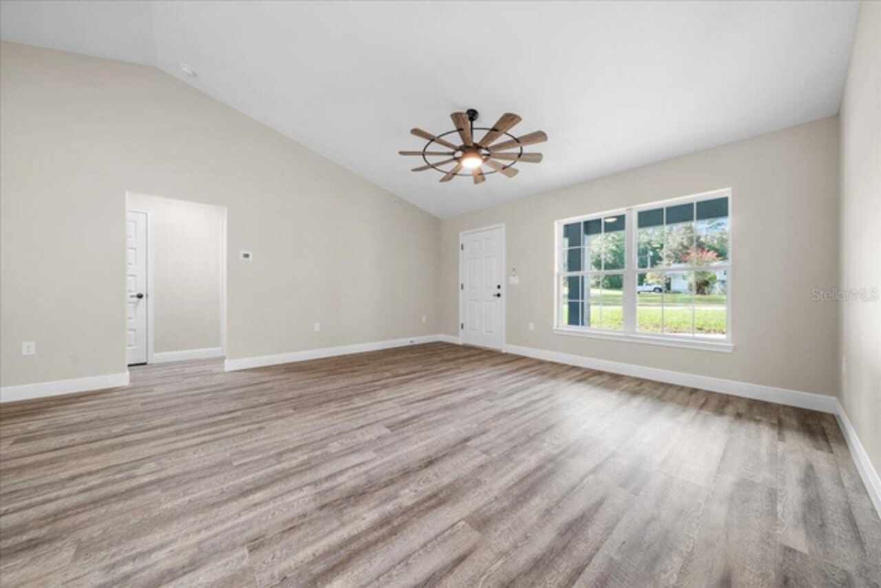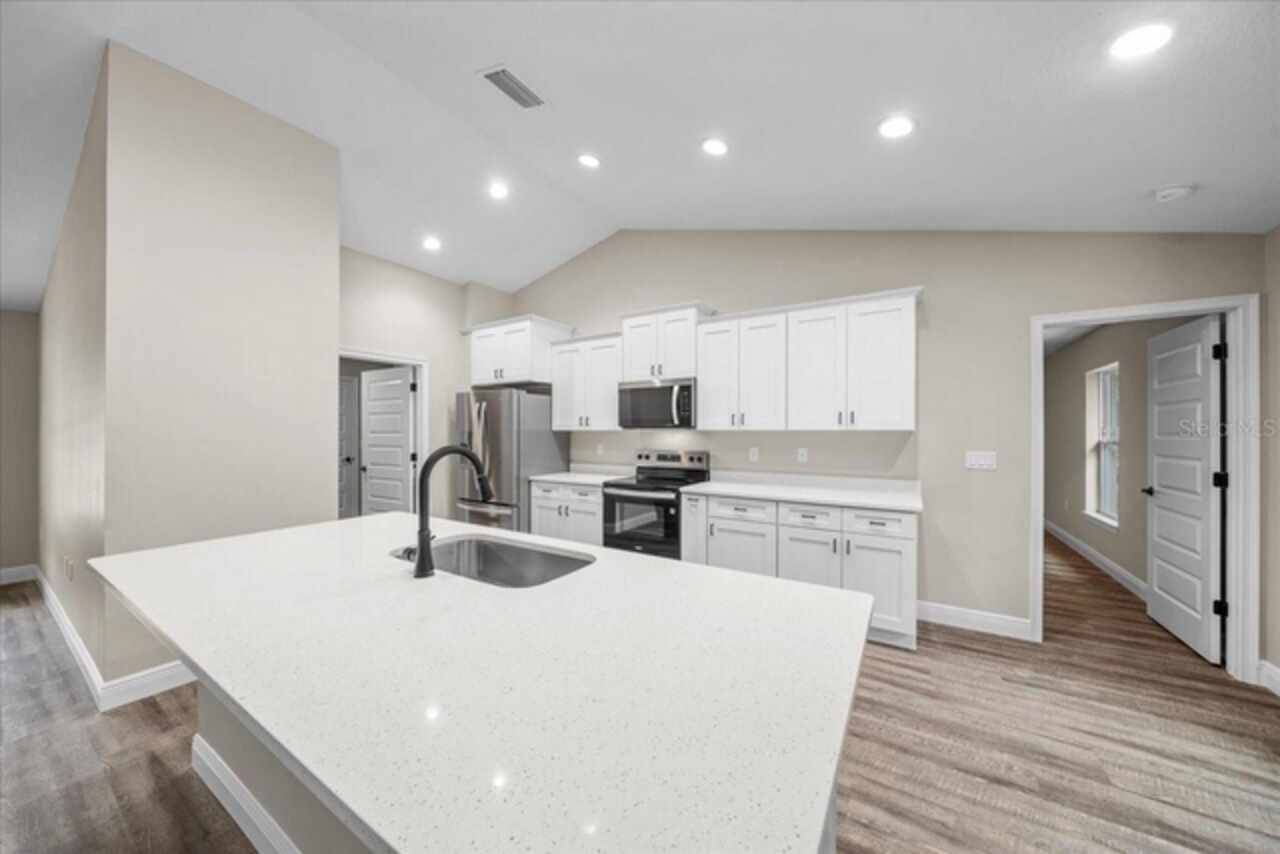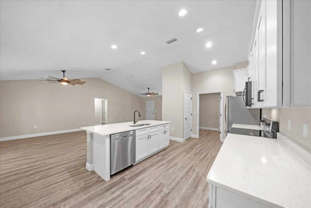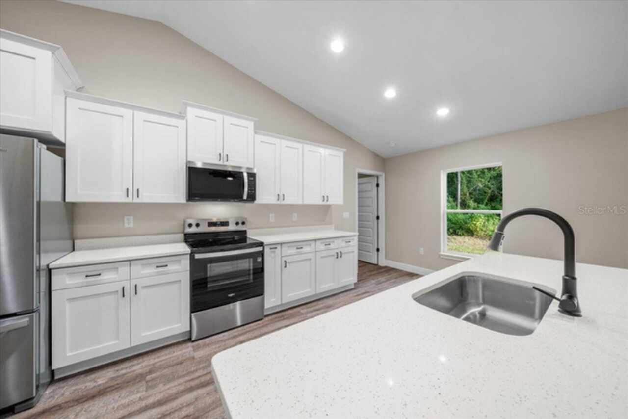 Introducing an exquisite newly constructed three-bedroom, two-bath home. This residence is designed to impress, featuring cathedral ceilings in the living room that enhance the sense of space and openness. The seamless open floor plan connects to a beautiful kitchen, complete with a large island, premium granite countertops, and stainless steel appliances. The home has LVP flooring throughout, ensuring both elegance and durability. Additional conveniences include an indoor laundry room and an 8x16 covered lanai, great for hosting gatherings or enjoying peaceful moments outdoors. The master suite is a sanctuary of luxury, offering a tray ceiling, a generously sized walk-in closet, and a master bath equipped with double sinks and a walk-in shower. Every element of this home has been meticulously crafted to provide unparalleled comfort, style, and functionality. Seize the opportunity to own this exceptional property. Located in Citrus Springs on a corner lot. Short drive to many local waterways and Crystal River. Your dream home awaits.