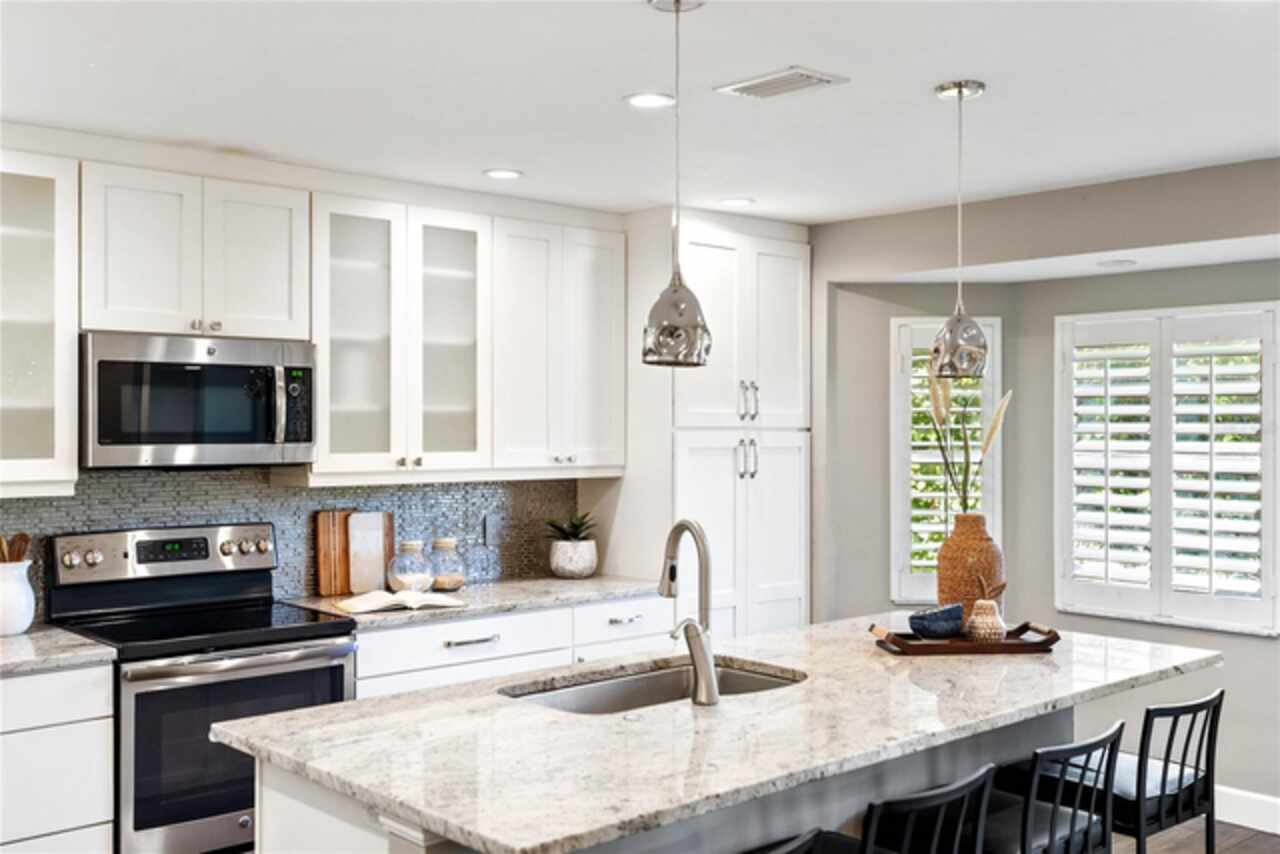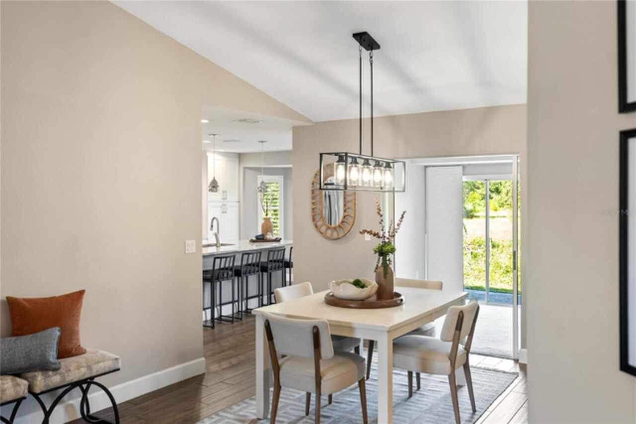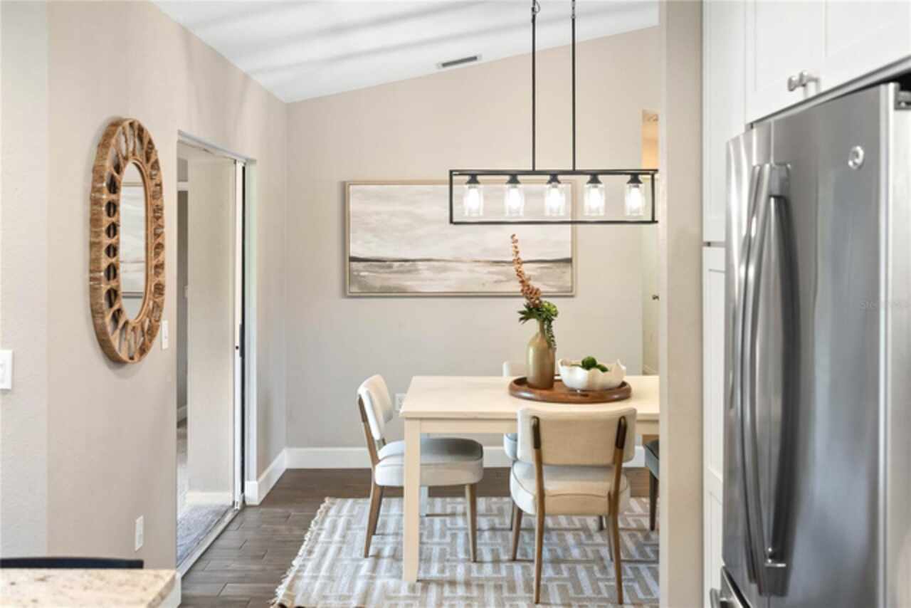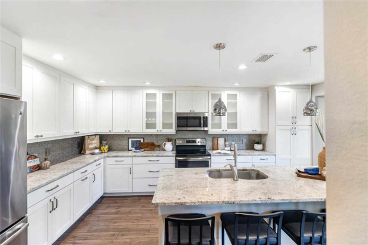 One or more photo(s) has been virtually staged. This beautifully remodeled 4-bedroom, 2-bathroom home in Sarasota’s Deer Hollow community offers the perfect balance of modern style, comfort, and convenience. From the moment you step inside, you’ll notice the light-filled open layout with soaring vaulted ceilings and a seamless flow between the living, dining, and kitchen areas. The main living spaces are finished with tile designed to look like natural hardwood, offering both style and long-lasting durability. While plush carpet in the bedrooms and tile in the bathrooms provide comfort and functionality throughout. At the heart of the home, the custom kitchen is a true showpiece designed for both cooking and entertaining, with bright white shaker cabinets accented by glass fronts, granite countertops, stainless-steel appliances, and an oversized island with bar seating. The dining room just off the kitchen offers plenty of space for family dinners and opens to the backyard for effortless indoor-outdoor living. The primary suite provides a private retreat, while the updated bathrooms showcase modern tile, vanities, and fixtures with a spa-like feel. Three additional bedrooms offer flexibility for family, guests, or a home office. Practical updates include a roof replaced in 2019, an A/C system installed in 2013, and a hot water heater from 2016, giving buyers peace of mind. Located in the desirable Deer Hollow community, residents enjoy tree-lined streets, walking trails, and a playground with low HOA fees and no CDD costs, all just minutes to the UTC Mall, Benderson Park, and a variety of shopping, dining, and entertainment. When it’s time for a beach day, Sarasota’s world-famous Gulf beaches are only a short drive away, making this thoughtfully updated, move-in ready home a rare find for those seeking the very best of Sarasota living.