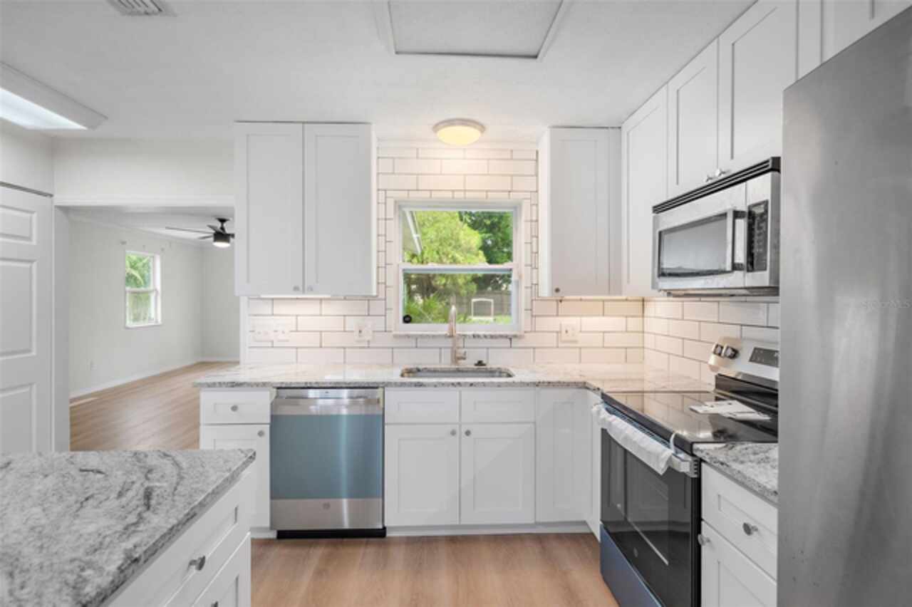One or more photo(s) has been virtually staged. This move-in ready, completely updated home shows like a model! Featuring a split 3 bedroom, 2 bath, with over 1400 sqft of interior living space. Enjoy the open kitchen which includes granite counters, stainless steel appliances, and a spacious island. Additionally, you find the interior laundry area that is conveniently located just off the kitchen. The open living spaces move from the front of the home to rear with the kitchen in the center. Opportunities galore as you step into the oversized backyard! Perfect for entertaining or even adding a pool, make your backyard oasis a custom masterpiece to reflect your lifestyle! Private outdoor structure perfect for storage space or a custom shed. Located near multiple parks, the 4th St corridor, downtown St. Pete, the area beaches and easy access to Tampa International Airport. Time to enjoy the Florida lifestyle!