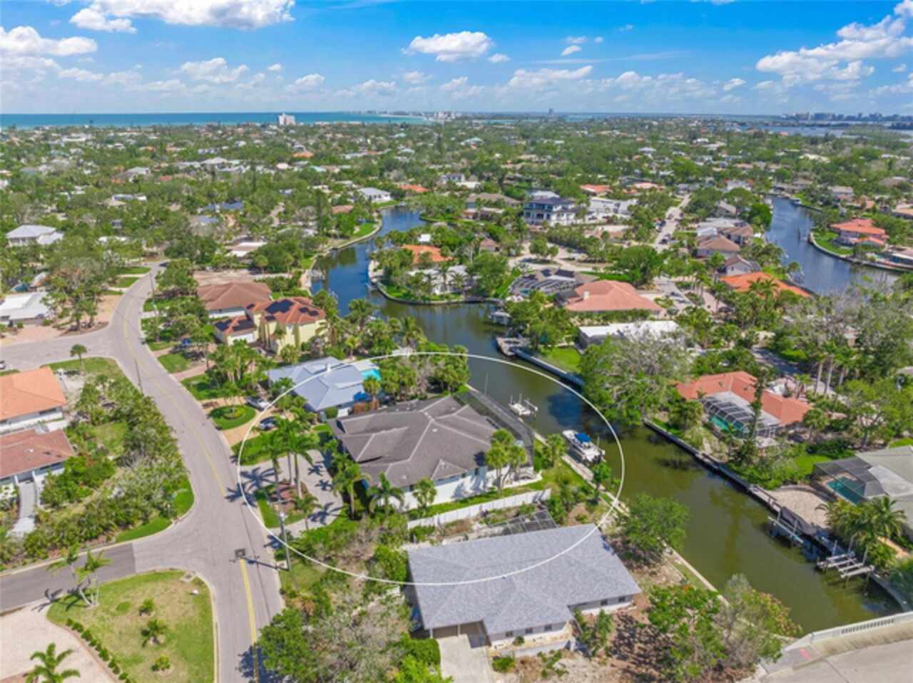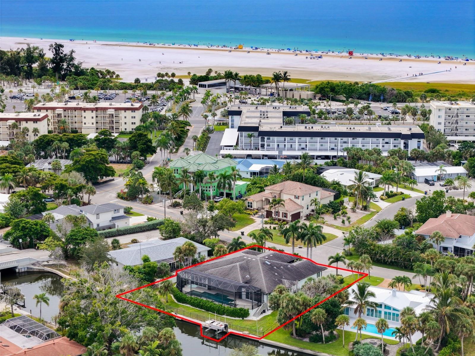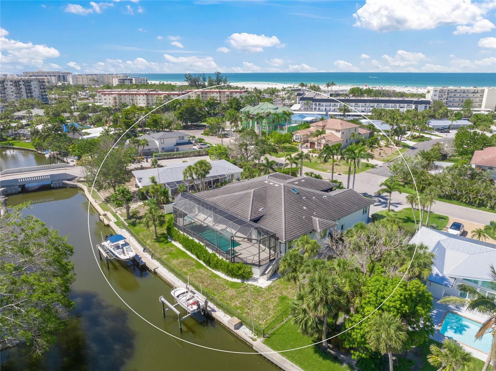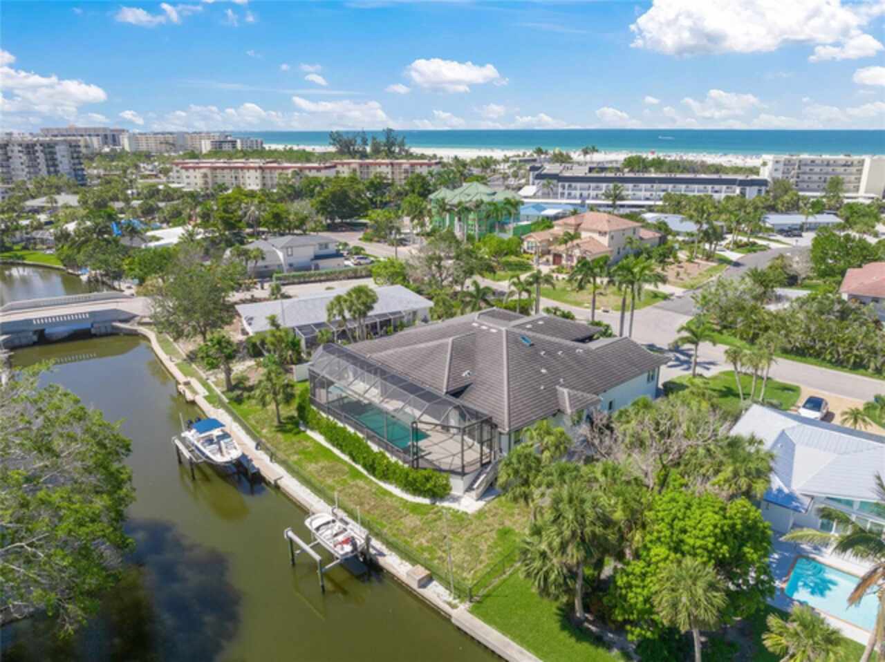 LOCATION, LOCATION, LOCATION !!! One Block to the Crystal Sands of Siesta Key Beach the #1 Beach in the USA! Or spend the day on the Aqua waters with two boats on lifts out back, and 119' of frontage on the Grand Canal leading to the ICW (only one bridge with about 15’ clearance to the Gulf). Oversized 16, 163 sf Lot, elevated concrete block home and spectacular pool in your view from most every room! Not just the best location, but this custom-built in 2016 West Indies style home is a fortress all on one level, and is well above flood plain. High and dry through the "storms of the century" in 2024. Beautiful, engineered hardwood floors, and everything freshly painted inside & out. Custom cabinetry and built-ins, as well as several new appliances, including a True Ice Maker. Three large en-suite bedrooms. Four full Baths, a Den/Office/ 4th bedroom with murphy bed, an Open Concept Family room, Dining room & Kitchen, and an extra-large Great Room make living spacious and easy. Large walls of sliding glass doors in all waterfront rooms extend living spaces to a huge, screened Lanai which adds over 500 sf to living space. The total A/C space is 3, 654 sf, with a total of 5, 075 under roof. All hurricane rated extra heavy duty PGT doors and windows. The oversized 3-car garage with an Epoxy floor has a very high ceiling which allows 2 more cars to be added on lifts for a total of 5 vehicles for the enthusiast. Climate controlled enclosed attic storage is available above the rear part of the garage. Both Air conditioning systems and Hot water heater replaced in past year. The large free form pool and spa have new high end Pentair pool pump & heater & auto chlorinator. Both boats as well as professional decorator staged furniture, decor and pictures may be available for separate purchase for "Turn-Key" possession. DEFINITELY check out the Virtual Tour, since it provides “3D walk through any direction” photos which can really give you the flow of the house as you manipulate your way around.