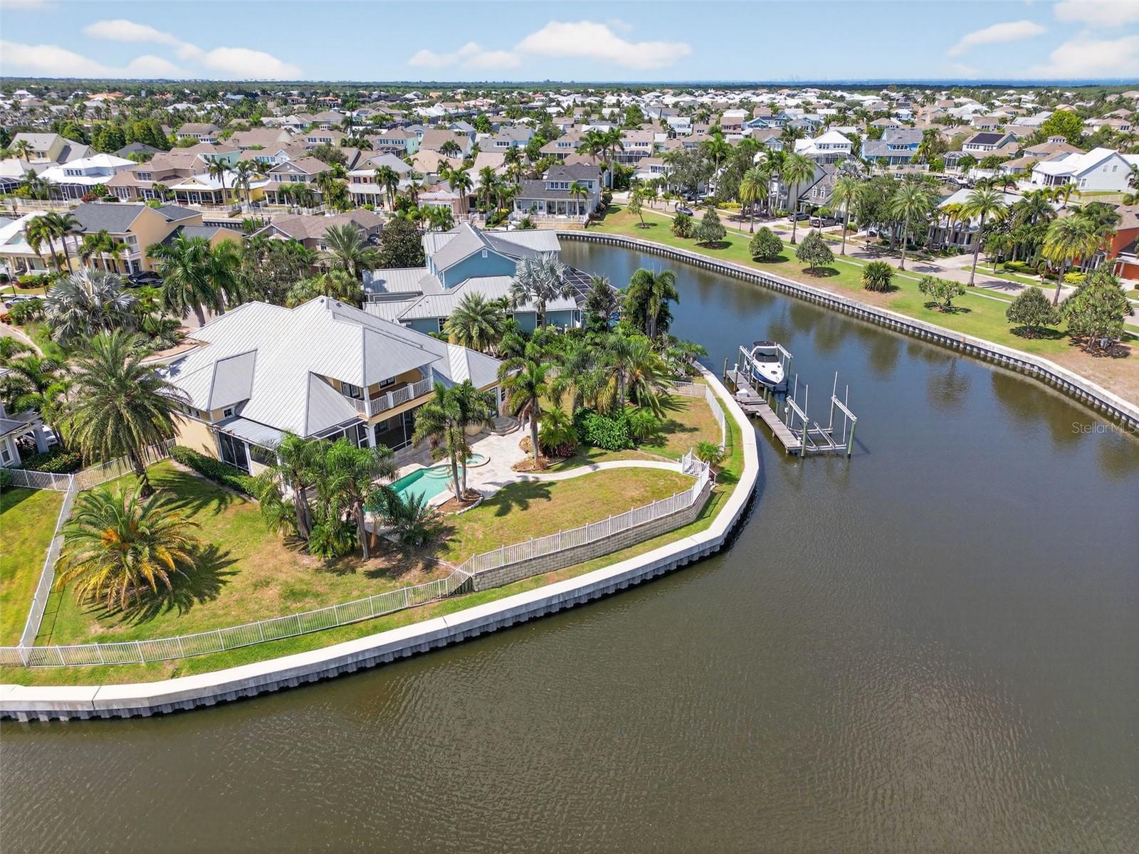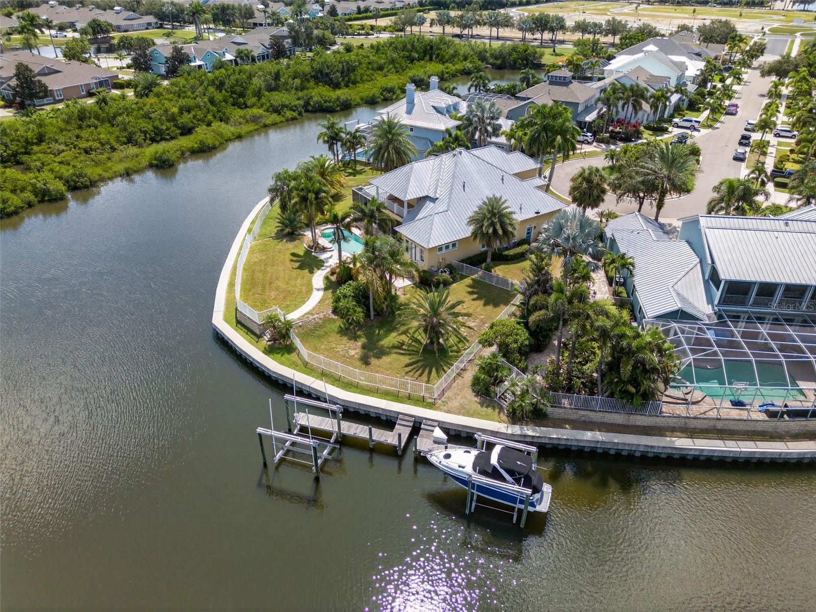 Welcome to your waterfront masterpiece in MiraBay! This custom 4-bedroom, 4-bath home sits on nearly half an acre, with 200 feet of saltwater canal frontage, a newly improved seawall, deeded dock, & boat lift — perfect for boating enthusiasts with unobstructed access to Tampa Bay. Step inside to over 3, 900 sq ft of thoughtfully designed living space with an open floor plan. Highlights include a formal dining room, den/office, large family room, loft/bonus room, and a gourmet kitchen with granite counters, high-end built-ins, pot filler over the range, and stainless appliances. The primary bedroom is conveniently on the main floor. Elegant touches like real wood and distressed tile flooring, crown molding, tray ceilings, French doors, built-in bookcases, and high ceilings throughout. Outdoors, a 43-ft screened lanai with travertine flooring, summer kitchen, and serene views of the pool, spa, and canal make this home entertainer’s dream. Relax in the heated gunite pool & spa, enjoy the covered patio or upstairs balcony. The property is southwest-facing, offering beautiful natural light and spectacular golden sunsets. Situated in the award-winning MiraBay community, you’ll enjoy exclusive amenities like a resort-style pool, lagoon marina, fitness center, cafe, tennis & pickleball courts, playgrounds, and more. Located just 30-45 minutes to both Tampa/St. Petersburg and Sarasota/Bradenton — a rare blend of luxury, lifestyle & location.