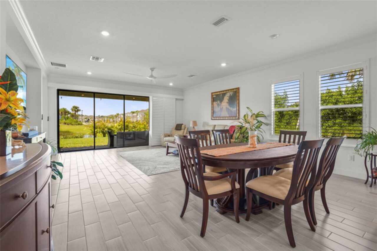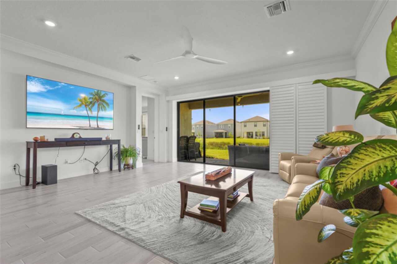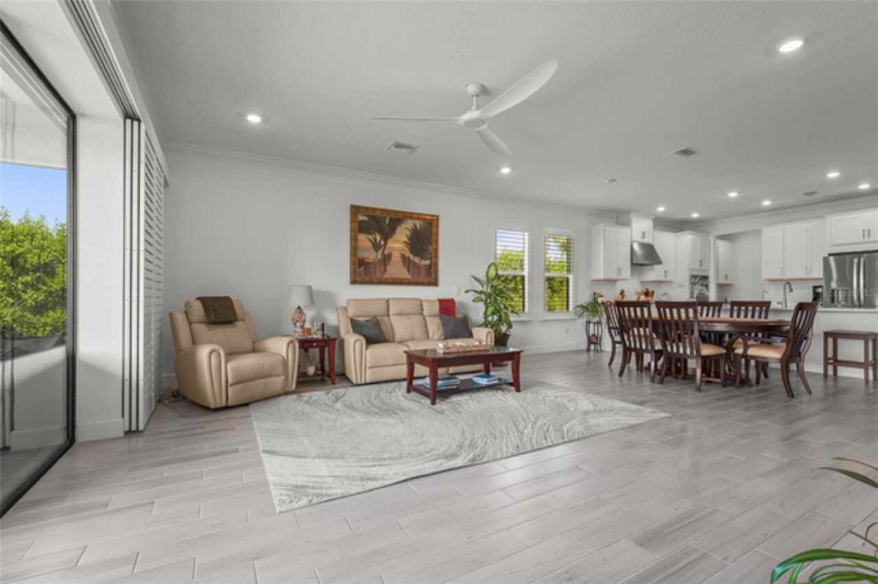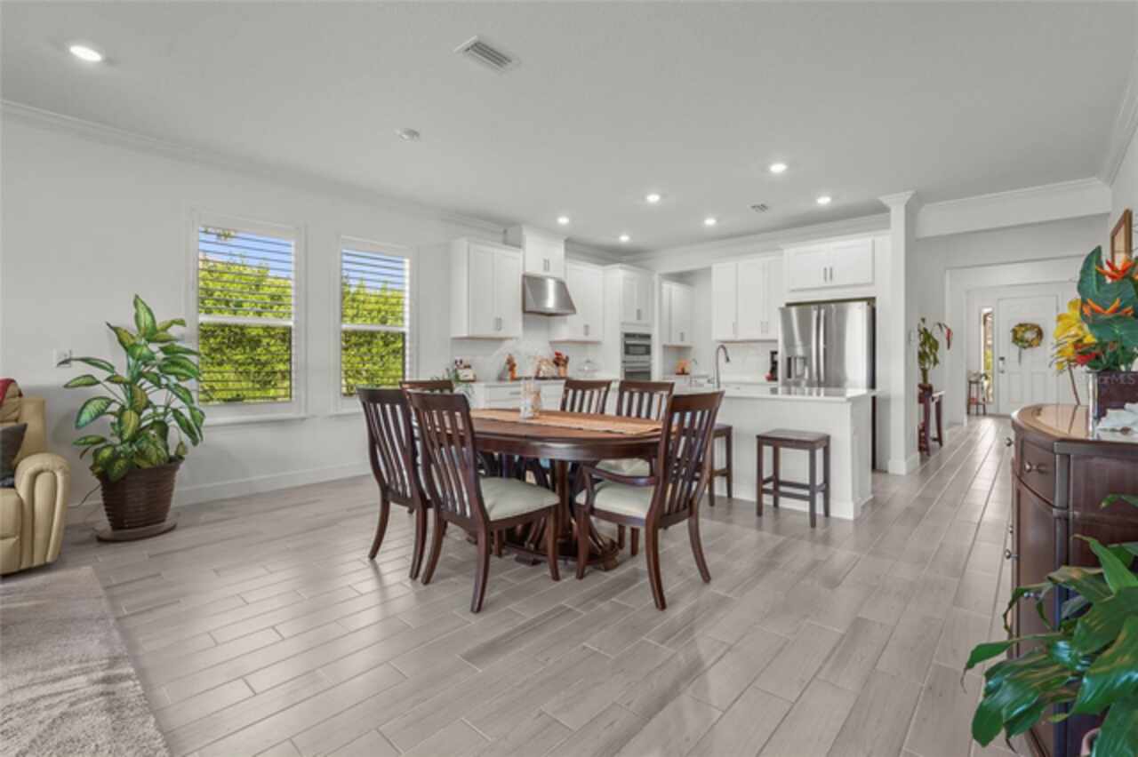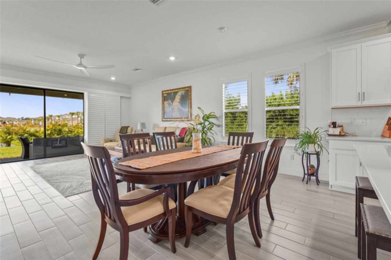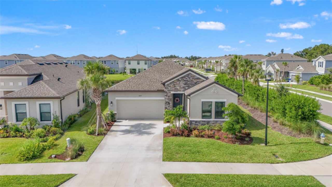 Discover this exquisite 2024 Taylor Morrison Antigua model masterpiece, where contemporary elegance meets thoughtful design in the prestigious Palmero Community. This stunning four-bedroom, three-bathroom home spans approximately 2, 411 square feet of meticulously crafted living space, showcasing the builder's renowned attention to detail and superior construction quality. Step inside to find sophisticated wood-grained tile flooring flowing seamlessly throughout the main living areas, creating an effortless transition between the open-concept kitchen, dining, and family spaces. The gourmet kitchen commands attention with premium stainless steel appliances, rich granite countertops, and custom cabinetry complemented by sleek hardware. A generous center island provides additional workspace and casual dining, while pendant lighting creates ambient warmth throughout the culinary haven. Sumptuous carpeting graces each bedroom sanctuary, where crown molding adds architectural distinction and carefully selected lighting fixtures illuminate these private retreats. The primary owner's suite serves as a luxurious haven, offering serene backyard vistas and an indulgent en-suite bathroom featuring an oversized soaking tub, expansive glass-enclosed shower with rainfall fixtures, dual vanities with elegant mirrors, and a generous walk-in closet with built-in organization systems. Three additional bedrooms showcase thoughtful design elements including recessed lighting and ample natural light, while two full guest bathrooms feature contemporary finishes and designer fixtures. The thoughtfully designed flex room awaits your personal touch – transform it into a distinguished home office with built-in shelving, cozy den with architectural details, or intimate library where literary adventures unfold. However, the true jewel lies outdoors beneath the covered lanai, where breathtaking pond views and professionally curated landscaping create an atmosphere of tranquil sophistication. The Palmero community elevates lifestyle with exceptional amenities including a heated pool, basketball court, dedicated dog park, volleyball court, and playground facilities. This exceptional residence represents the pinnacle of modern Florida living.