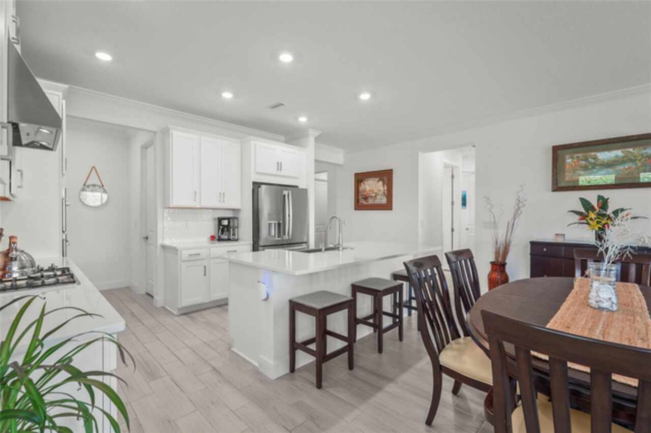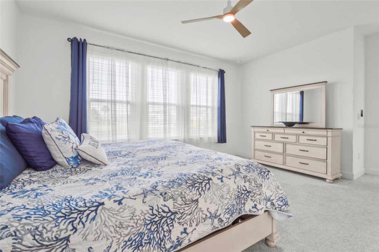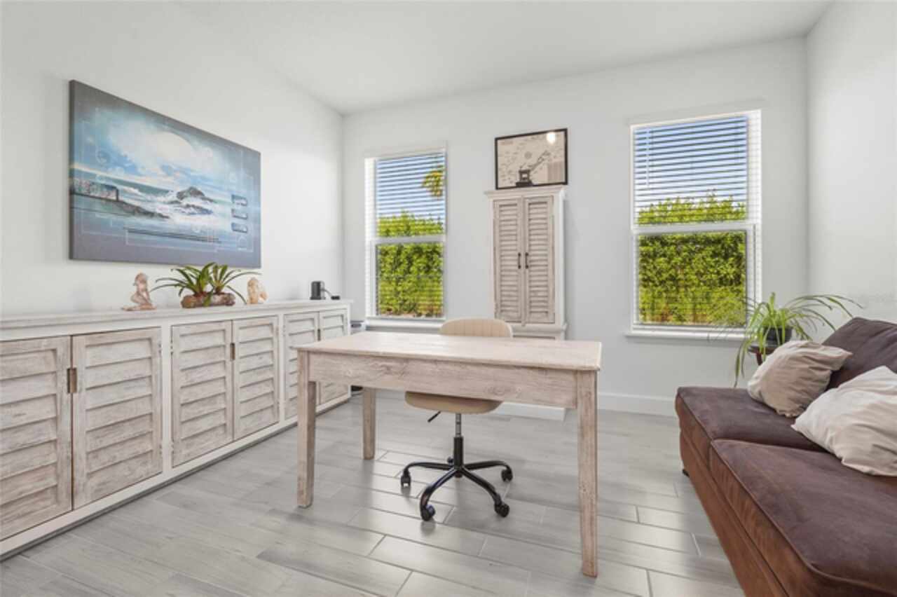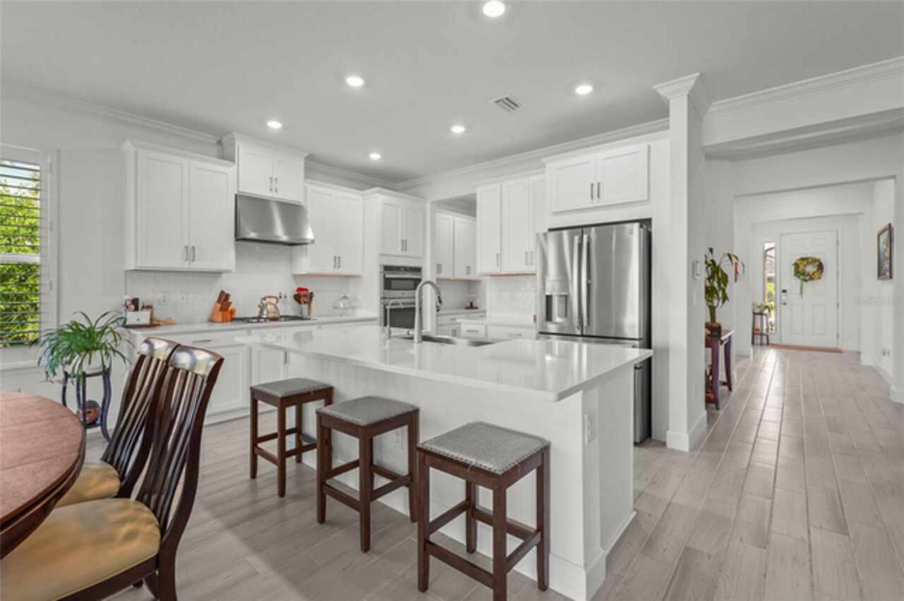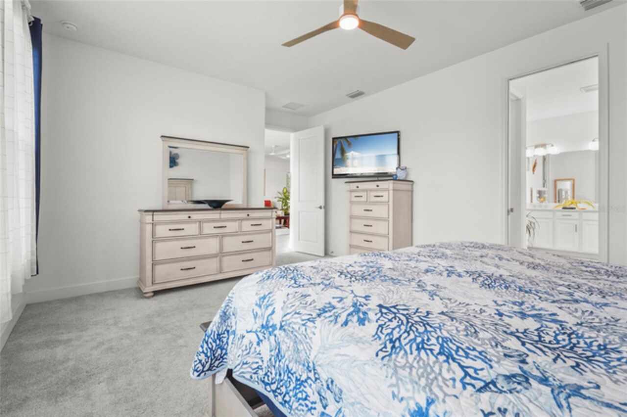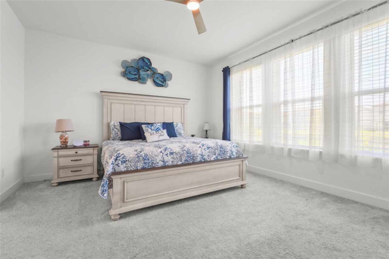 Discover this exquisite 2024 Taylor Morrison Antigua model masterpiece, where contemporary elegance meets thoughtful design in the prestigious Palmero Community. This stunning four-bedroom, three-bathroom home spans approximately 2, 411 square feet of meticulously crafted living space, showcasing the builder's renowned attention to detail and superior construction quality. Step inside to find sophisticated wood-grained tile flooring flowing seamlessly throughout the main living areas, creating an effortless transition between the open-concept kitchen, dining, and family spaces. The gourmet kitchen commands attention with premium stainless steel appliances, rich granite countertops, and custom cabinetry complemented by sleek hardware. A generous center island provides additional workspace and casual dining, while pendant lighting creates ambient warmth throughout the culinary haven. Sumptuous carpeting graces each bedroom sanctuary, where crown molding adds architectural distinction and carefully selected lighting fixtures illuminate these private retreats. The primary owner's suite serves as a luxurious haven, offering serene backyard vistas and an indulgent en-suite bathroom featuring an oversized soaking tub, expansive glass-enclosed shower with rainfall fixtures, dual vanities with elegant mirrors, and a generous walk-in closet with built-in organization systems. Three additional bedrooms showcase thoughtful design elements including recessed lighting and ample natural light, while two full guest bathrooms feature contemporary finishes and designer fixtures. The thoughtfully designed flex room awaits your personal touch – transform it into a distinguished home office with built-in shelving, cozy den with architectural details, or intimate library where literary adventures unfold. However, the true jewel lies outdoors beneath the covered lanai, where breathtaking pond views and professionally curated landscaping create an atmosphere of tranquil sophistication. The Palmero community elevates lifestyle with exceptional amenities including a heated pool, basketball court, dedicated dog park, volleyball court, and playground facilities. This exceptional residence represents the pinnacle of modern Florida living.
