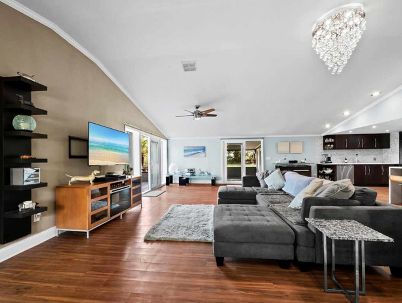 Cathedral Ceiling(s), Ceiling Fans(s), Coffered Ceiling(s), Crown Molding, Eat-in Kitchen, Kitchen/Family Room Combo, Open Floorplan, Primary Bedroom Main Floor, Vaulted Ceiling(s)