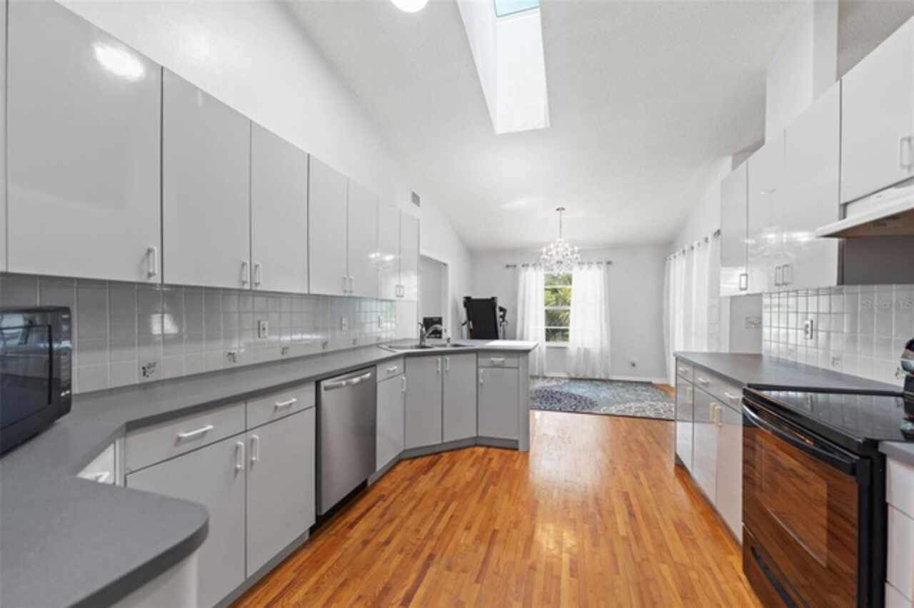Built-in Features, Cathedral Ceiling(s), Ceiling Fans(s), Eat-in Kitchen, High Ceilings, L Dining, Primary Bedroom Main Floor, Solid Surface Counters, Split Bedroom, Thermostat, Walk-In Closet(s)