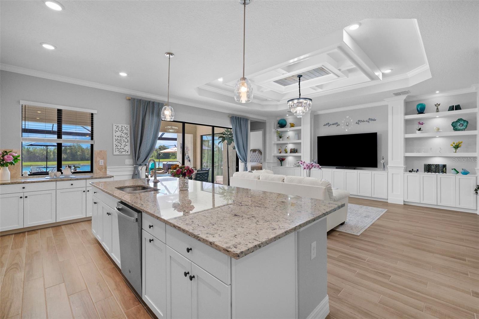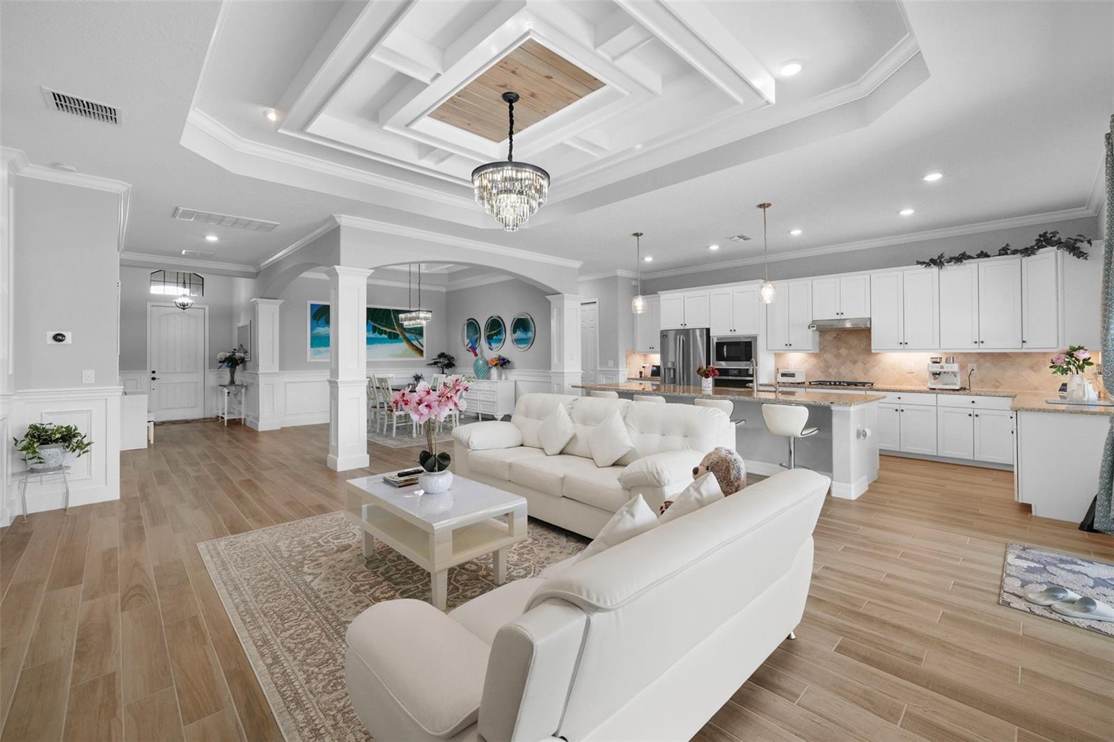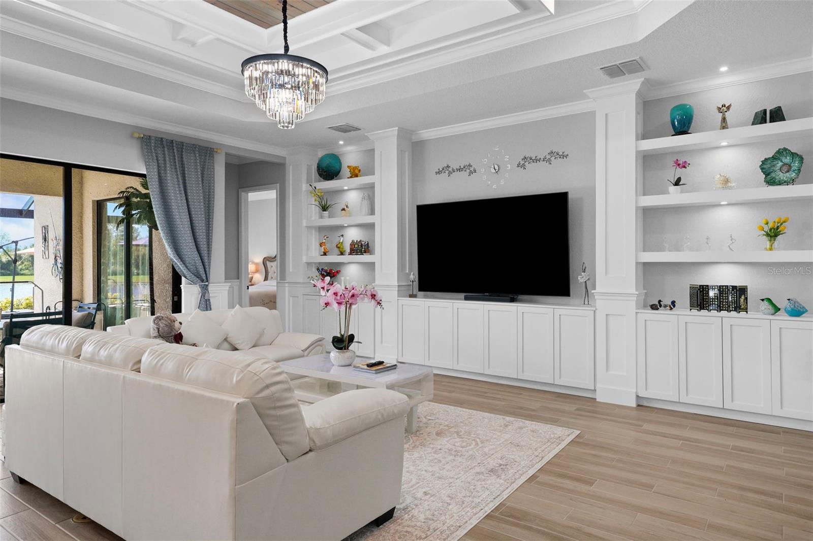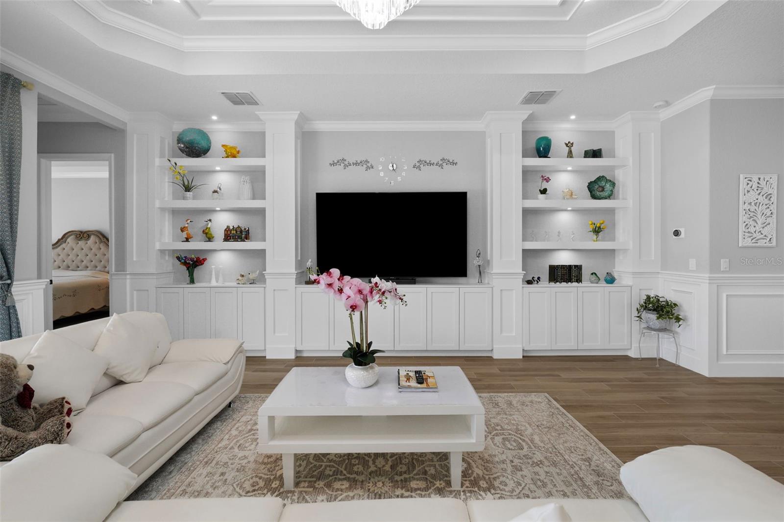 Built-in Features, Ceiling Fans(s), Coffered Ceiling(s), Crown Molding, High Ceilings, Kitchen/Family Room Combo, Open Floorplan, Primary Bedroom Main Floor, Solid Wood Cabinets, Split Bedroom, Stone Counters, Thermostat, Tray Ceiling(s), Walk-In Closet(s), Window Treatments