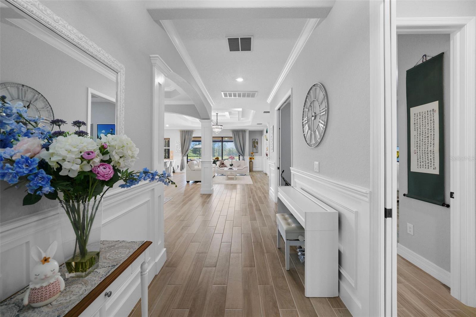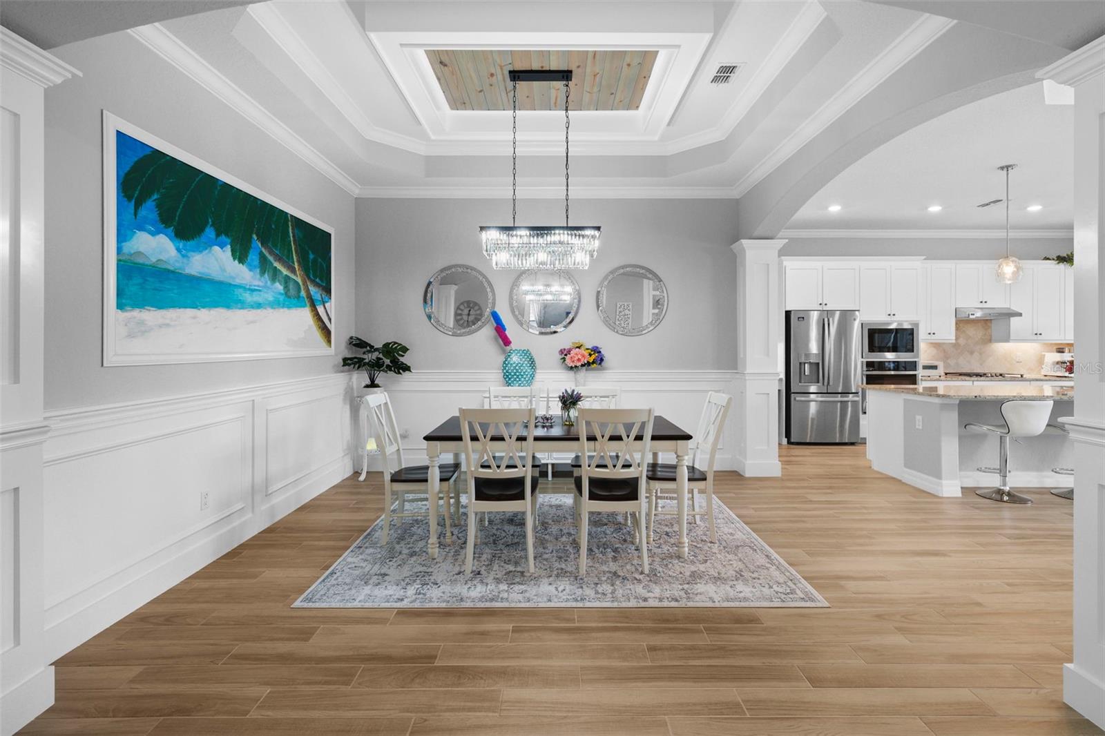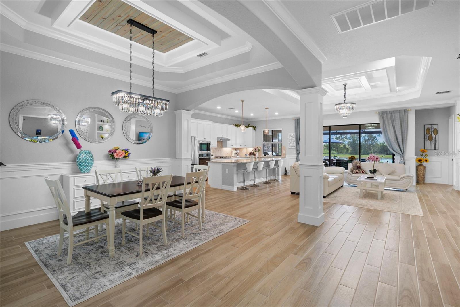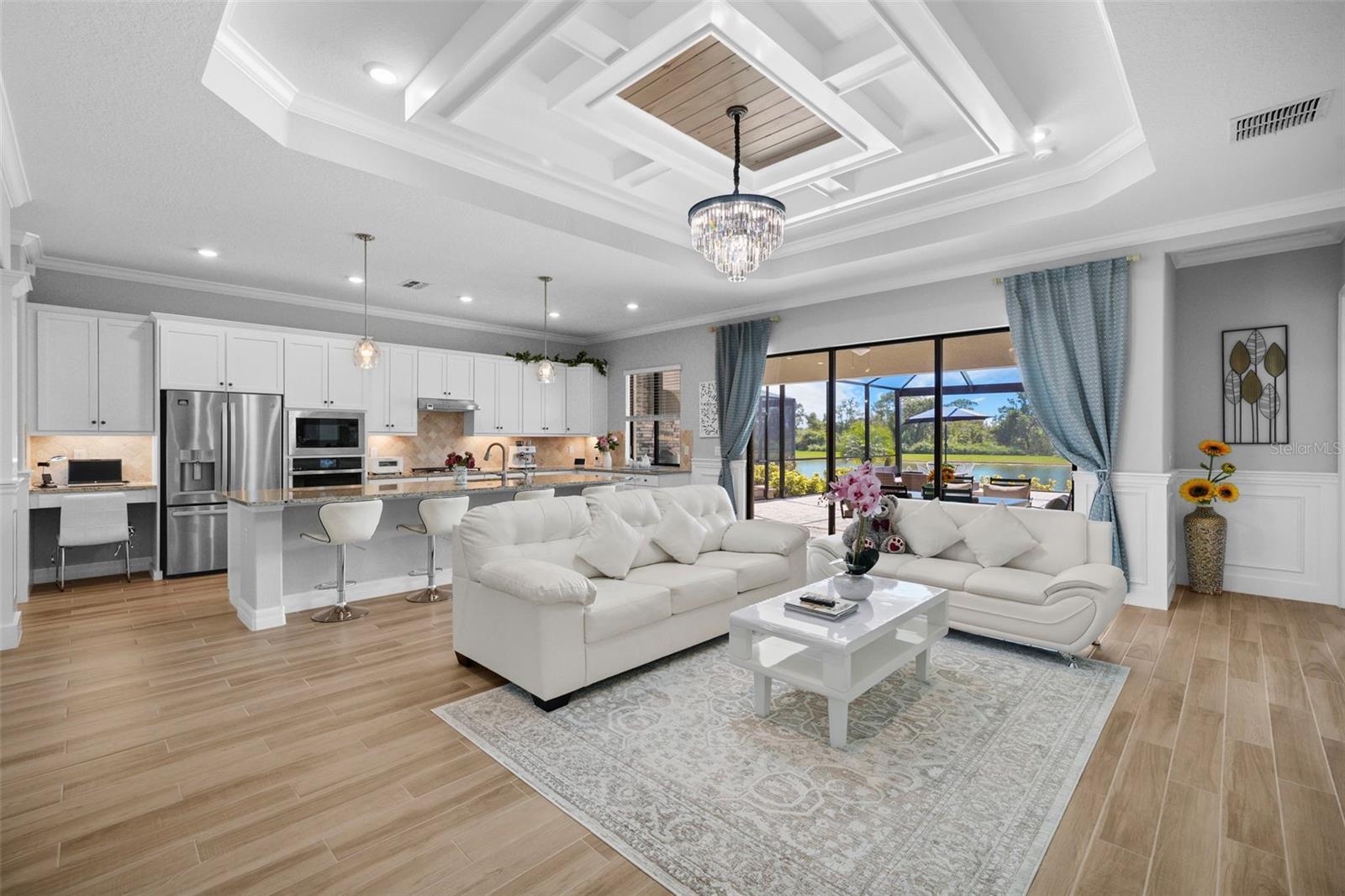 Built-in Features, Ceiling Fans(s), Coffered Ceiling(s), Crown Molding, High Ceilings, Kitchen/Family Room Combo, Open Floorplan, Primary Bedroom Main Floor, Solid Wood Cabinets, Split Bedroom, Stone Counters, Thermostat, Tray Ceiling(s), Walk-In Closet(s), Window Treatments