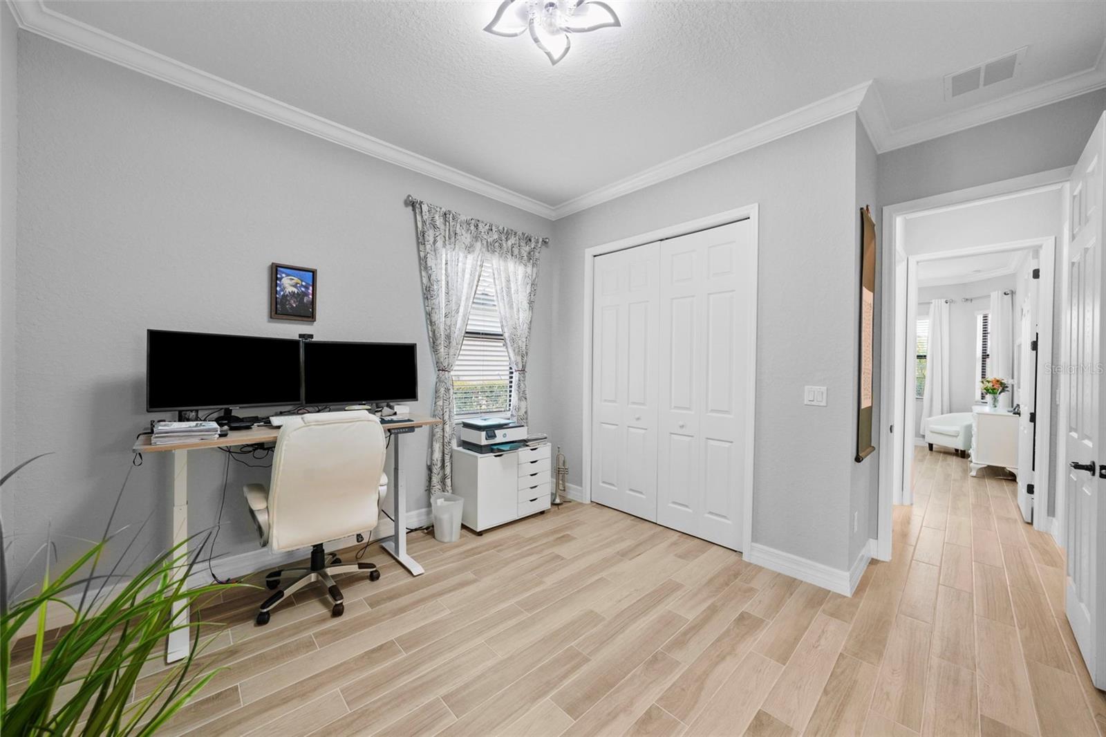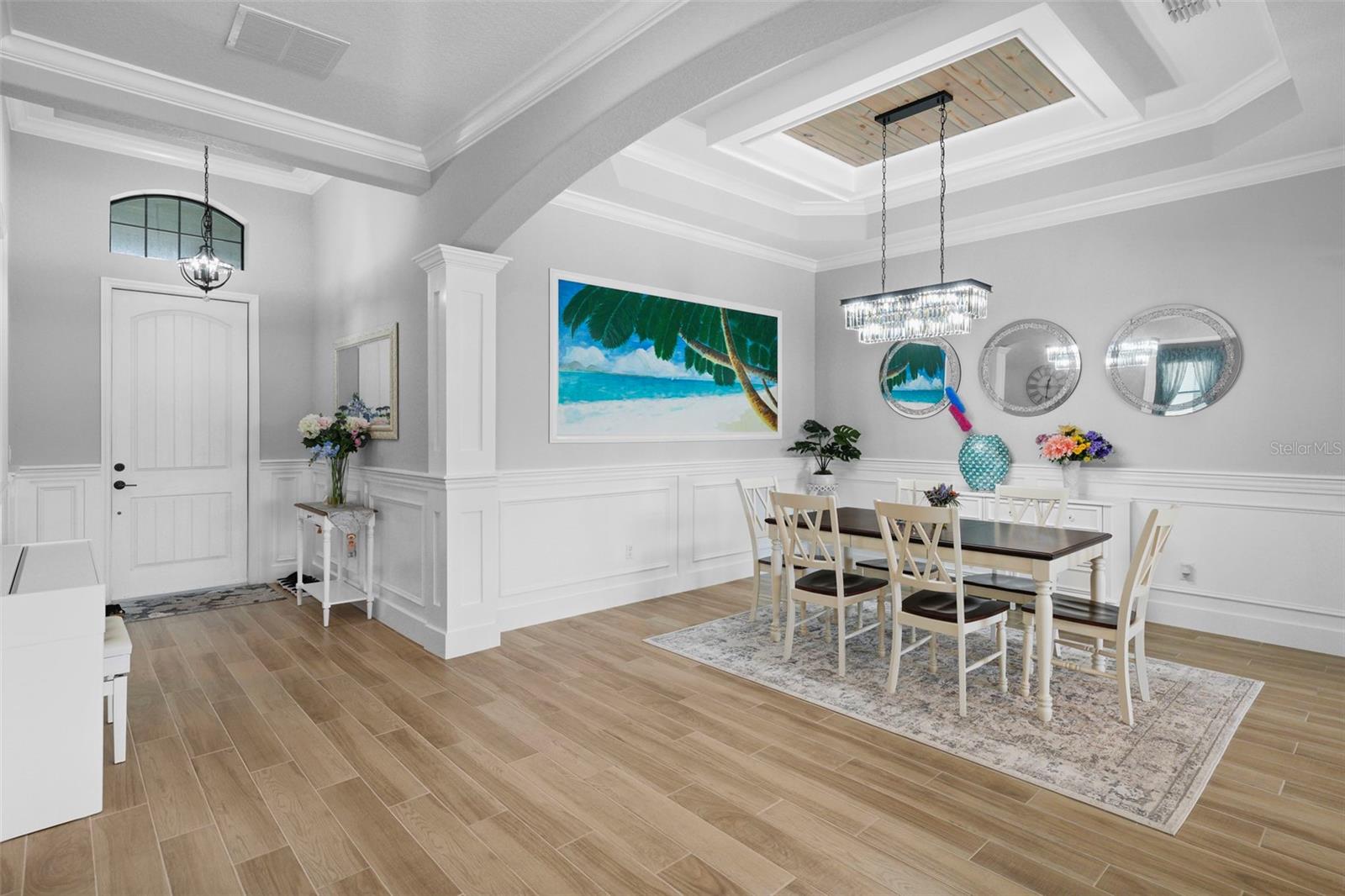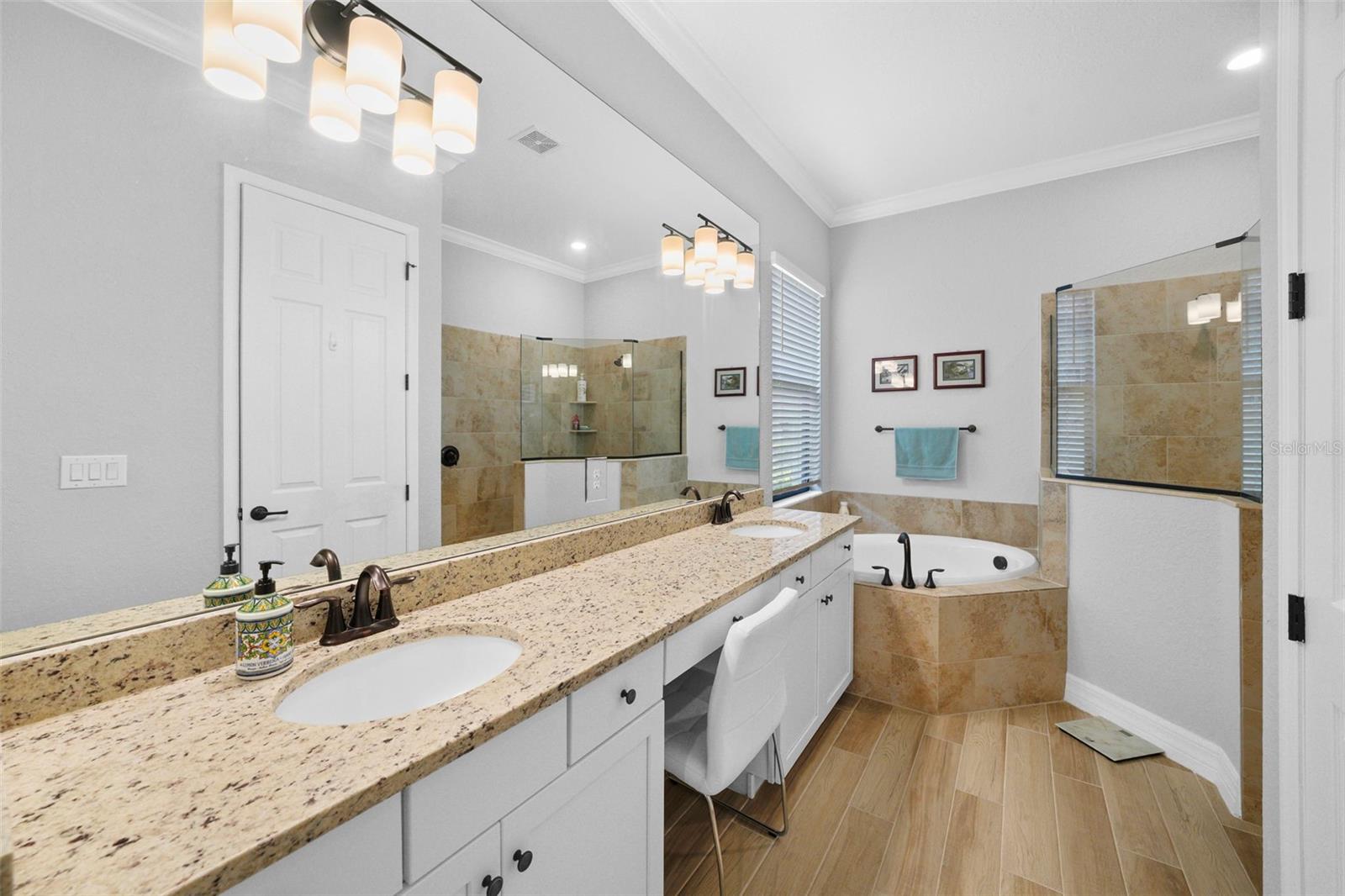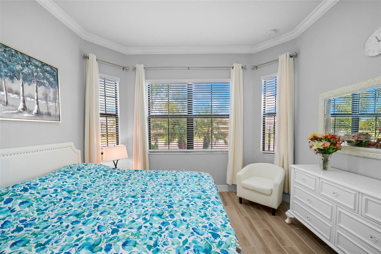 Built-in Features, Ceiling Fans(s), Coffered Ceiling(s), Crown Molding, High Ceilings, Kitchen/Family Room Combo, Open Floorplan, Primary Bedroom Main Floor, Solid Wood Cabinets, Split Bedroom, Stone Counters, Thermostat, Tray Ceiling(s), Walk-In Closet(s), Window Treatments