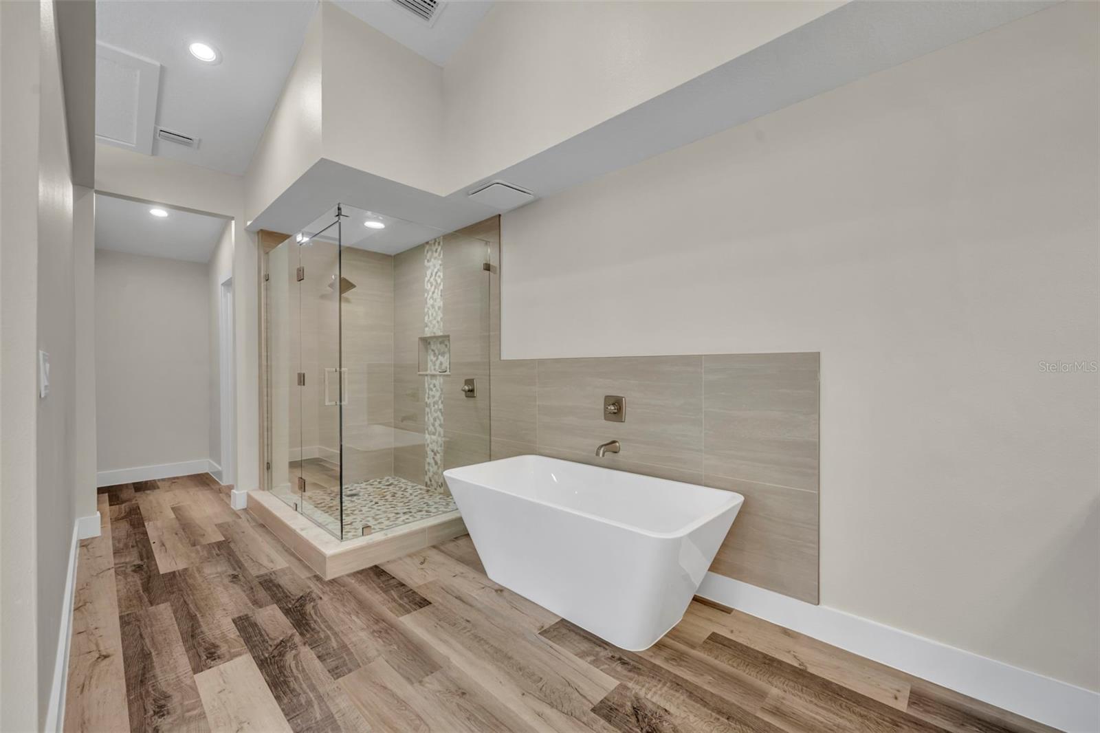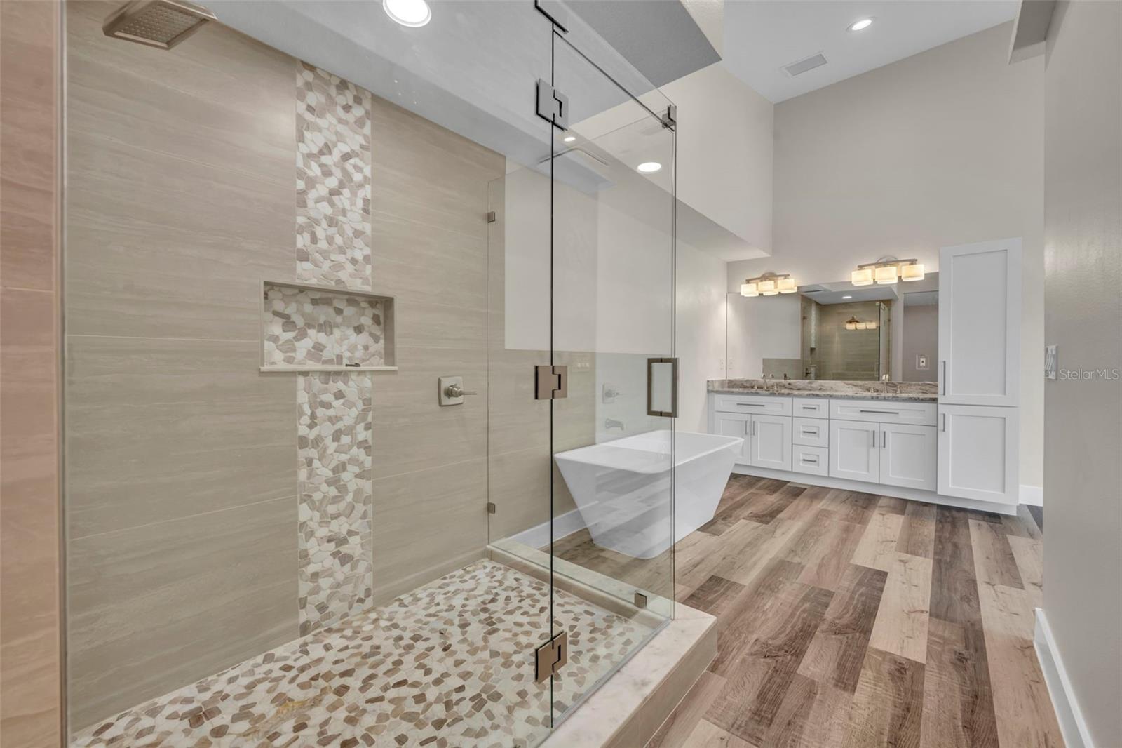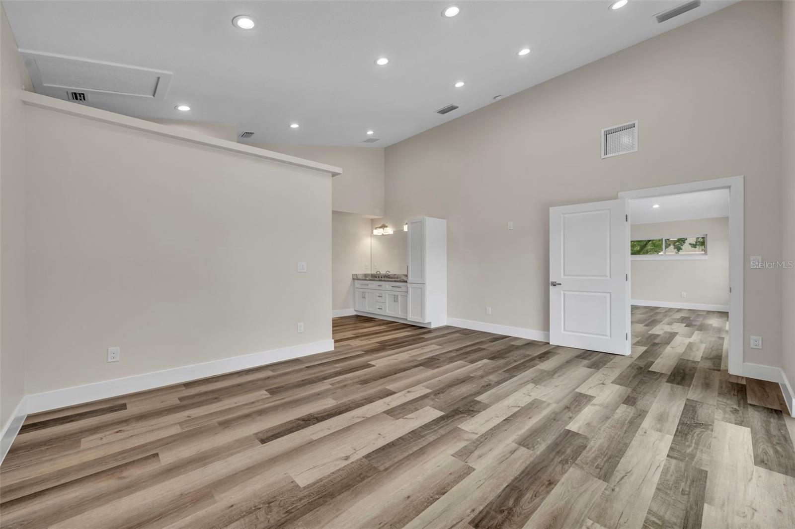 Ceiling Fans(s), Dry Bar, Eat-in Kitchen, High Ceilings, Kitchen/Family Room Combo, Open Floorplan, Primary Bedroom Main Floor, Solid Wood Cabinets, Split Bedroom, Stone Counters, Thermostat, Vaulted Ceiling(s), Walk-In Closet(s)