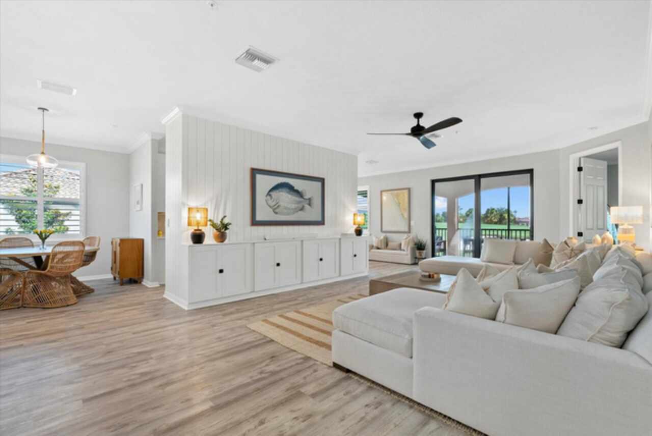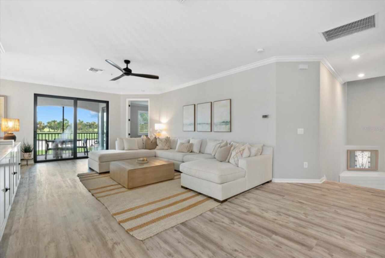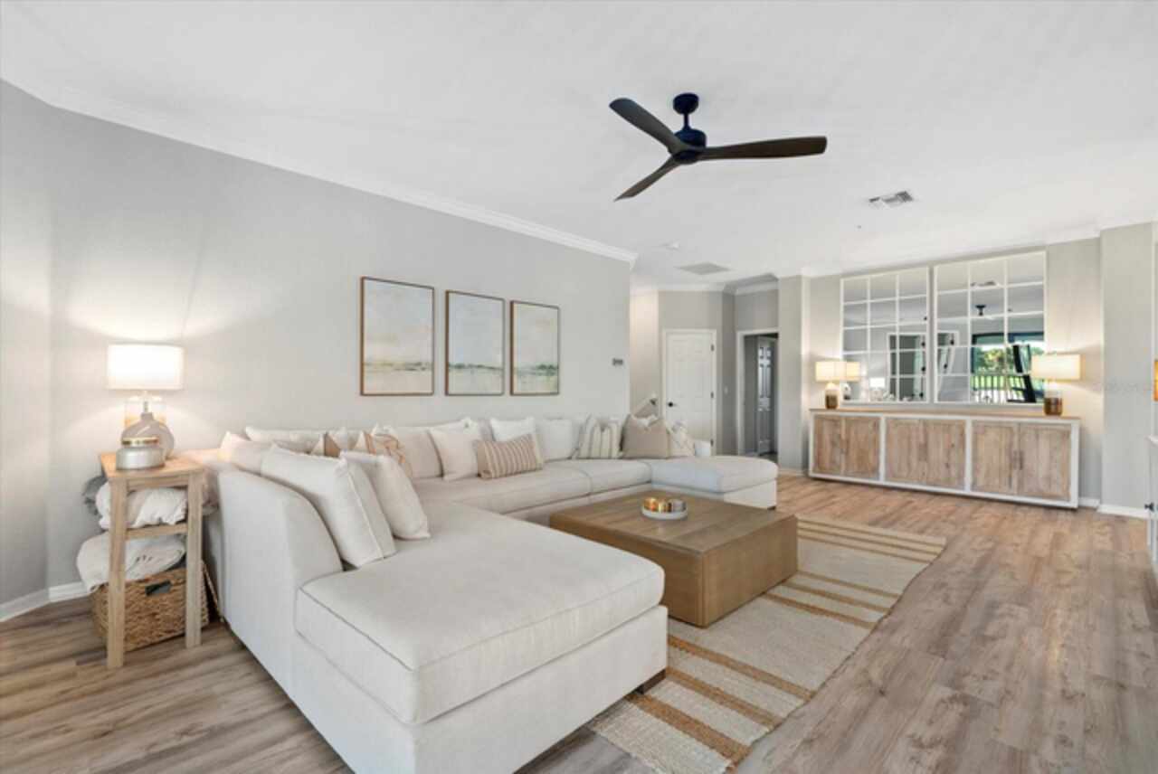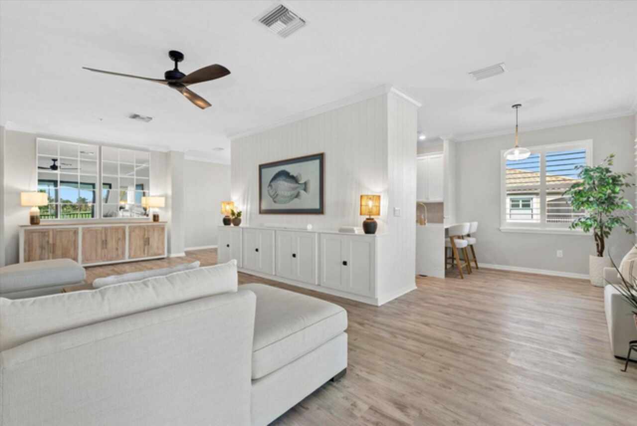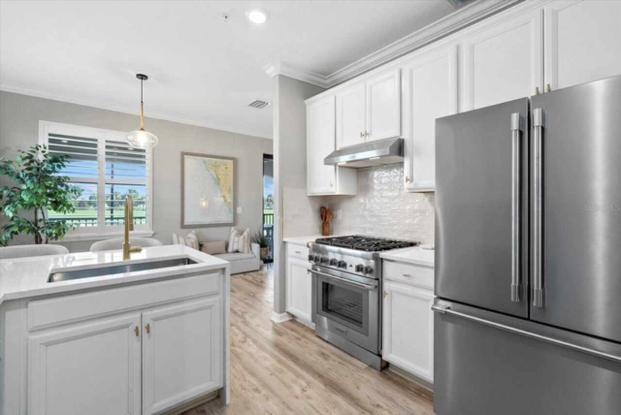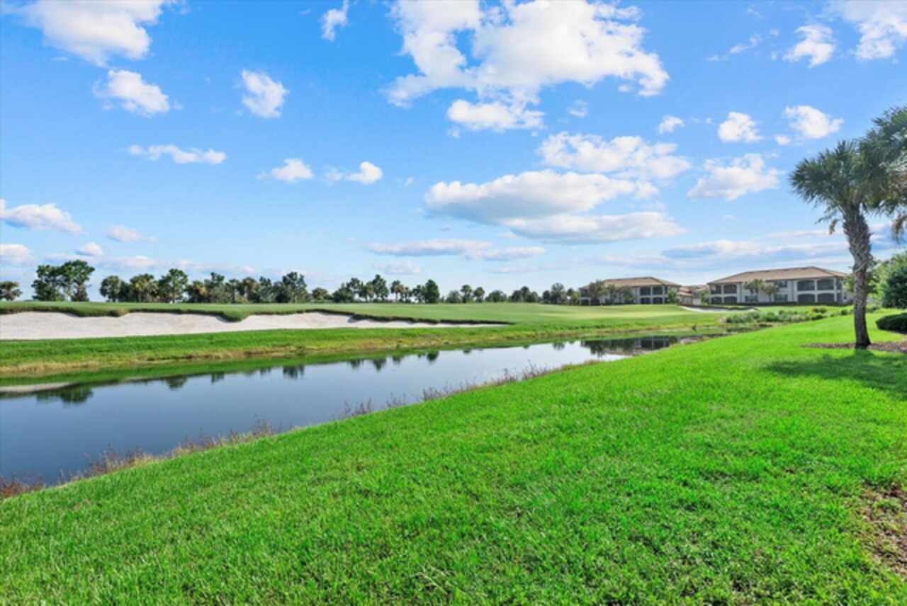 Enjoy luxury living in this beautifully renovated 3-bed, 2-bath home in the gated community of Lakewood National Golf Club. Perfectly positioned on the 18th hole of the Commander Course, this residence combines elegance with resort-style living. Recent upgrades include a renovated kitchen with Thermador range and new stainless appliances (2025), a complete second bathroom remodel, LVP flooring throughout, plantation shutters, and a custom TV wall in the living room. Additional highlights: upgraded washer/dryer, remodeled stairway and entry, and epoxy-coated garage floor with tandem space ideal for a golf cart or workshop. Residents enjoy access to two Arnold Palmer-designed golf courses, a resort pool with waterfalls and dining, a full-service spa, fitness center, tennis, pickleball, and a grand clubhouse with fine dining and social events. Whether full-time or seasonal, this home offers the perfect blend of comfort, style, and community.