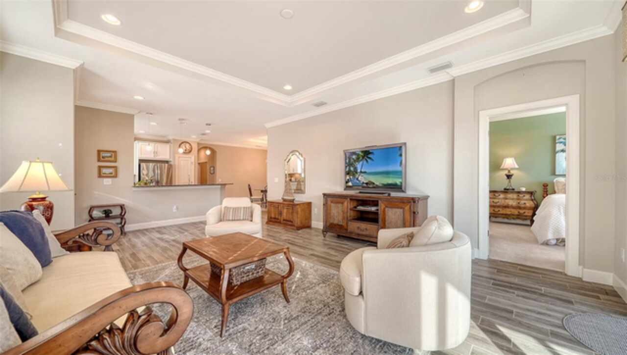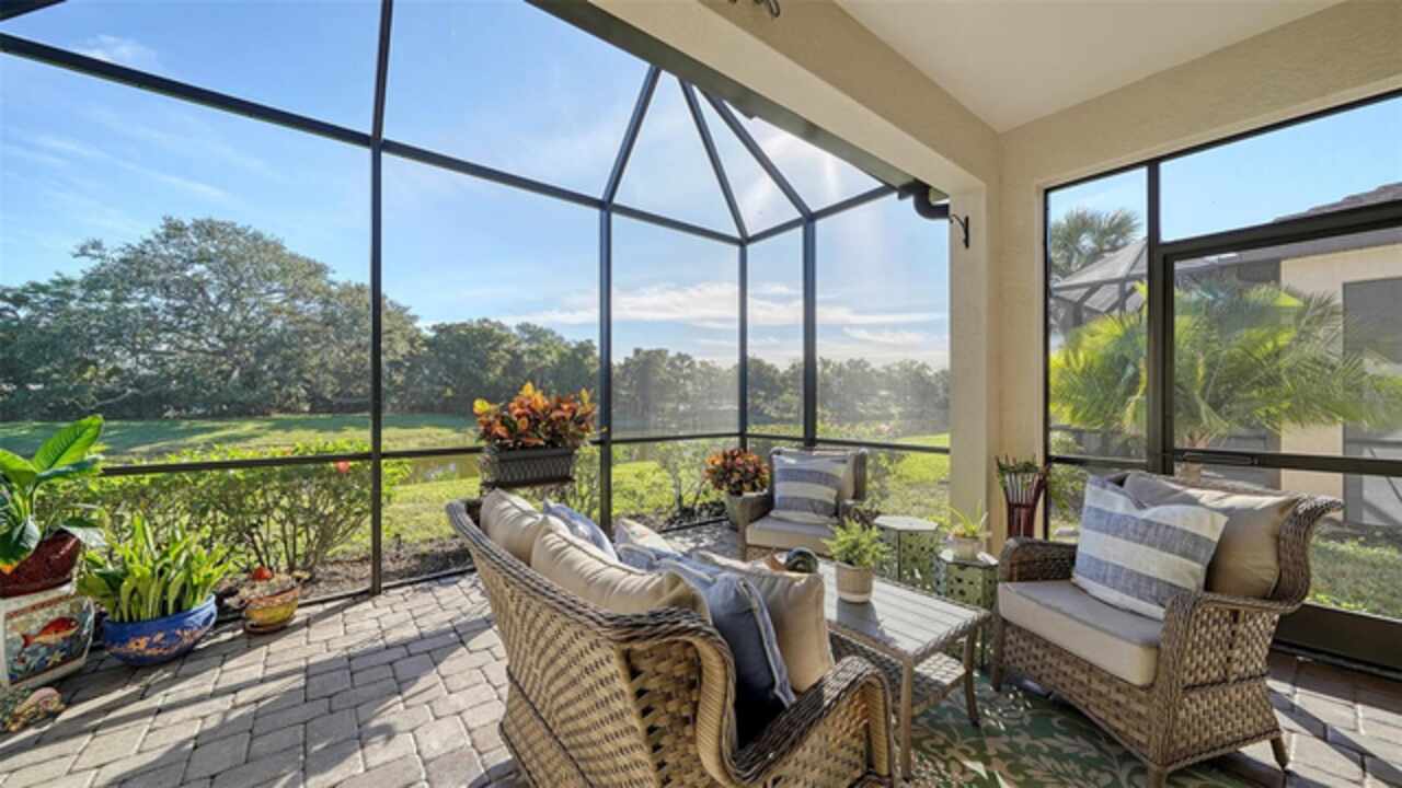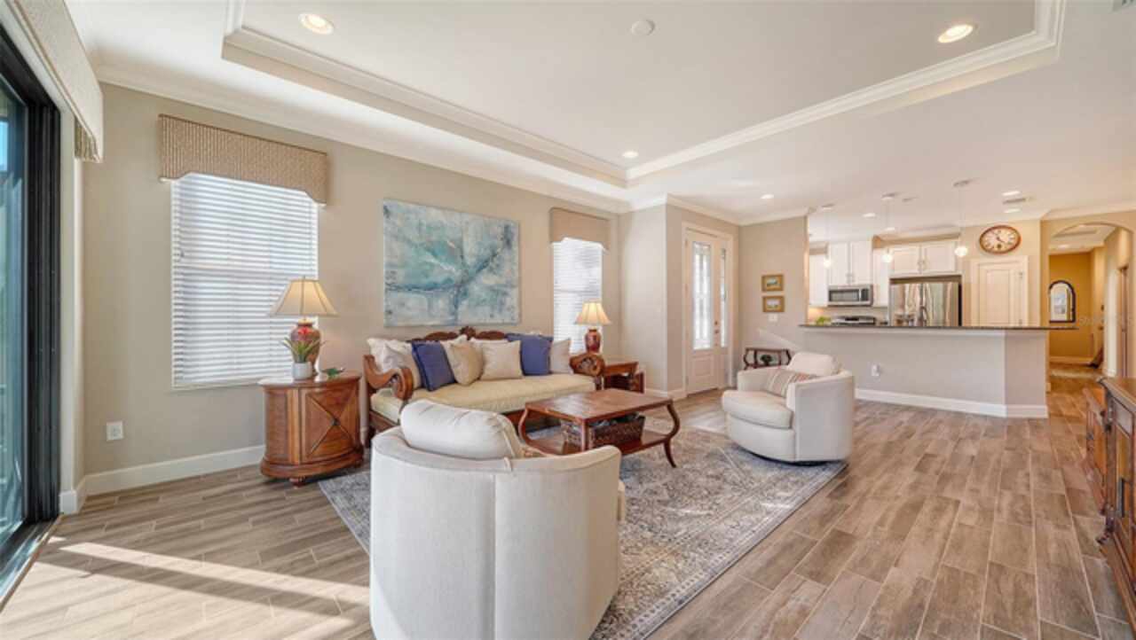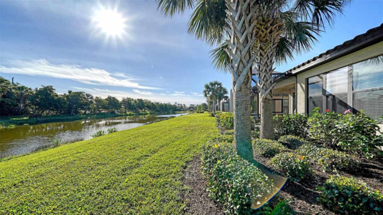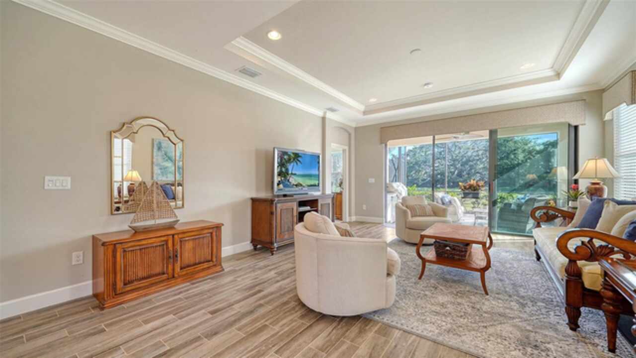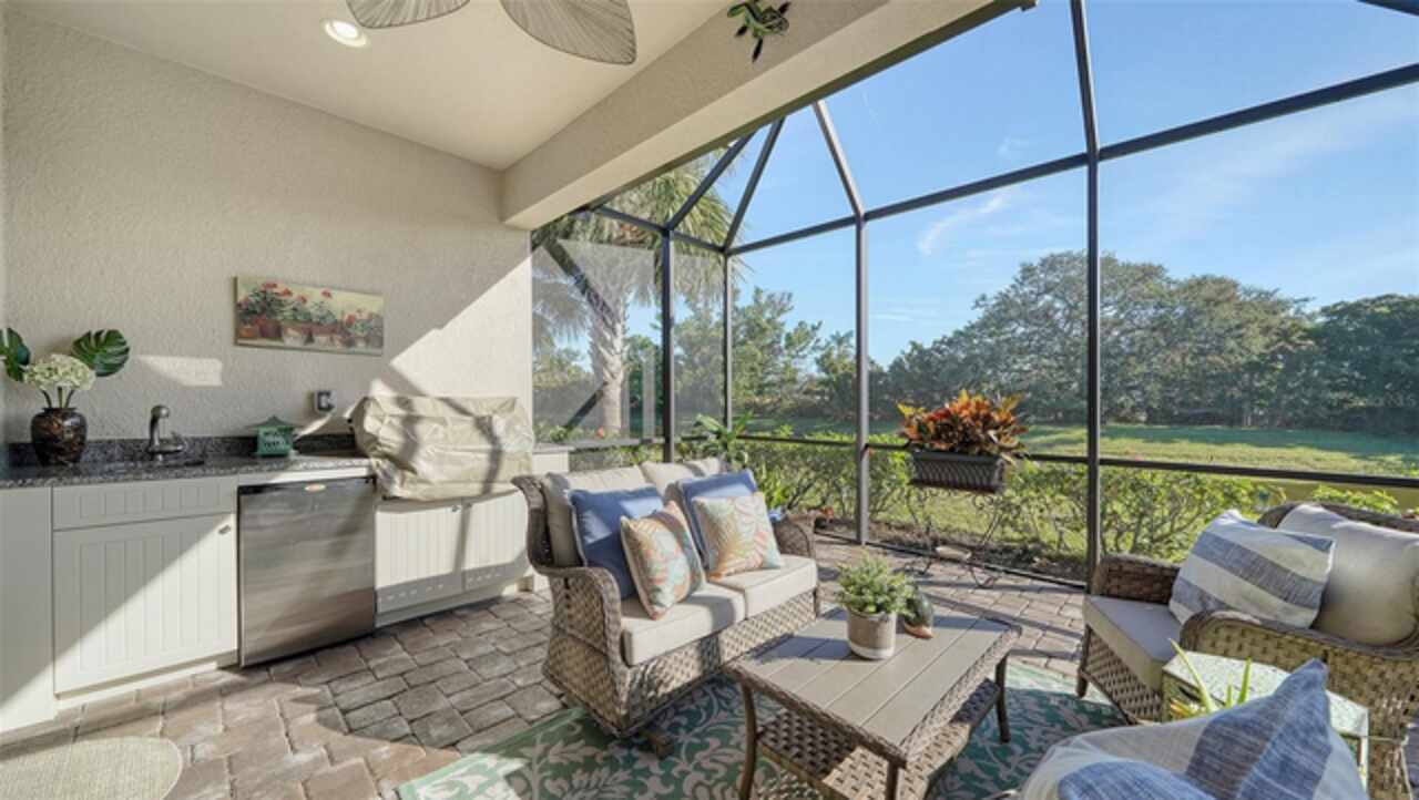 Minutes to world-famous SIESTA KEY BEACH. Discover relaxed, resort-style living in this beautifully maintained 3-bedroom + den residence with tranquil lake and tree-lined views. Offering nearly 1, 900 sq. ft., this home is tucked within a gated, maintenance-free community and the perfect set of amenities. Elegant details abound—tray ceilings, crown molding, recessed lighting, and porcelain plank tile flooring throughout. A new A/C (2024) ensures year-round comfort. The open great room flows seamlessly to the extended screened lanai, designed for easy entertaining with a fully equipped outdoor kitchen featuring a built-in BBQ, sink, and mini fridge. Wake up to peaceful water views from the primary suite, complete with a generous walk-in closet, dual vanities, a walk-in shower with bench, and a private water closet. A versatile den with pocket doors is perfect for a home office, media room, or additional guest space. The split-bedroom layout offers ideal privacy for family or guests. Esplanade by Siesta Key delivers a true resort lifestyle with a clubhouse, heated zero-entry pool and spa, fitness center, tennis and pickleball courts, bocce ball, and dog park. HOA fees include exterior maintenance, landscaping, and roof care, plus the benefit of an on-site manager and lifestyle coordinator. Immaculate condition, ideal location, and furnishings available separately—this is the total package.