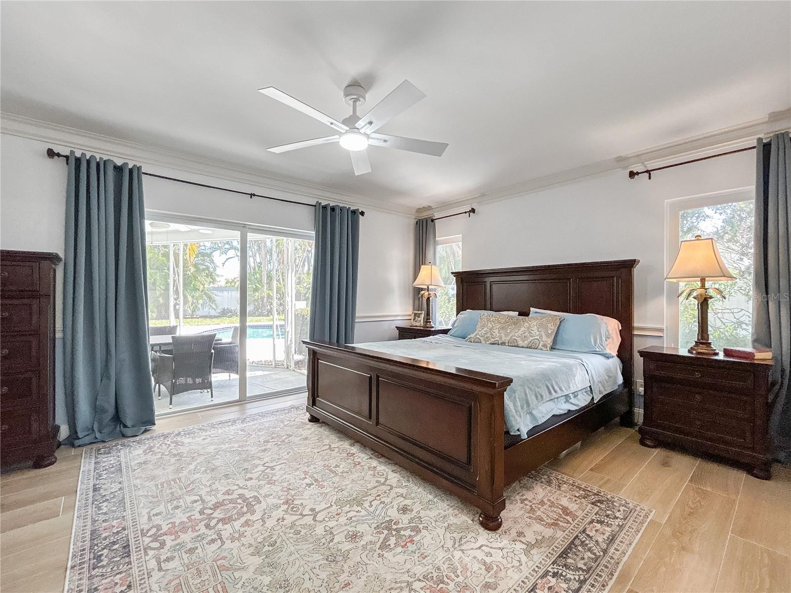 Built-in Features, Ceiling Fans(s), Crown Molding, Dry Bar, Eat-in Kitchen, High Ceilings, Kitchen/Family Room Combo, Open Floorplan, Primary Bedroom Main Floor, Solid Wood Cabinets, Stone Counters, Thermostat, Walk-In Closet(s)