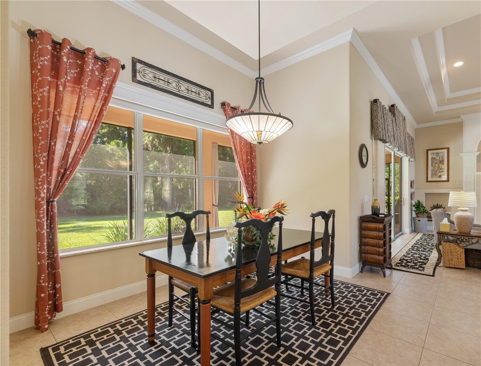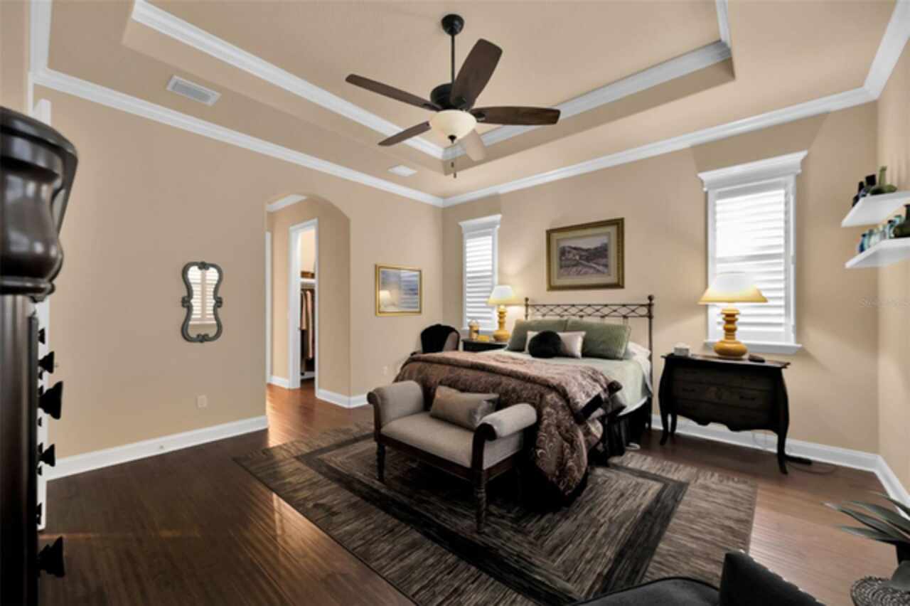 Built-in Features, Ceiling Fans(s), Coffered Ceiling(s), Crown Molding, Eat-in Kitchen, High Ceilings, Primary Bedroom Main Floor, Solid Surface Counters, Solid Wood Cabinets, Split Bedroom, Stone Counters, Thermostat, Tray Ceiling(s), Walk-In Closet(s), Window Treatments