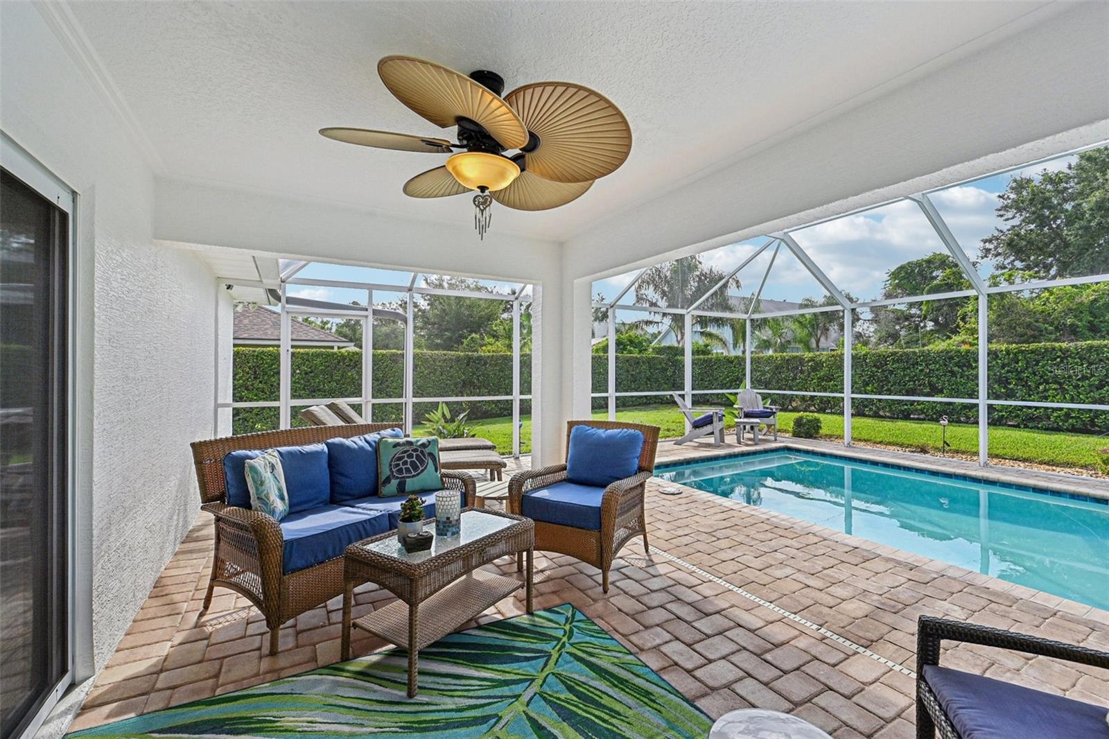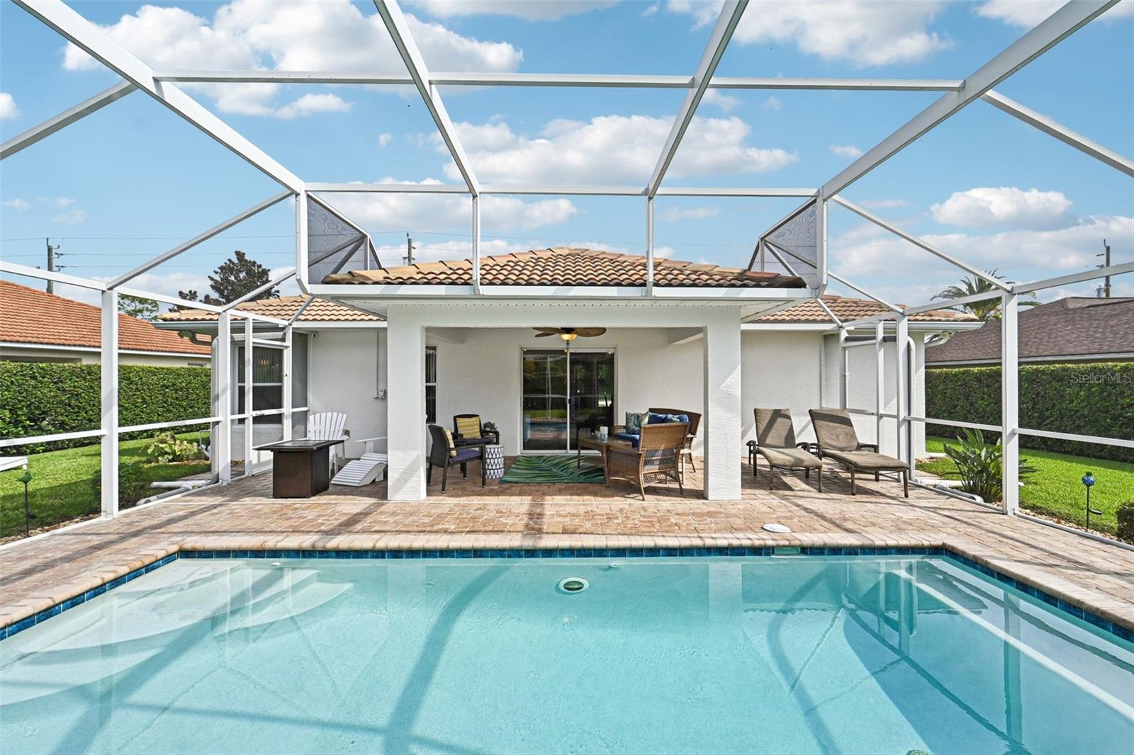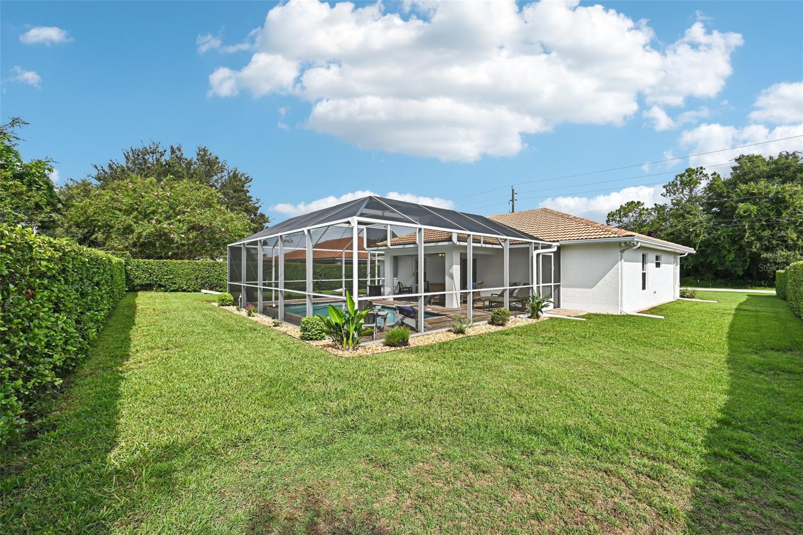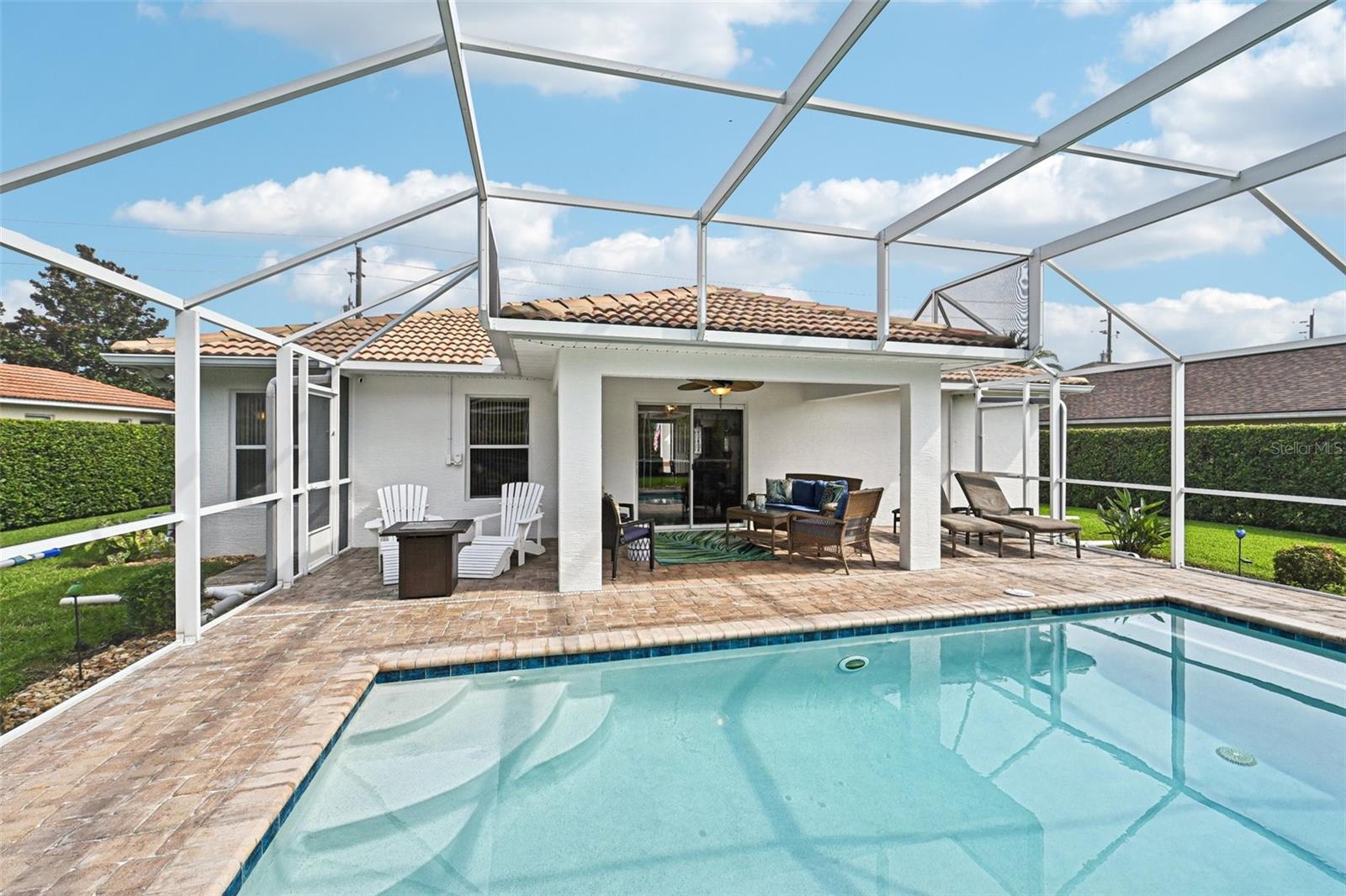 Meticulously maintained 3-bedroom, 2-bath pool home built in 2004. This open floor plan offers a spacious living area, dining space, and kitchen with plenty of cabinetry and views of the pool. The owner's suite features a private bath and custom built closet. Two additional bedrooms are ideal for family, guests, or office use. Enjoy the screened lanai with inground pool and beautifully landscaped backyard with irrigation on well. The oversized garage includes a screen, and the home is equipped with a new AC system (2021), water heater (2025), and electrical hookup for a generator. Pride of ownership shows inside and out. Close to parks, schools, shopping, dining, and just a short drive to the beach.