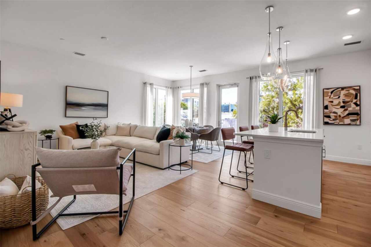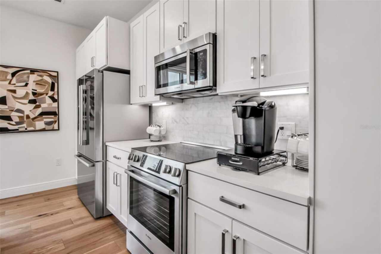 Is understated elegance, with high quality craftsmanship, attention to detail, more your style & vibe? Castille Urbana is elegant downtown St Pete condo living at its best! CASTILLE URBANA consists of 40 residences, with THE lowest HOA of new construction condos in downtown St Pete AND is pet friendly. This TOP floor GARDENA unit 505 on the 5th floor provides a spacious, split 3 bedroom/3 bath floorplan with an open concept. The main living space is bathed in natural sunlight flowing from the expansive 8' Low-E impact resistant, hurricane-rated windows. The soaring 9' ceilings enhance your already spacious living space and storage space abounds throughout the condo. This beautiful condo features a full complement of designer-inspired features and finishes, including engineered hardwood flooring throughout, gourmet chef's kitchen that features premium Bosch stainless steel appliances, quartz countertops, solid wood cabinets, under-cabinet lighting and artisan, custom designed, blown glass pendants over the center island. You get to end everyday with the magic of stunning sunsets from inside your condo or out on your balcony. Your low monthly association fee of $395 also offers you a comfortable community room and fitness area. A dog washing station and fenced pet relief area (especially nice during our tropical rains). There is a communal outdoor patio where you can gather with family, friends and make new friends. The gated, covered garage area not only has space for your car but also several bike racks to safely park your bike. The location puts you in the heart of vibrant downtown St Pete. You are within walking and biking distance of a plethora of dining, coffee shops, wine, beer and whiskey bars. Downtown offers you world class museums, music, art, shopping, parks, the Pier & waterfront trails. BONUS: Castille Urbana is NOT in a flood zone....Be sure to schedule your private showing today as only a few units are left......Interior pictures are from the staged model unit....All units are empty