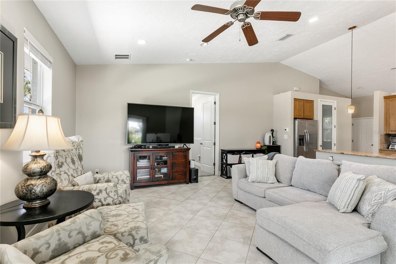 Attic Ventilator, Cathedral Ceiling(s), Ceiling Fans(s), High Ceilings, Kitchen/Family Room Combo, Open Floorplan, Primary Bedroom Main Floor, Solid Wood Cabinets, Thermostat, Vaulted Ceiling(s), Window Treatments
