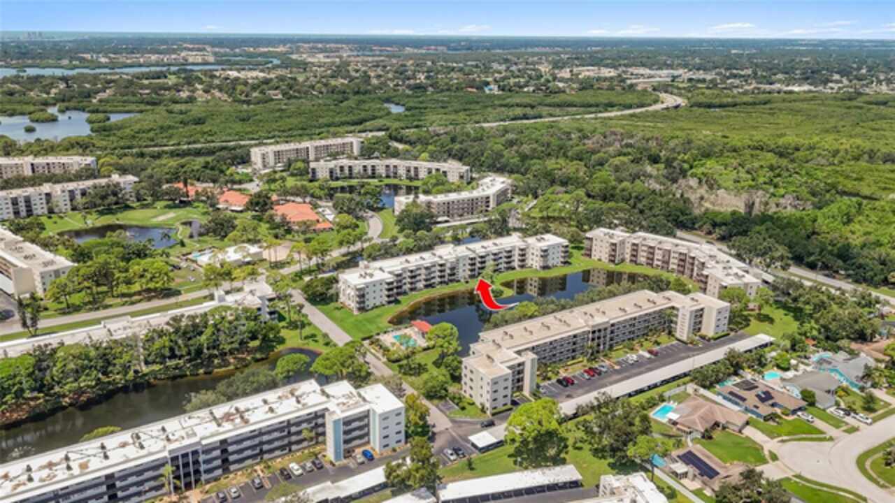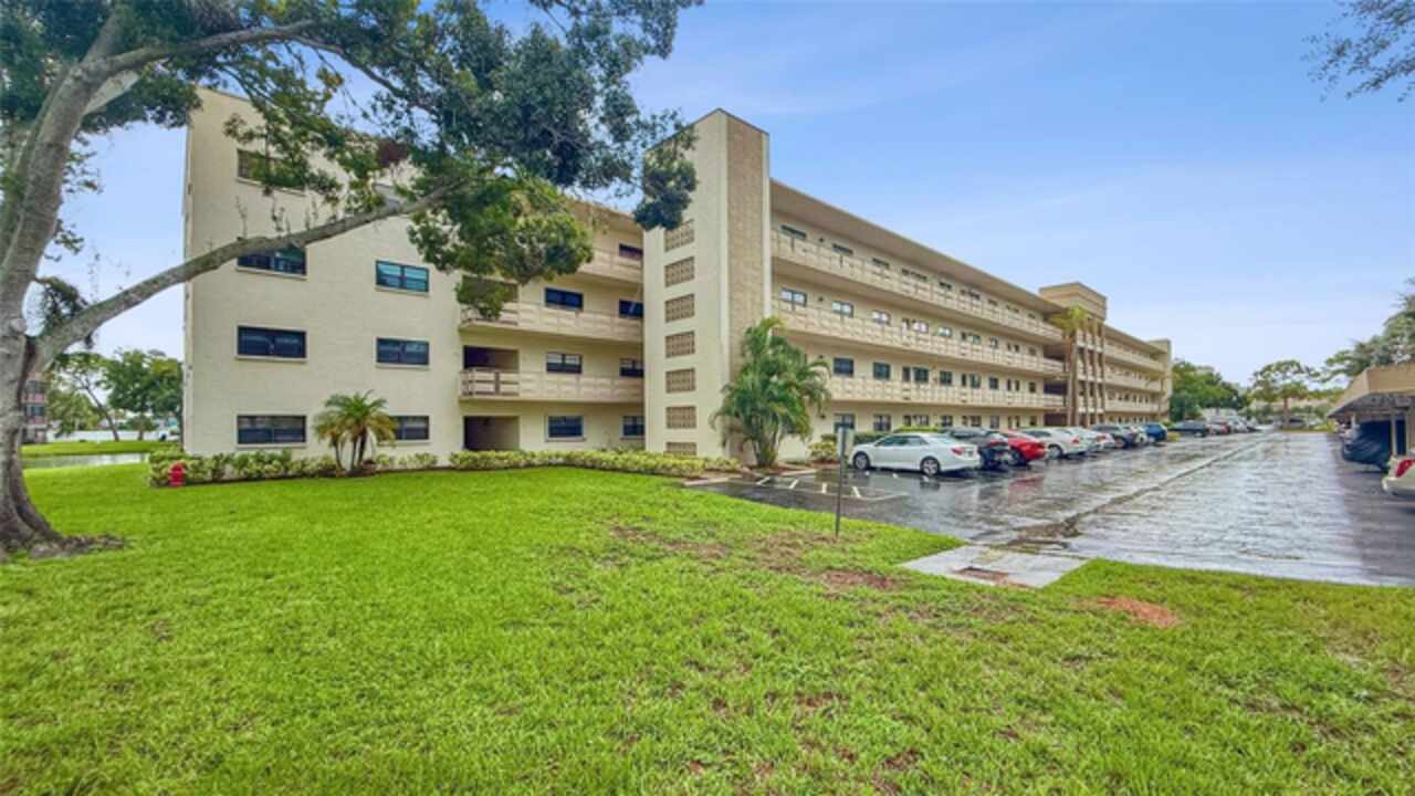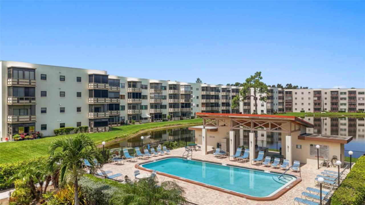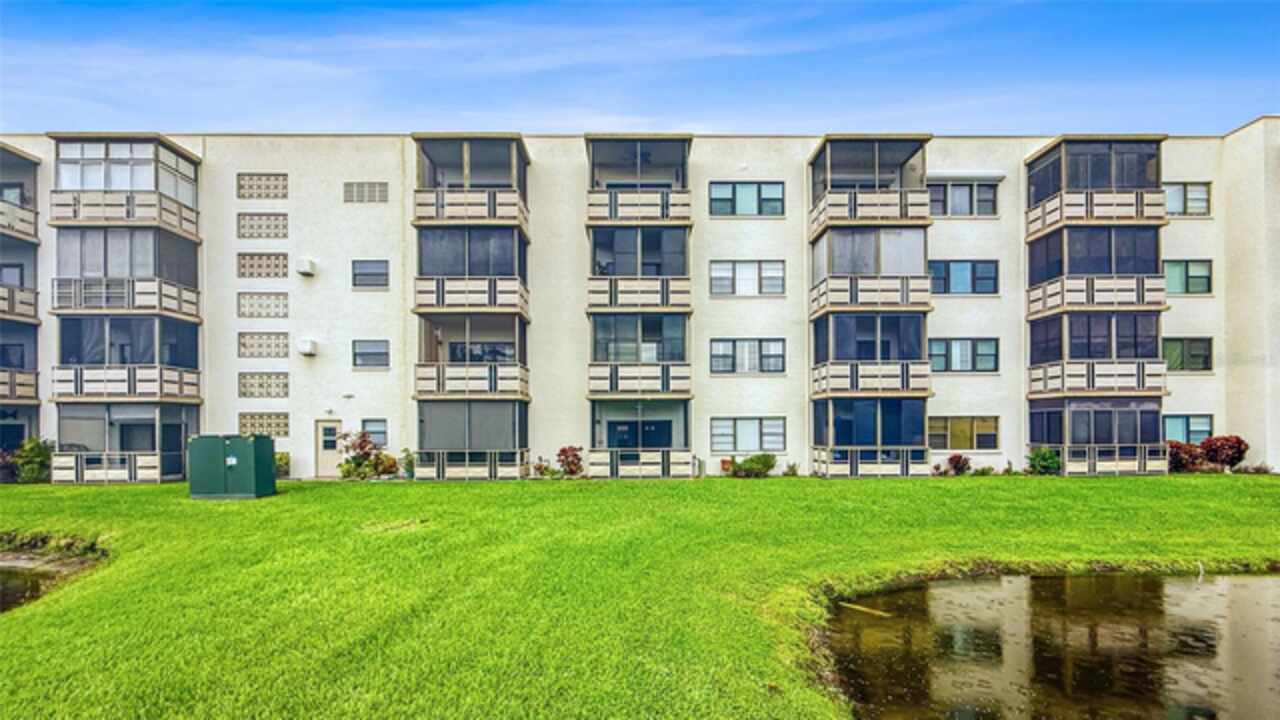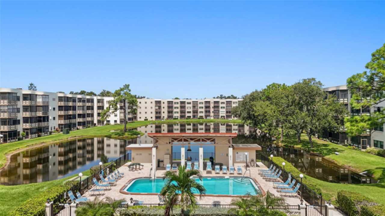 One or more photo(s) has been virtually staged. Sellers said bring an offer!! Discover comfort and convenience in this beautifully maintained first-floor condo, offering 2 bedrooms, 2 bathrooms, and serene pond views in the sought-after 55+ community of Five Towns. This move-in ready home is in a building with a new roof for added peace of mind. Inside, the owner’s suite offers plenty of storage with three closets and an ensuite bath with a walk-in shower. The second bedroom and full bath are perfect for guests or a flexible home office. The kitchen features a brand-new dishwasher and a gas stove, while the open living/dining area is filled with natural light. A sliding glass door leads to your screened lanai with tranquil pond views. You’ll appreciate the easy-to-maintain engineered hardwood floors in the living areas and bedrooms, paired with tile in the kitchen and bathrooms. Five Towns provides a lifestyle to love, featuring two clubhouses, six swimming pools, tennis courts, and more—perfect for those seeking both relaxation and activity.