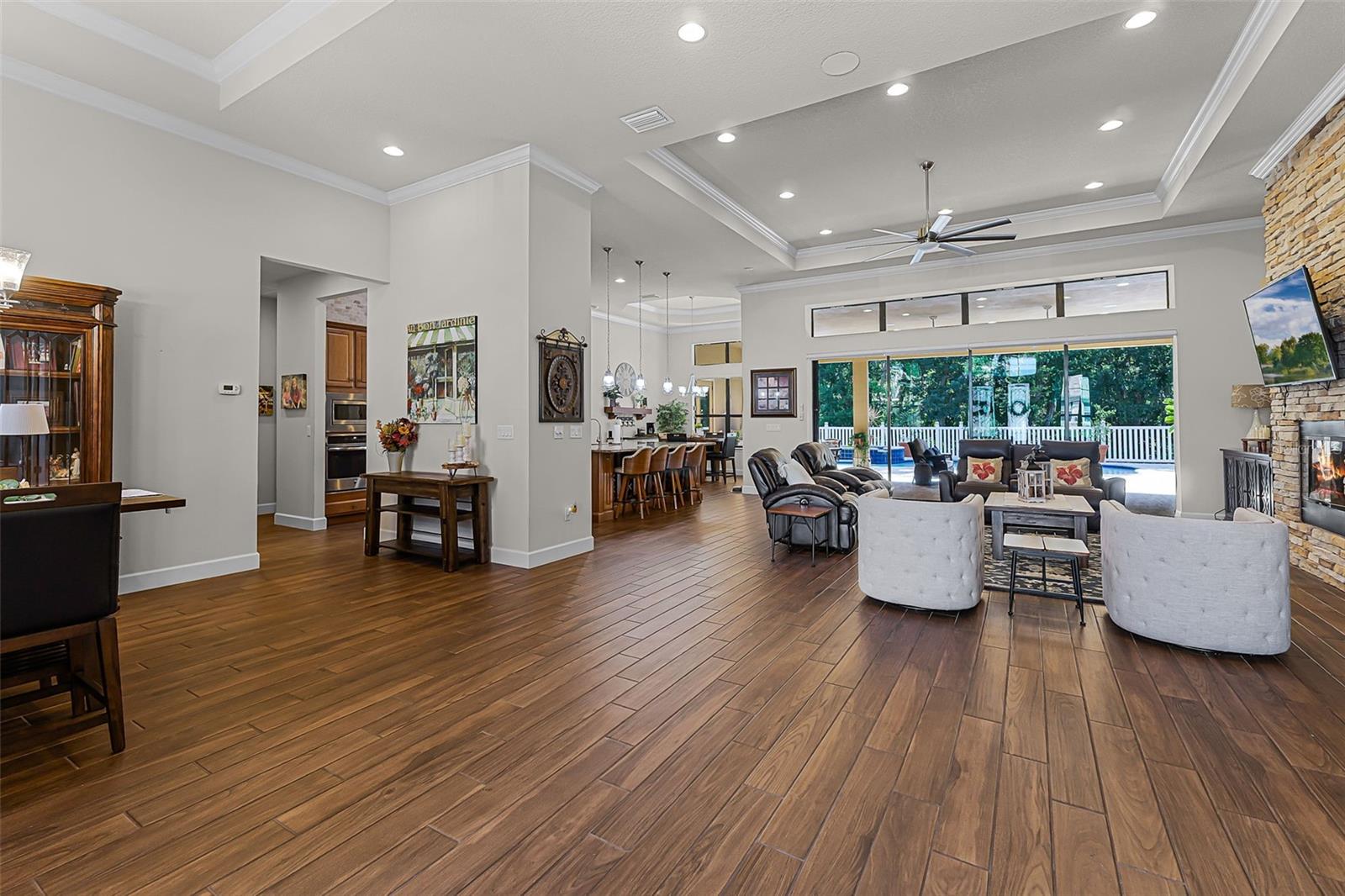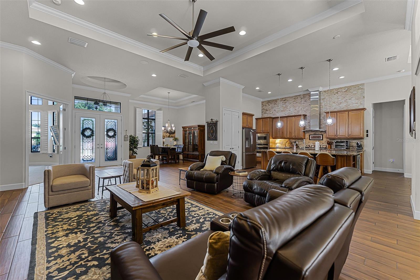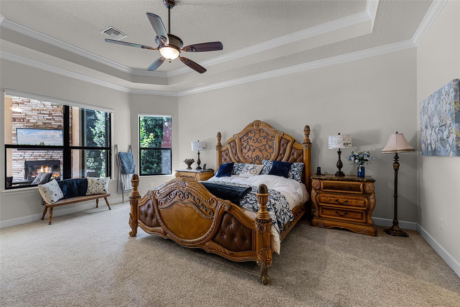 Ceiling Fans(s), Coffered Ceiling(s), Crown Molding, High Ceilings, Kitchen/Family Room Combo, Open Floorplan, Primary Bedroom Main Floor, Solid Wood Cabinets, Split Bedroom, Stone Counters, Tray Ceiling(s), Walk-In Closet(s), Window Treatments