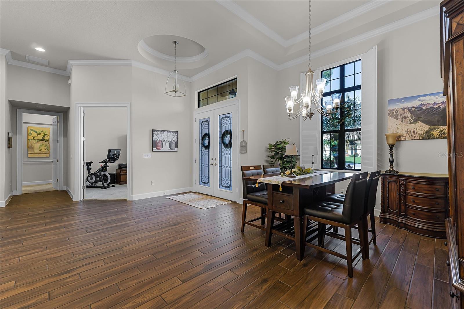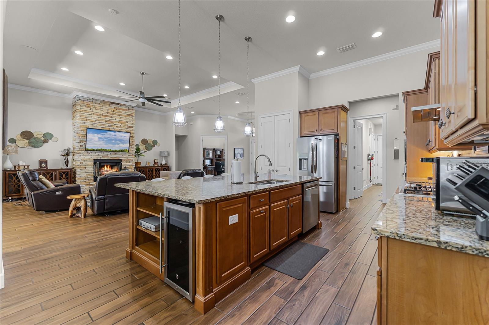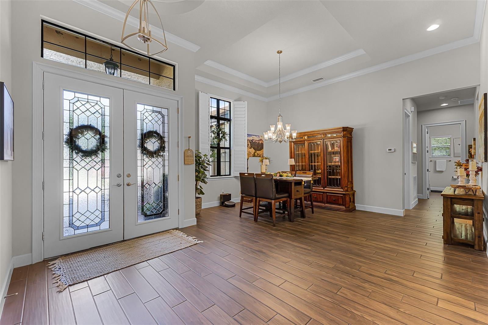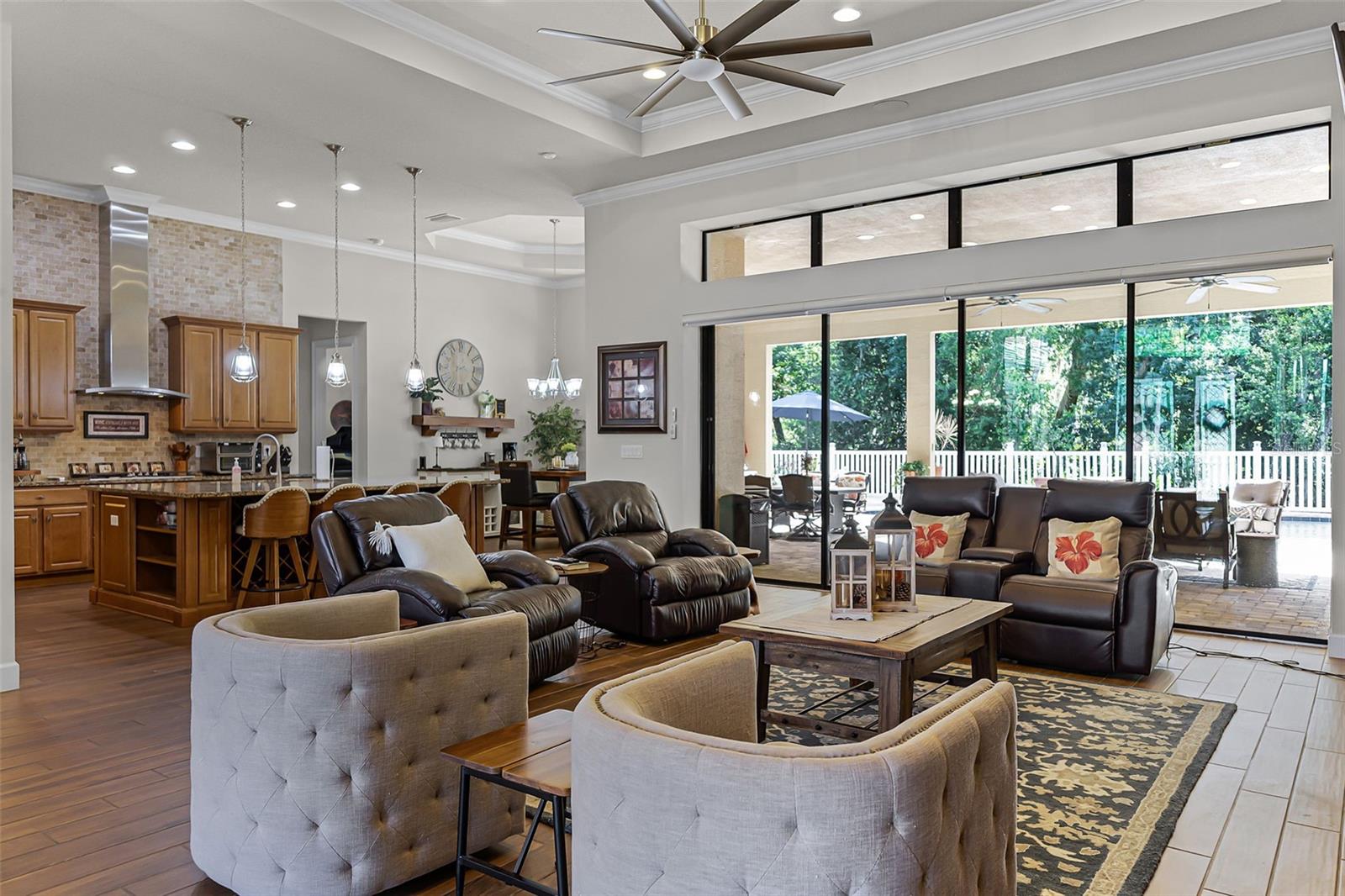 Ceiling Fans(s), Coffered Ceiling(s), Crown Molding, High Ceilings, Kitchen/Family Room Combo, Open Floorplan, Primary Bedroom Main Floor, Solid Wood Cabinets, Split Bedroom, Stone Counters, Tray Ceiling(s), Walk-In Closet(s), Window Treatments