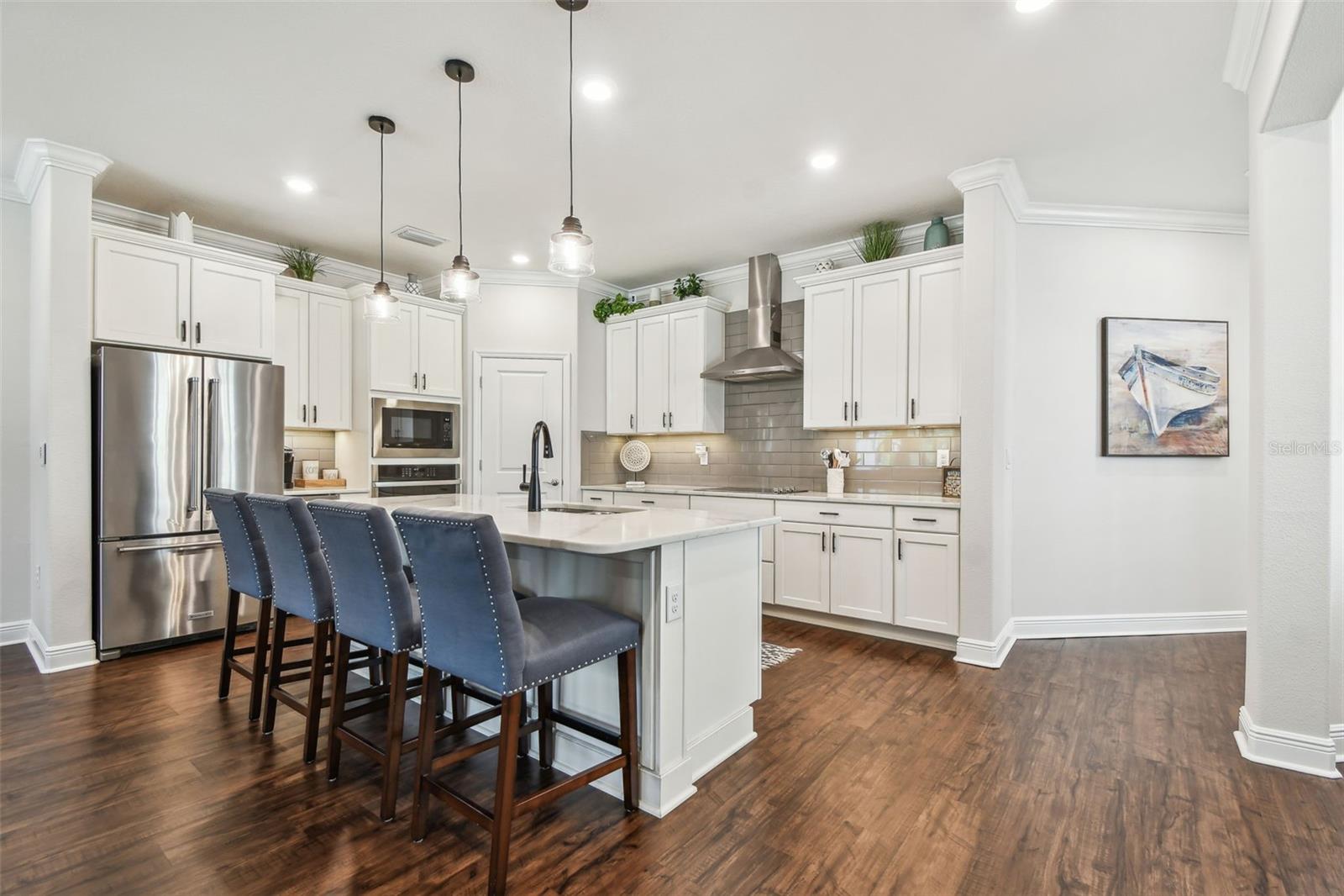 Positioned just steps from the clubhouse and pool, and set on a prime pond-view lot in Ozona Village, this 3-bedroom, 3-bathroom townhome offers a rare combination of thoughtful upgrades, pristine condition, and low-maintenance living in one of Palm Harbor’s most walkable coastal communities. The exterior was just freshly repainted, and the HOA is decreasing to $500 monthly. Built in 2019 and carefully maintained ever since, the home offers over 2, 300 square feet of living space with an intuitive layout and tasteful finish selections throughout. Rich dark laminate flooring anchors the main living areas, while upgraded carpeting with plush padding brings comfort to the bedrooms. The kitchen is both elegant and efficient—featuring an extended counter-height island with elegant Carrera quartz, soft-close cabinetry, a built-in oven and microwave, wine fridge, cooktop with range hood, and a striking glass backsplash. The main floor includes a private bedroom and full bath, ideal for guests or multi-generational living. Upstairs, a versatile loft space serves as a dedicated work zone or study nook. The primary suite is a standout, with tray ceilings, a custom walk-in closet, and a serene pond view. Closets throughout the home include smart storage systems, and the upgraded staircase adds a subtle architectural accent. Step outside to the extended lanai—clean lines, a tranquil water view, and ample green space create an easy backdrop for morning coffee or evening conversation. Behind the scenes, this home is equally well cared for: pavers are professionally cleaned, sealed, and sanded yearly; the HVAC system is serviced annually and now includes a HALO UV purification system (2025); and fresh interior paint (ceilings and main floor, 2025) ensures a turnkey experience for the next owner. Flood insurance isn’t required (X zone), and the property has remained unaffected by recent storms. Located within one of the top-rated school zones in the state and just minutes from the coast, the home also sits in the heart of Ozona’s vibrant golf cart district—where marinas, live music, and the Pinellas Trail are all part of daily life. For those seeking a low-maintenance home without compromise, 612 Ozona Village Dr delivers on every level.