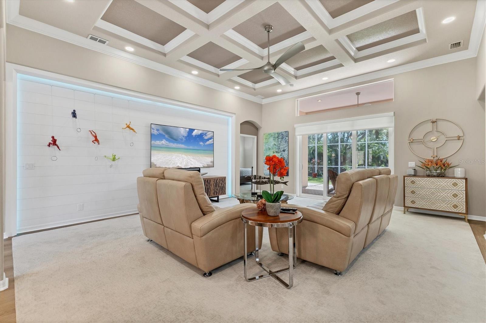 This beautifully updated and tastefully detailed residence in Mote Ranch offers an exceptional lifestyle characterized by both sophistication and comfort. The move-in property showcases a harmonious blend of style, functionality and long-lasting quality through an array of recent enhancements. Remodeled interior finishes and upgraded exterior features have been thoughtfully curated to ensure convenience, elegance and enduring value. Upon entering through custom etched double doors, you are greeted by dramatic, high ceilings, spacious living areas and gracious design elements. With approximately 2, 737 square feet, the home provides three bedrooms, three and one-half baths, a den/office and an upstairs bonus room. An expansive lanai, ideally suited for a pool and outdoor grill, features a serene fountain, creating an ideal environment for entertaining guests. Each room is appointed with plantation shutters to enhance privacy, while the great room includes a motorized shade on the sliding glass doors. The residence boasts significant upgrades such as hurricane-rated windows and a remodeled kitchen. Luxury vinyl flooring flows seamlessly throughout the main living spaces, with plush carpeting offered in the bedrooms, den and bonus room. Architectural touches include a 12-foot coffered ceiling in the great room and crown molding that extend throughout the home. The built-in niche in the great room, surrounded by dynamic lighting, allows for multi-color illumination. The kitchen has been updated with elegant cabinetry, a stylish backsplash, and quartz countertops and island. The primary bedroom suite is carpeted and serves as a tranquil retreat, featuring tray ceilings with decorative molding, direct access to the lanai, soaring ceilings, walk-in closets and a generous bath with a soaking tub and glass-enclosed shower. Secondary bedrooms are also carpeted, equipped with ceiling fans and adjoining baths, with the second bedroom offering ample closet storage. The dedicated den/office is fitted with a tray ceiling, double doors and a ceiling fan for comfort and privacy. Upstairs, the versatile bonus room includes a half bath and can accommodate a fitness area or a media and entertainment space. The spacious lanai is perfect for a pool or spa and an outdoor kitchen, making it ideal for gatherings. Exterior enhancements include fresh paint, an updated three-car garage with epoxy flooring, comprehensive guttering, a tankless water tank and a driveway finished with refined pavers. Designed tropical landscaping surrounds the home, presenting a distinguished curb appeal. And much more. Mote Ranch’s River Park community provides numerous amenities, including a junior Olympic pool and dock for kayaking or canoes. There is convenient proximity to the UTC Mall’s shopping and dining, SRQ Airport, Ringling Museum and the region’s renowned beaches.