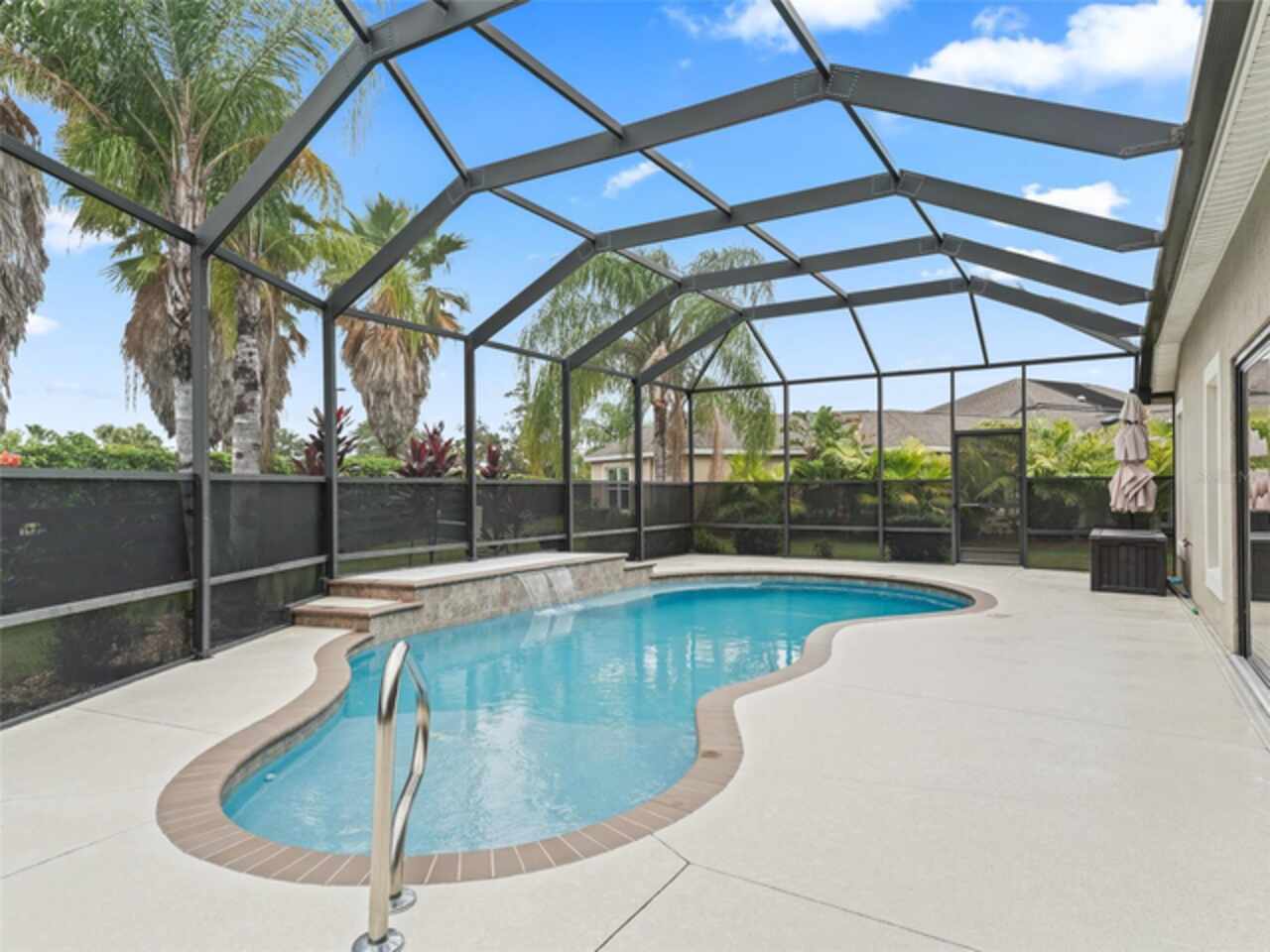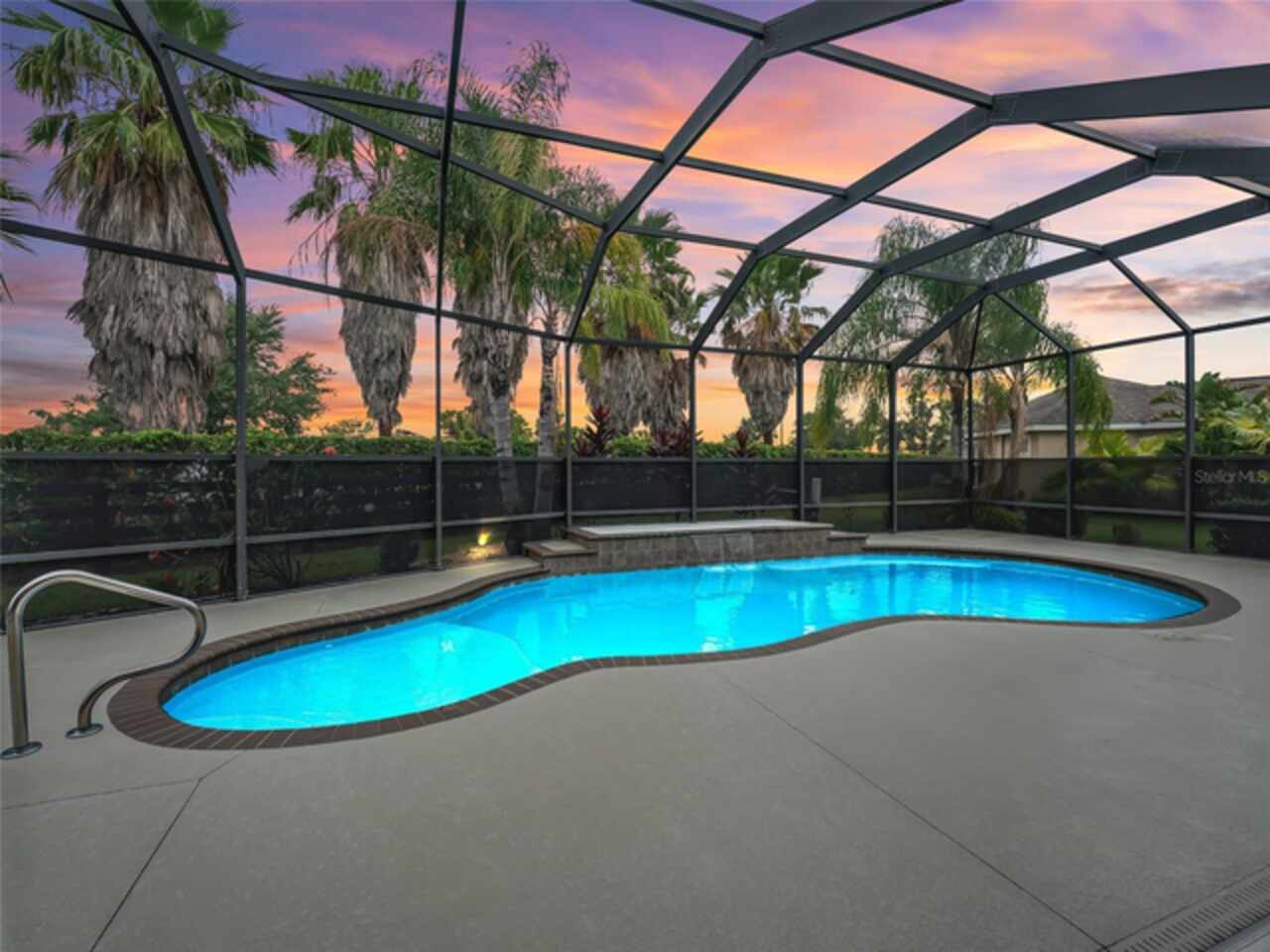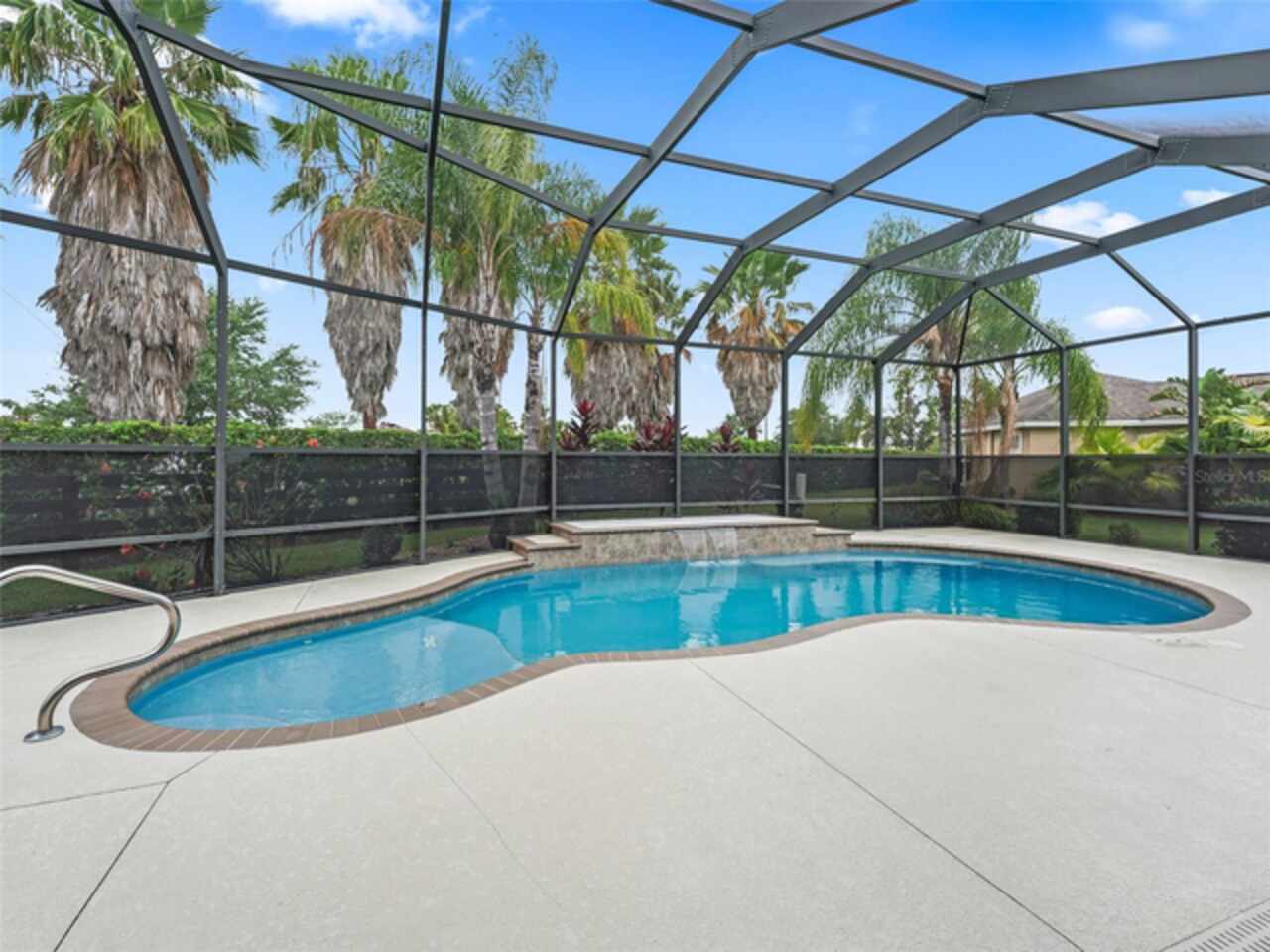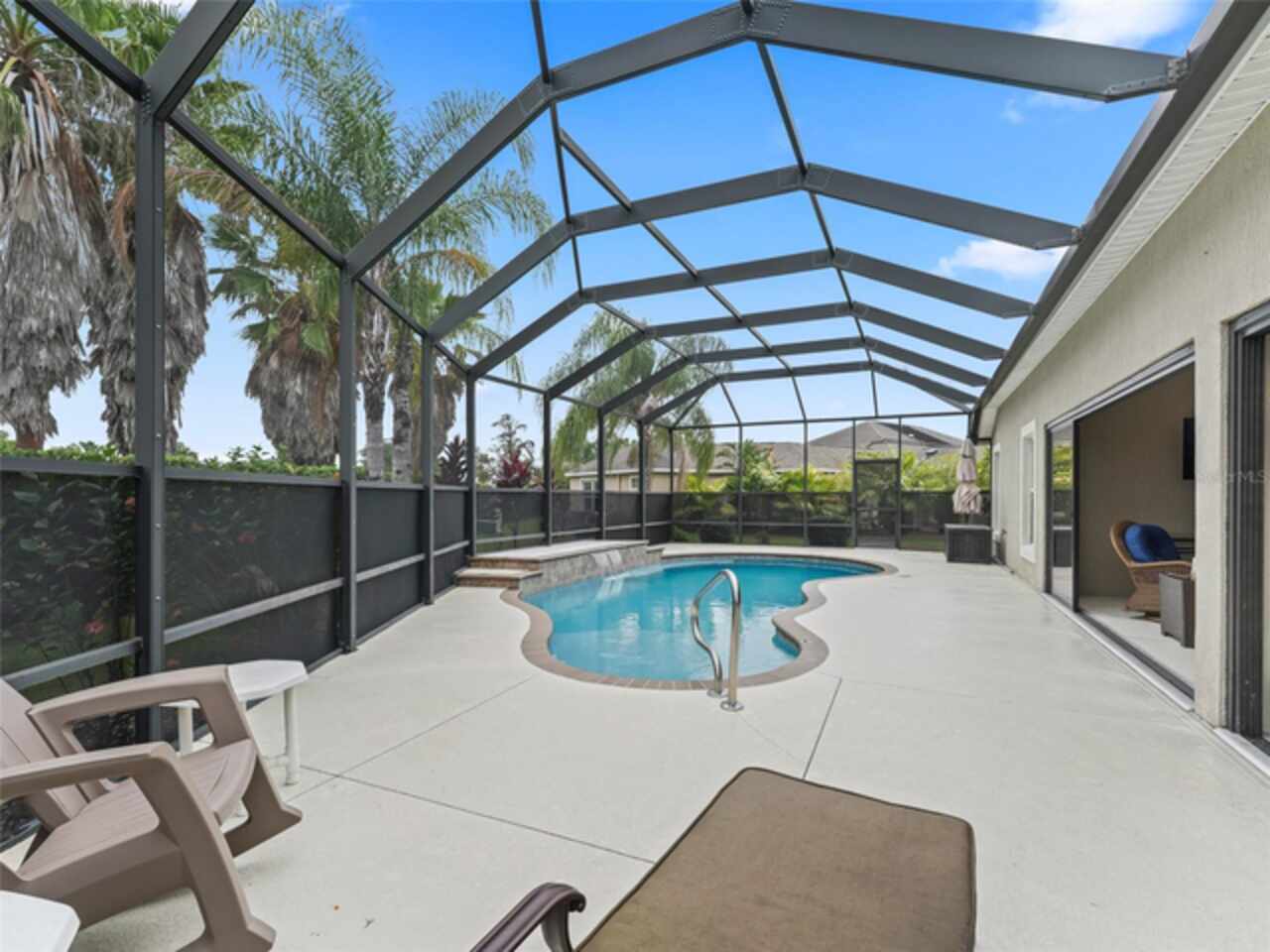 Under contract-accepting backup offers. Beautiful 4-Bedroom Pool Home on Quiet Cul-de-Sac – BOND PAID! Welcome to this stunning FURNISHED/TURN-KEY 4-bedroom, 2-bathroom home located on a peaceful cul-de-sac. Featuring 2, 606 sq. ft. of heated living space and 3, 665 sq. ft. under roof, this spacious residence offers both style and comfort. Step though the large ENCLOSED CLIMATE CONTROLLED sunroom, and outside to your private SOLAR HEATED swimming POOL, with soothing WATERFALL, perfect for year-round enjoyment. The home sits on over a quarter-acre lot and features a STONE paver walkway and driveway, SCREENED front porch, and GLASS-ENCLOSED lanai with A/C—ideal for relaxing or entertaining in comfort. Inside, you’ll love the open-concept great room and gourmet kitchen, complete with an island, pull-out cabinetry, pantry with pull-outs, stainless steel appliances (including a French door refrigerator), and stunning QUARTZ countertops. The luxurious master suite boasts a LARGE walk-in closet, HIS/HER vanities, and a WALK-IN shower. Spacious guest quarters offer privacy and comfort for visitors. Additional upgrades and features include: Crown molding and diagonal tile throughout; Quadruple glass sliding and recessing doors; Plantation shutters; Built-ins in all closets; Water SOFTENER and FILTRATION system; Indoor utility with a desk, folding counter and additional cabinetry; Extra refrigerator and newer STORM doors; Upgraded landscaping with ACCENT LIGHTING; Windows in garage; and Large-capacity hot water heater. Again, NO BOND! This exceptional home is move-in ready and packed with high-end finishes and thoughtful details. Don’t miss your chance to own this incredible home!