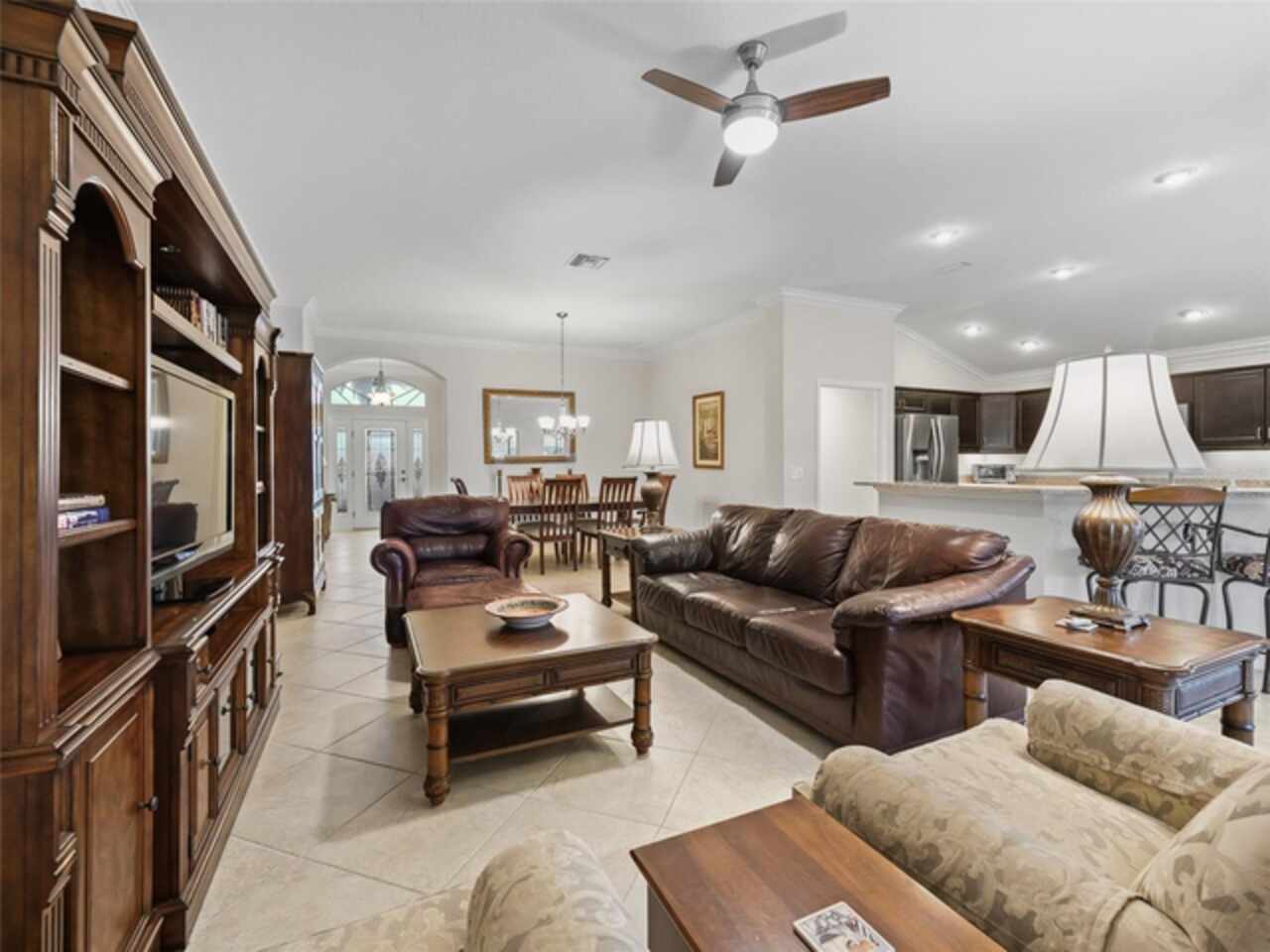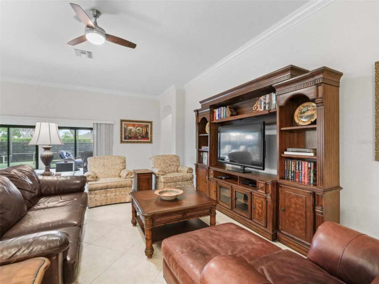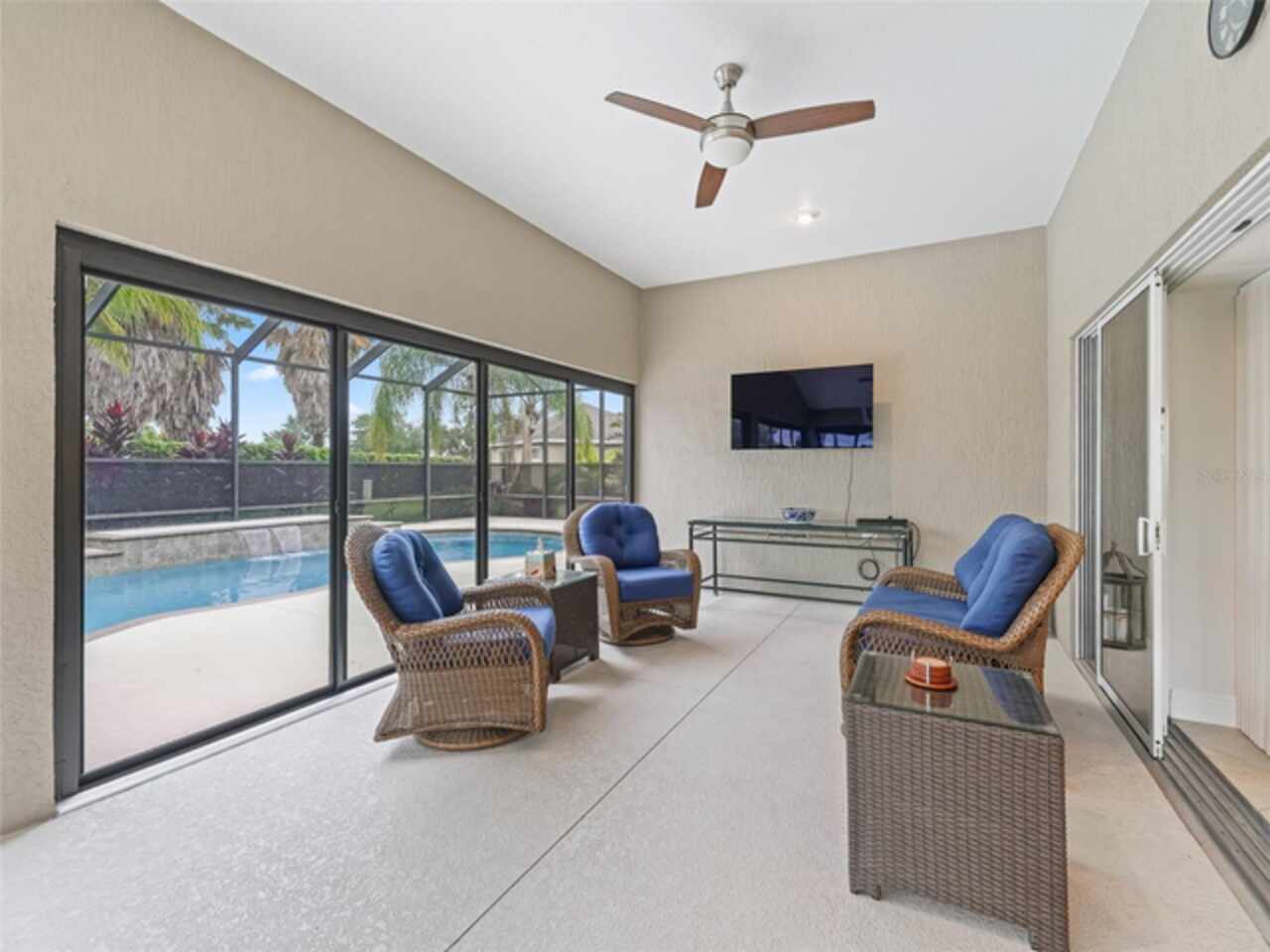 Under contract-accepting backup offers. Beautiful 4-Bedroom Pool Home on Quiet Cul-de-Sac – BOND PAID! Welcome to this stunning FURNISHED/TURN-KEY 4-bedroom, 2-bathroom home located on a peaceful cul-de-sac. Featuring 2, 606 sq. ft. of heated living space and 3, 665 sq. ft. under roof, this spacious residence offers both style and comfort. Step though the large ENCLOSED CLIMATE CONTROLLED sunroom, and outside to your private SOLAR HEATED swimming POOL, with soothing WATERFALL, perfect for year-round enjoyment. The home sits on over a quarter-acre lot and features a STONE paver walkway and driveway, SCREENED front porch, and GLASS-ENCLOSED lanai with A/C—ideal for relaxing or entertaining in comfort. Inside, you’ll love the open-concept great room and gourmet kitchen, complete with an island, pull-out cabinetry, pantry with pull-outs, stainless steel appliances (including a French door refrigerator), and stunning QUARTZ countertops. The luxurious master suite boasts a LARGE walk-in closet, HIS/HER vanities, and a WALK-IN shower. Spacious guest quarters offer privacy and comfort for visitors. Additional upgrades and features include: Crown molding and diagonal tile throughout; Quadruple glass sliding and recessing doors; Plantation shutters; Built-ins in all closets; Water SOFTENER and FILTRATION system; Indoor utility with a desk, folding counter and additional cabinetry; Extra refrigerator and newer STORM doors; Upgraded landscaping with ACCENT LIGHTING; Windows in garage; and Large-capacity hot water heater. Again, NO BOND! This exceptional home is move-in ready and packed with high-end finishes and thoughtful details. Don’t miss your chance to own this incredible home!