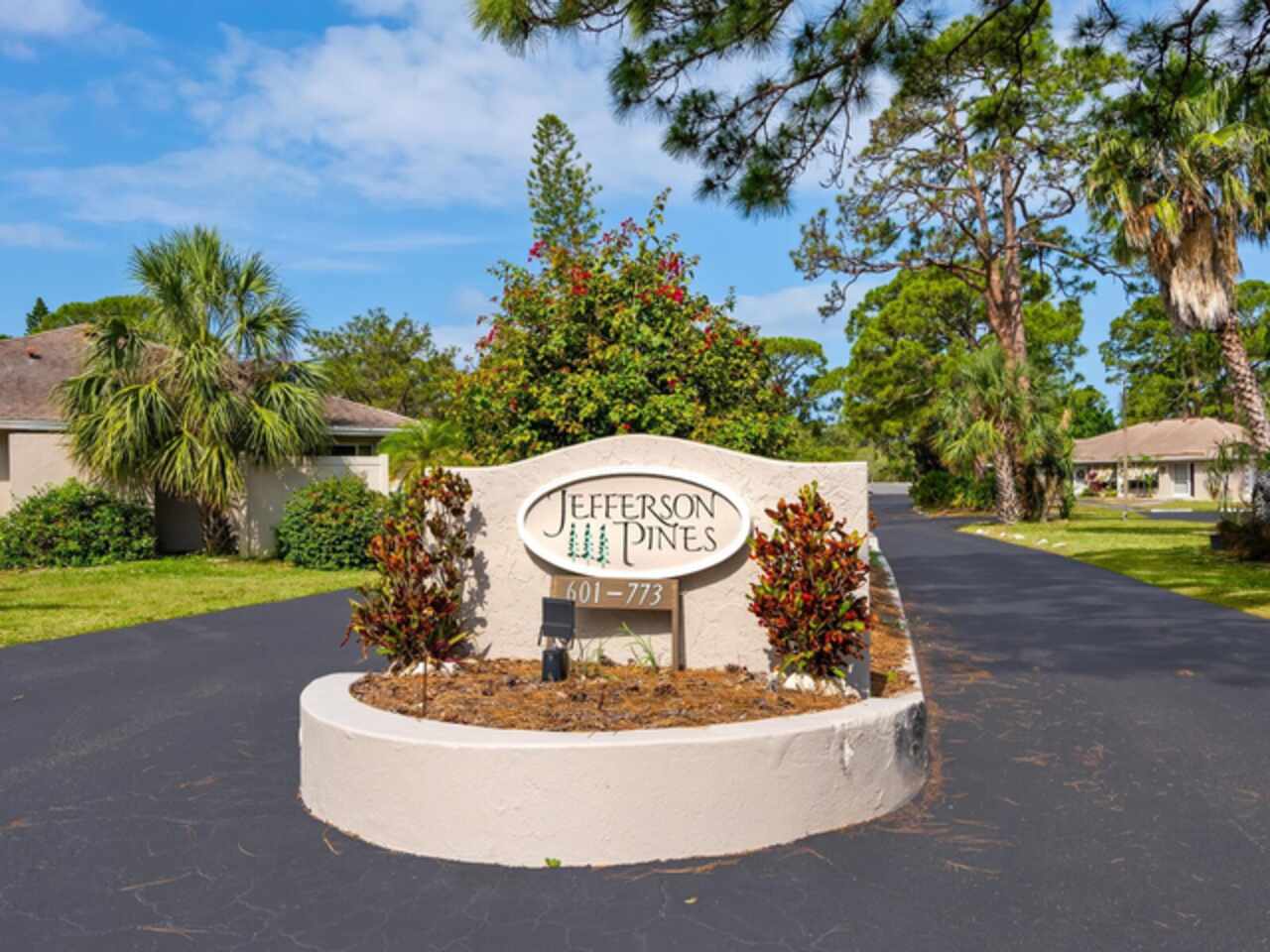 One or more photo(s) has been virtually staged. Don't miss this incredible opportunity to own a beautifully updated two-bedroom, two-bath villa in the sought-after community of Jefferson Pines, just minutes from vibrant downtown Sarasota. Enjoy world-class dining, shopping, theaters, opera and year-round events right at your fingertips nearby, all while in a serene, fairytale-like setting. This charming end-unit villa features a spacious, open layout with crown molding and recessed lighting. The upgraded kitchen is a standout, boasting granite countertops, an abundance of raised ceiling cabinetry with stained glass inlays, and a seamless flow into the living and dining areas. Both baths are tastefully updated, with the primary suite offering a unique tile atrium shower that adds a spa-like touch. Relax or entertain in your private, screened-in lanai, or take a short stroll to the sparkling community pool. Additional highlights include a newer air conditioner (2021), new roof (2022) and two assigned parking spaces conveniently right outside your front door. A must-see, great investment!