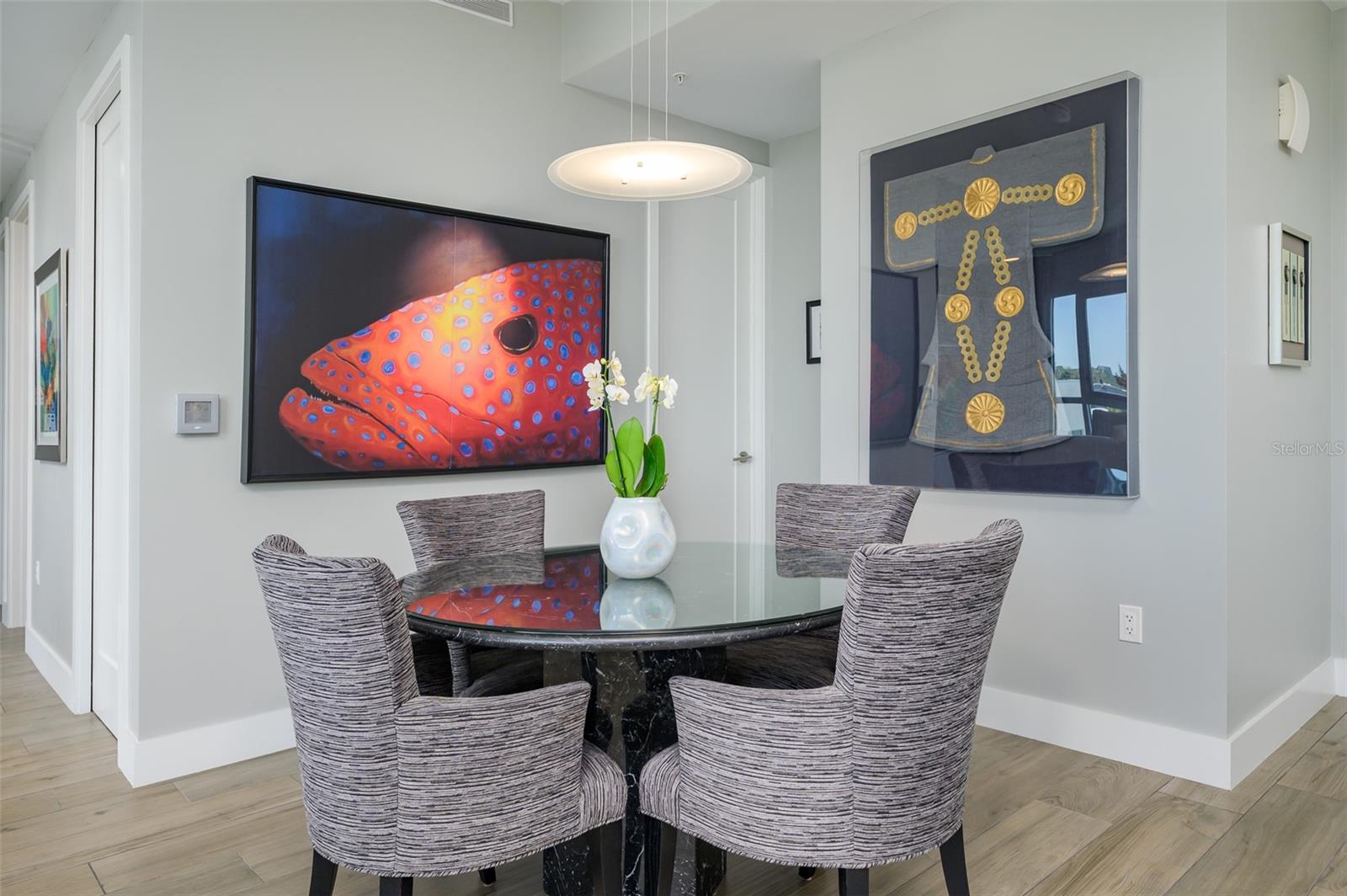 This desirable top-floor residence in the exclusive Orange Club community seamlessly blends modern design with everyday comfort. In a prime downtown location within a boutique building of only 15 residences, this sought-after Sunrise floor plan offers over 1, 500 square feet of open and airy living space. The main living areas feature elegant wood-look porcelain tile flooring, complementing the home’s contemporary aesthetic. An open-concept layout enhances the flow of natural light, with floor-to-ceiling sliders leading to an expansive private balcony. Designed for relaxation and entertaining, the balcony includes an overhead fan, and a natural gas grill with ample room for outdoor dining and lounging. The chef-inspired kitchen is stylish and functional, featuring a natural gas cooktop, premium dark wood-grain cabinetry, stainless steel appliances, and a large island that provides additional workspace and seating. The adjacent dining area is open and spacious, seamlessly integrating with the kitchen and living area for effortless entertaining. The primary suite spans the width of the residence, offering a tranquil retreat with abundant natural light, a spa-inspired en-suite bath and a generous walk-in closet. The primary bath is thoughtfully designed with a glass-enclosed walk-in shower, an extra-long floating double vanity and built-in storage, all complemented by large-format porcelain tiles. One of the additional bedrooms serves as a dedicated study with a closet, making it easily adaptable as a guest space or private media den. Positioned for privacy, the additional bedrooms are on the opposite side of the home, separated from the primary suite by the main living areas. High-end features throughout include shades, premium fixtures and wood-look porcelain tile flooring in the main living spaces. This residence also includes a deeded, assigned covered parking space, climate-controlled ground-level storage and access to ample guest parking. Residents of Orange Club enjoy a heated pool and patio area, ideal for year-round relaxation. Furniture is available for purchase under a separate bill of sale. In the heart of Sarasota, near the historic Burns Court neighborhood, this exceptional residence offers the blend of urban convenience, privacy and tranquility, all within a short distance of downtown Sarasota and Sarasota Bay.