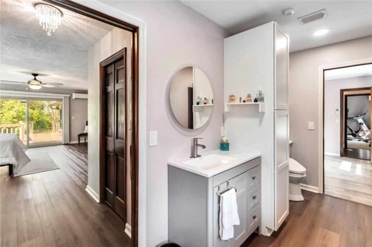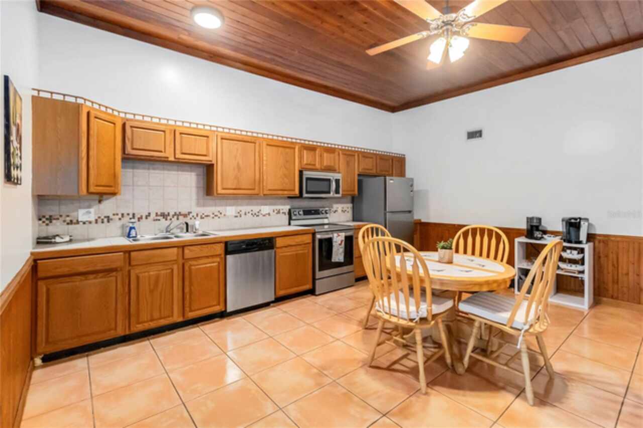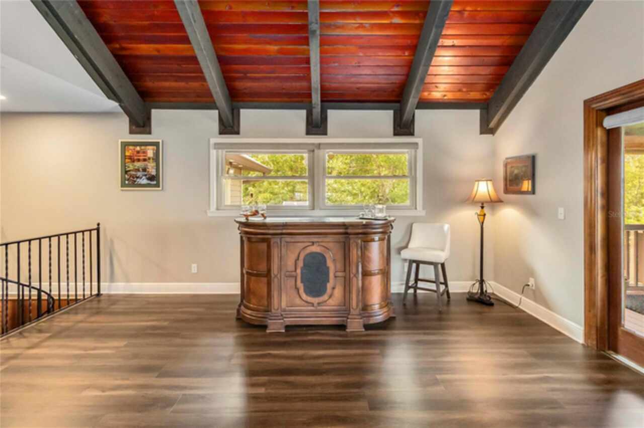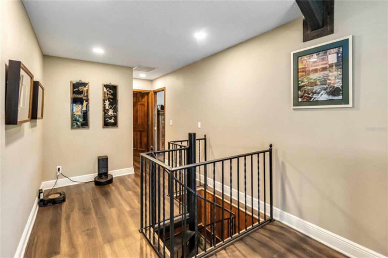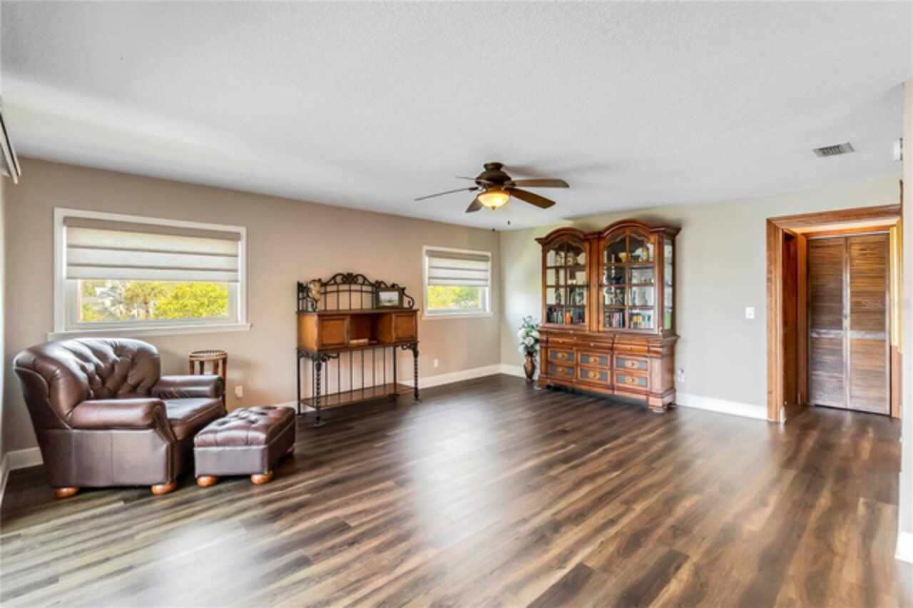 This stunning Elevated Lakefront home is a RARE find. Perfectly situated on Lake Lizzie with Conservation area on one side and Waterfront on the other. This 5-bedroom, 3-bathroom home invites Relaxation and Comfort. Enter from the stairs leading to the front door of this Completely Remodeled one-of-a-kind home and walk through the Entryway that leads into an open concept kitchen, dining and living area with vaulted wood ceilings and a Large Stone Wood Burning Fireplace. The area is light and bright with skylights and double French doors, with Hunter-Douglas (2019/2020) remote powered shades on the upper level. The Chef’s kitchen is well appointed, including quartz countertops, ceramic farmhouse sink, GE (‘Café’) double ovens, microwave, 5 burner gas stovetop and hood, Tru cabinets, Bosch dishwasher and built in pot filler. After dinner, relax and enjoy the sunsets and wildlife, on the large newly screened in porch. There are additional lake views on the unscreened decks with sliding glass doors off the dining area and the master suite. Take the spiral staircase to the In-Law apartment, complete with it’s own full-sized kitchen and bath. The apartment has it’s own Newly Screened Porch with a Large Swim Spa installed in 2021, West facing on the lake. The entire home is set up for Home Automation. The most recent Upgrades to the home include Metal Roof, Front Door, Attic Insulation for Energy Efficiency, Rebuilt Seawall, Fencing, Fire Pit. There is also a Generac 24kW generator installed in 2017 that seamlessly keeps power on throughout the home. There is a Community Boat Ramp Conveniently located adjacent to the property.