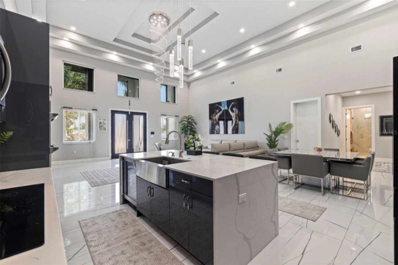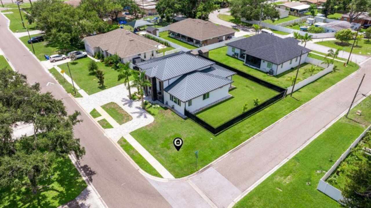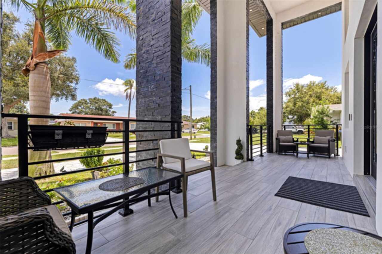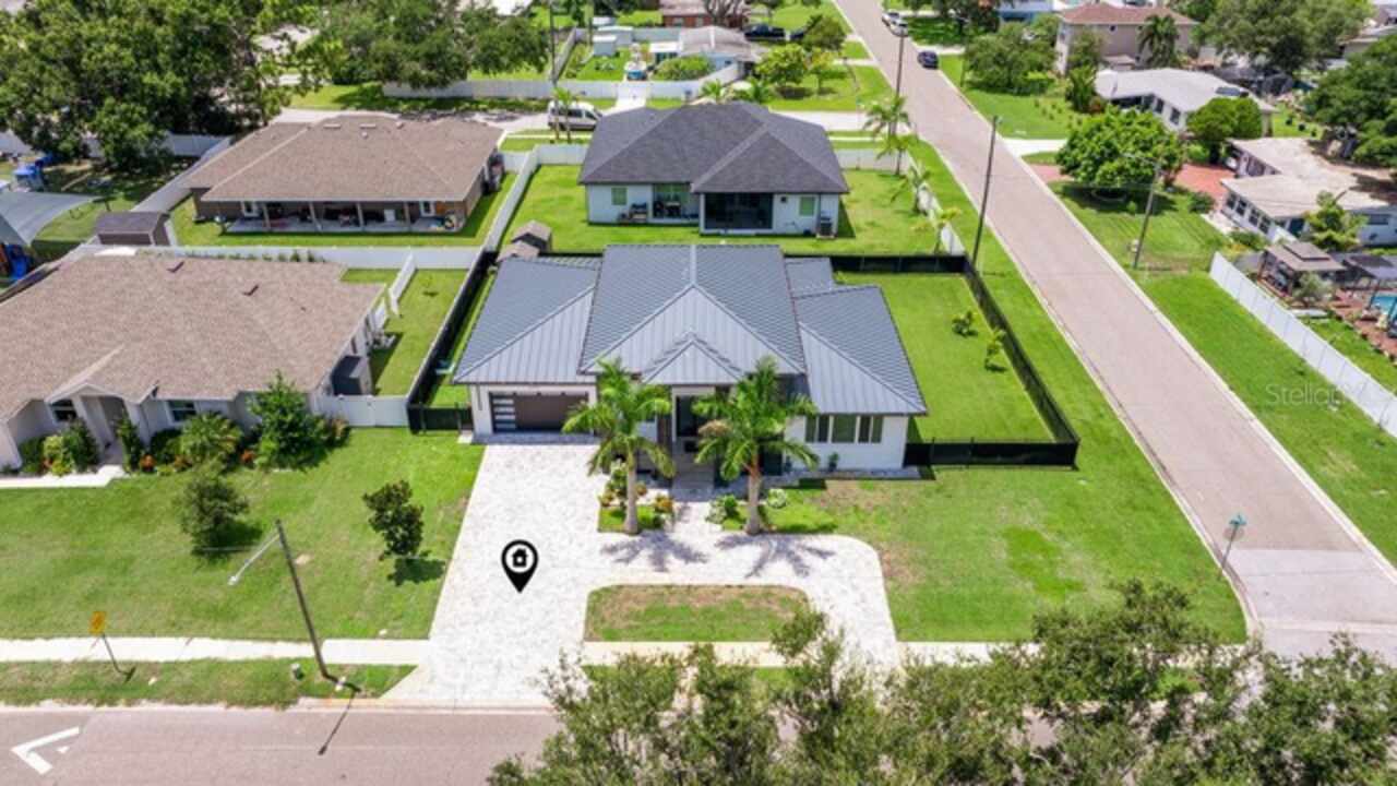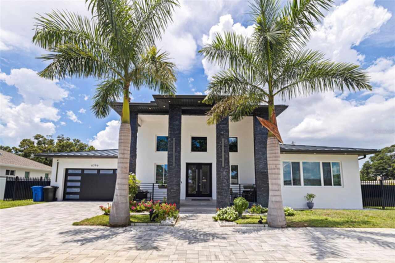 Custom built in 2023 with solid block construction, this showstopping residence blends sleek, modern architecture with luxurious everyday functionality—all in a non-flood zone. Towering stacked-stone columns, soaring ceilings, and a bold double-door entry create an unforgettable first impression. Inside, a dramatic open floor plan unfolds with clean lines, oversized windows, and premium finishes throughout, including tile flooring in the main living areas and wide-plank luxury vinyl flooring in the bedrooms. At the heart of the home, a designer kitchen impresses with flat-front modern cabinetry, waterfall quartz countertops, an oversized island with seating, a suite of high-end appliances, and a built-in beverage refrigerator—perfectly positioned to overlook the expansive living and dining areas. The split-bedroom layout offers privacy and flexibility, with the massive primary suite occupying its own wing. This tranquil retreat features a tray ceiling, room for a sitting area, and a spa-worthy ensuite with an oversized walk-in glass shower, dual vanities with quartz counters, and a jaw-dropping custom closet. On the opposite wing, two guest bedrooms share a luxe full bath and their own private hallway for added separation. Out back, the fully fenced yard and covered patio with built-in outdoor kitchen provide a stylish backdrop for entertaining. The oversized lot offers plenty of room for a future pool, while the attached 2-car garage with modern doors and a paver circular driveway enhance the home’s striking curb appeal. Additional highlights include a standing seam metal roof, impact-rated windows and doors, upgraded designer lighting, and an indoor laundry room with storage. Located on a peaceful corner lot with sidewalks and no HOA, this exceptional property offers elevated living in a centrally located neighborhood just minutes from Gulf beaches, downtown St. Pete, and local dining and shopping. A rare opportunity to own a true custom modern build in a prime, high-and-dry location.