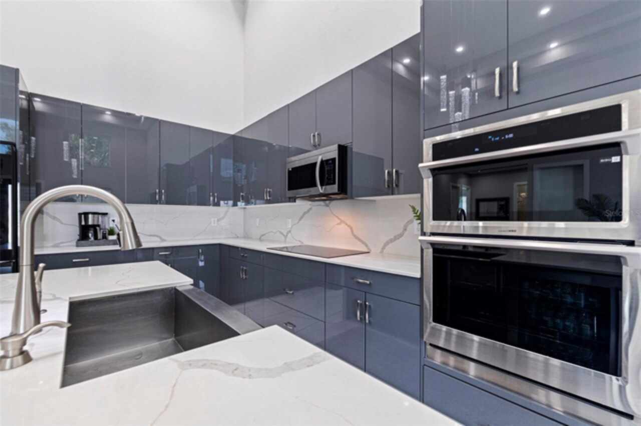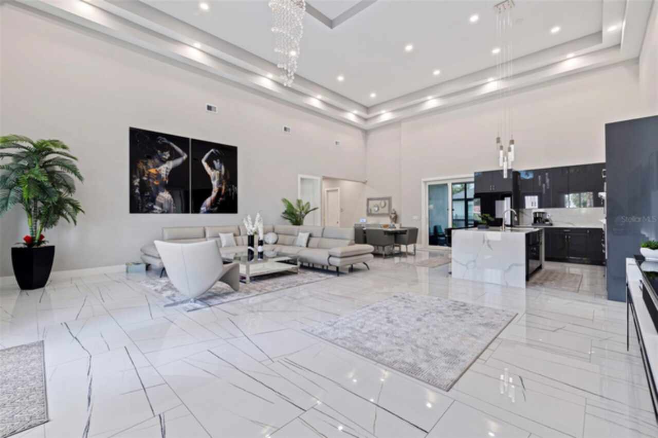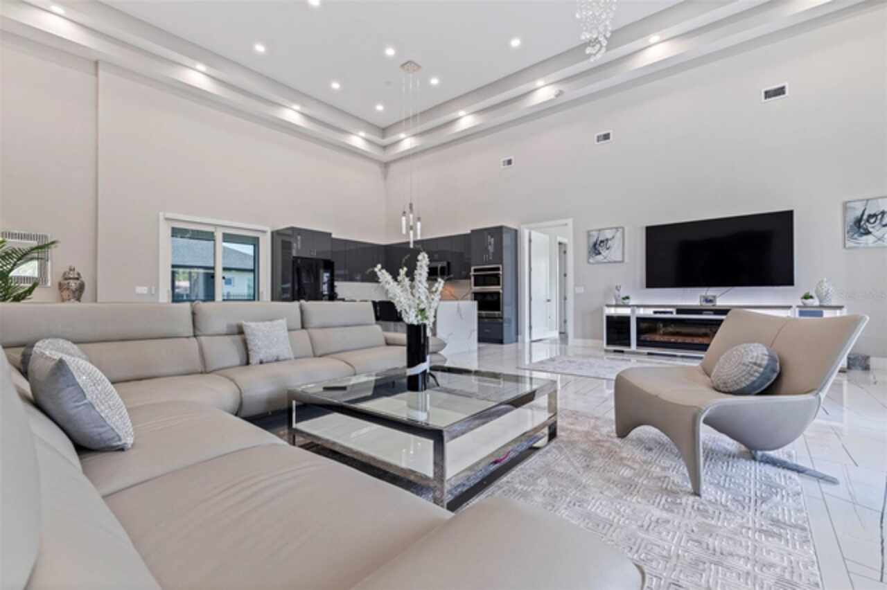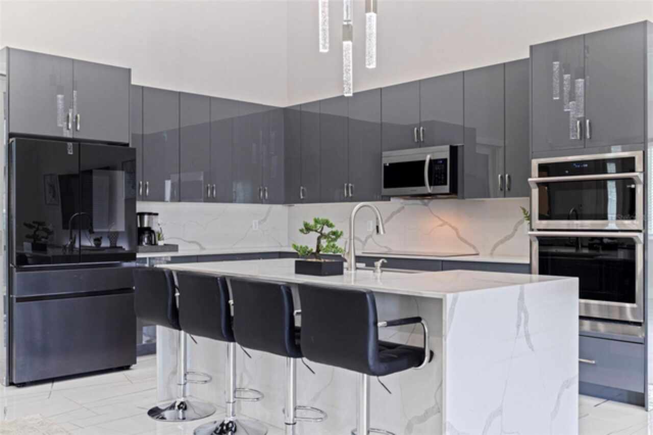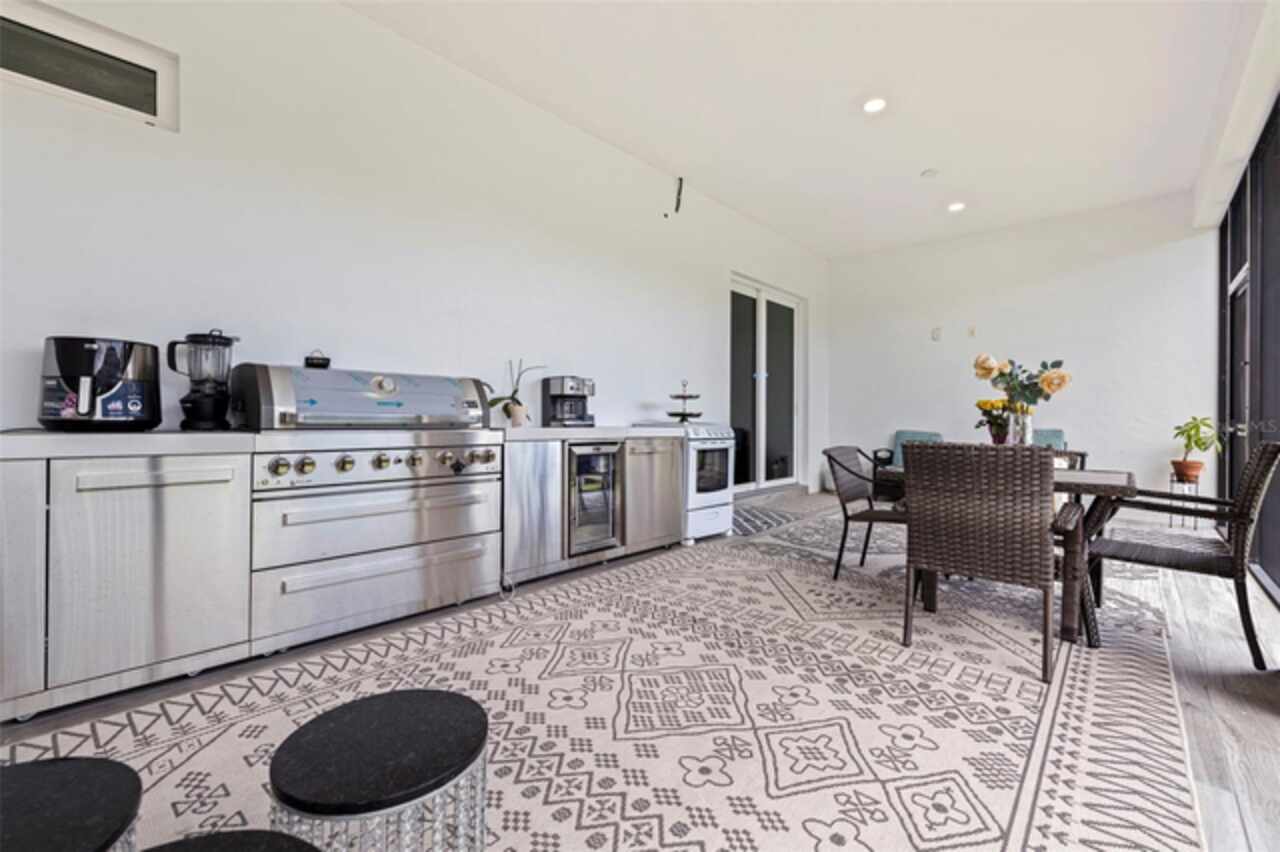 Custom built in 2023 with solid block construction, this showstopping residence blends sleek, modern architecture with luxurious everyday functionality—all in a non-flood zone. Towering stacked-stone columns, soaring ceilings, and a bold double-door entry create an unforgettable first impression. Inside, a dramatic open floor plan unfolds with clean lines, oversized windows, and premium finishes throughout, including tile flooring in the main living areas and wide-plank luxury vinyl flooring in the bedrooms. At the heart of the home, a designer kitchen impresses with flat-front modern cabinetry, waterfall quartz countertops, an oversized island with seating, a suite of high-end appliances, and a built-in beverage refrigerator—perfectly positioned to overlook the expansive living and dining areas. The split-bedroom layout offers privacy and flexibility, with the massive primary suite occupying its own wing. This tranquil retreat features a tray ceiling, room for a sitting area, and a spa-worthy ensuite with an oversized walk-in glass shower, dual vanities with quartz counters, and a jaw-dropping custom closet. On the opposite wing, two guest bedrooms share a luxe full bath and their own private hallway for added separation. Out back, the fully fenced yard and covered patio with built-in outdoor kitchen provide a stylish backdrop for entertaining. The oversized lot offers plenty of room for a future pool, while the attached 2-car garage with modern doors and a paver circular driveway enhance the home’s striking curb appeal. Additional highlights include a standing seam metal roof, impact-rated windows and doors, upgraded designer lighting, and an indoor laundry room with storage. Located on a peaceful corner lot with sidewalks and no HOA, this exceptional property offers elevated living in a centrally located neighborhood just minutes from Gulf beaches, downtown St. Pete, and local dining and shopping. A rare opportunity to own a true custom modern build in a prime, high-and-dry location.