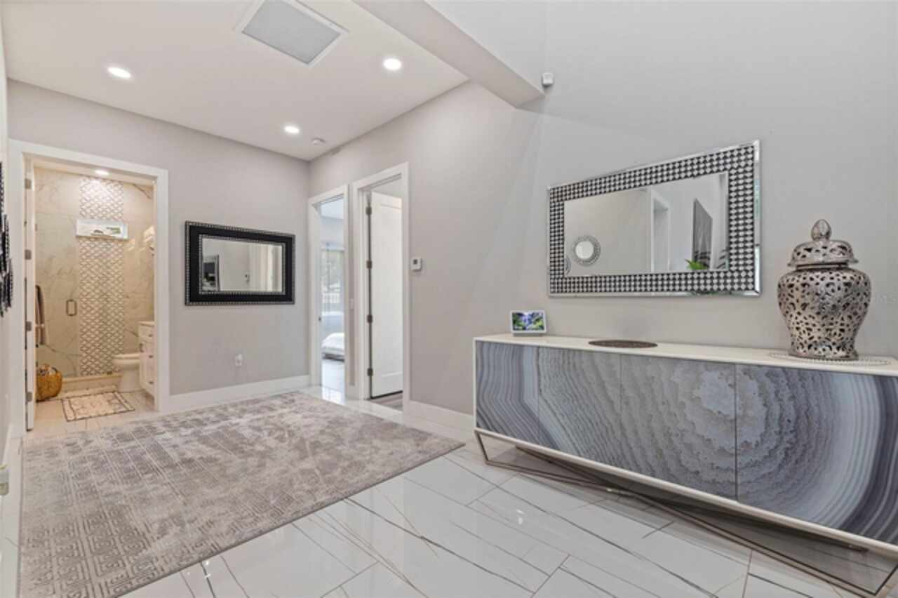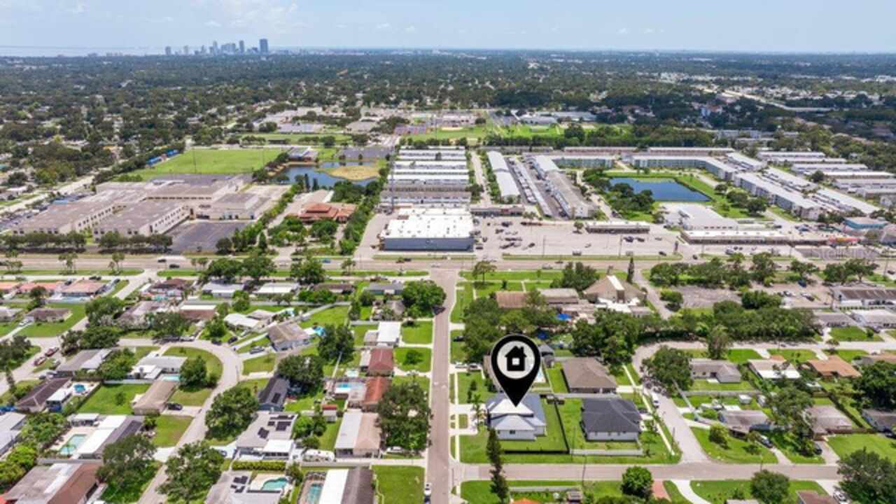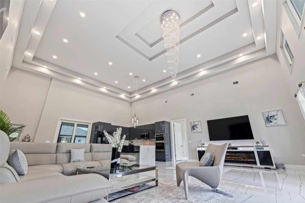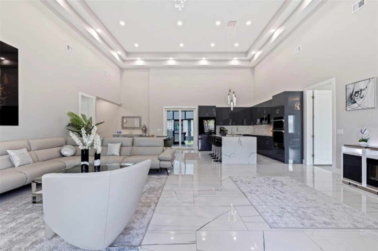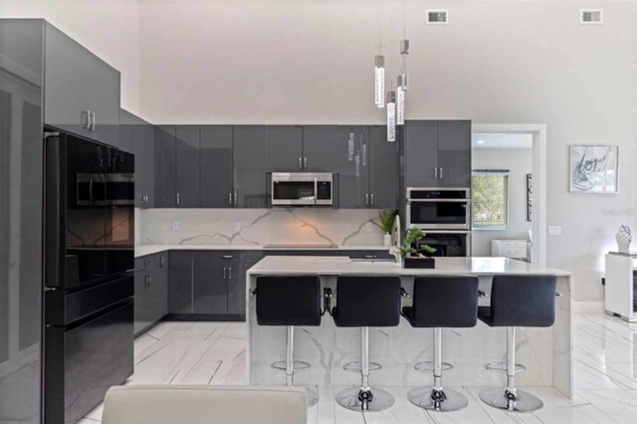 Custom built in 2023 with solid block construction, this showstopping residence blends sleek, modern architecture with luxurious everyday functionality—all in a non-flood zone. Towering stacked-stone columns, soaring ceilings, and a bold double-door entry create an unforgettable first impression. Inside, a dramatic open floor plan unfolds with clean lines, oversized windows, and premium finishes throughout, including tile flooring in the main living areas and wide-plank luxury vinyl flooring in the bedrooms. At the heart of the home, a designer kitchen impresses with flat-front modern cabinetry, waterfall quartz countertops, an oversized island with seating, a suite of high-end appliances, and a built-in beverage refrigerator—perfectly positioned to overlook the expansive living and dining areas. The split-bedroom layout offers privacy and flexibility, with the massive primary suite occupying its own wing. This tranquil retreat features a tray ceiling, room for a sitting area, and a spa-worthy ensuite with an oversized walk-in glass shower, dual vanities with quartz counters, and a jaw-dropping custom closet. On the opposite wing, two guest bedrooms share a luxe full bath and their own private hallway for added separation. Out back, the fully fenced yard and covered patio with built-in outdoor kitchen provide a stylish backdrop for entertaining. The oversized lot offers plenty of room for a future pool, while the attached 2-car garage with modern doors and a paver circular driveway enhance the home’s striking curb appeal. Additional highlights include a standing seam metal roof, impact-rated windows and doors, upgraded designer lighting, and an indoor laundry room with storage. Located on a peaceful corner lot with sidewalks and no HOA, this exceptional property offers elevated living in a centrally located neighborhood just minutes from Gulf beaches, downtown St. Pete, and local dining and shopping. A rare opportunity to own a true custom modern build in a prime, high-and-dry location.