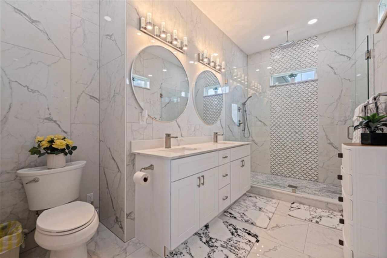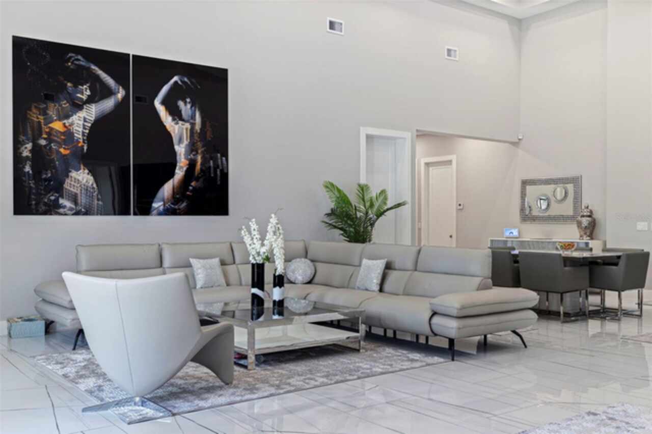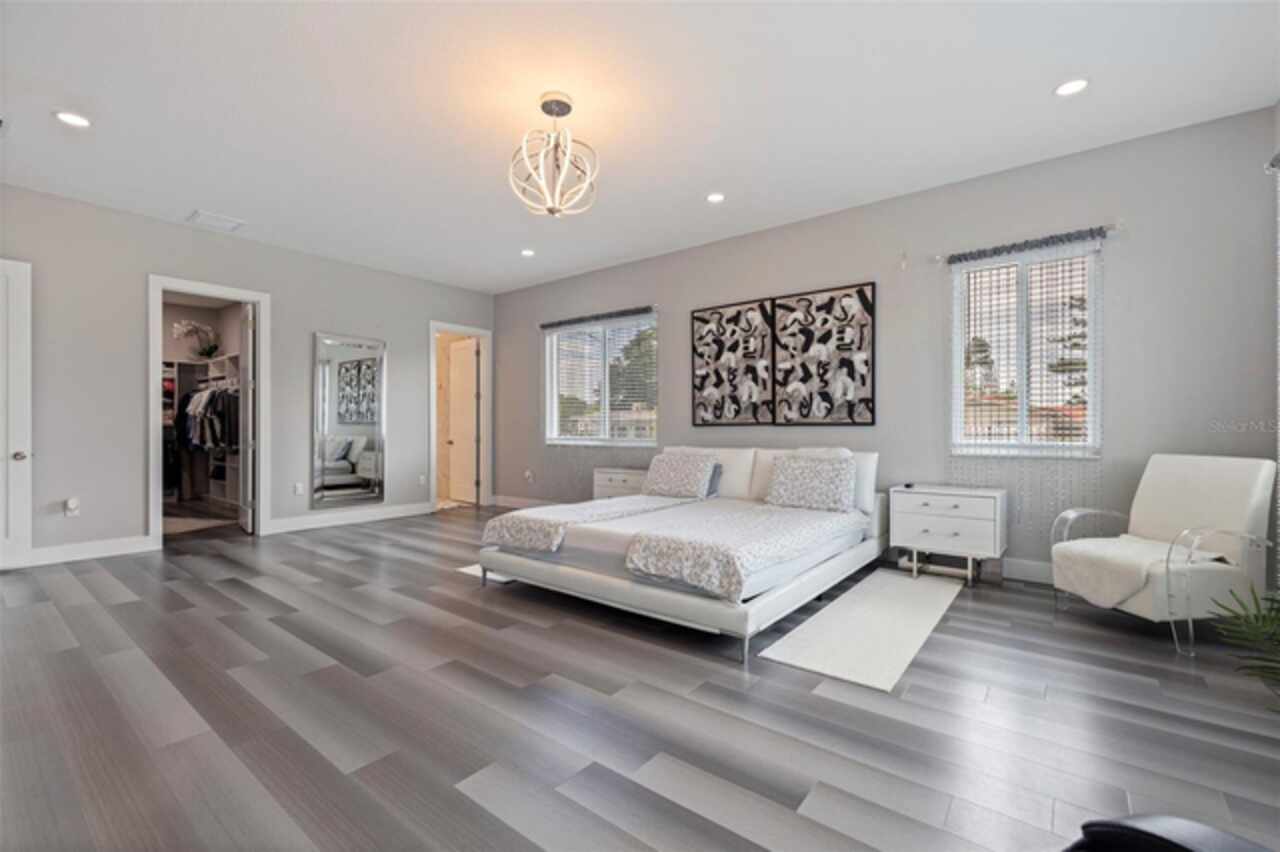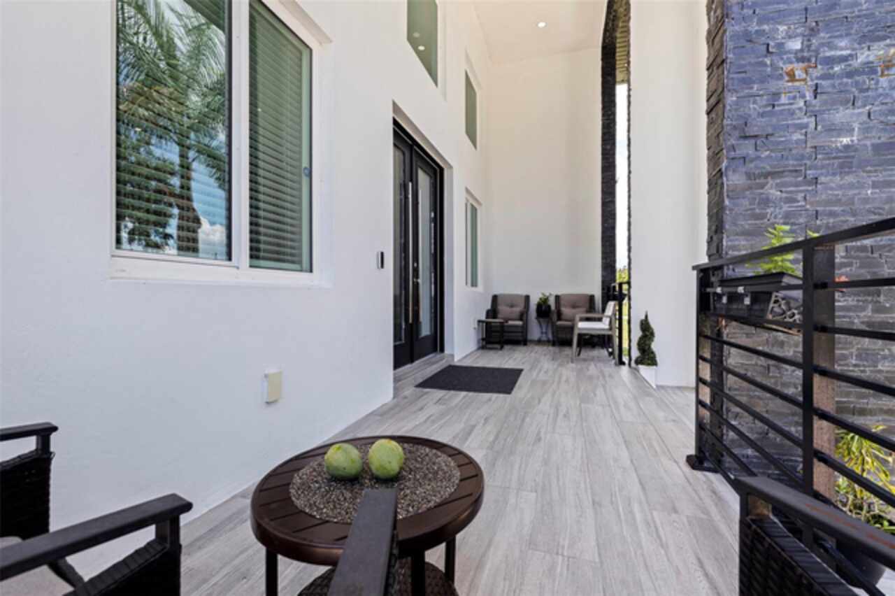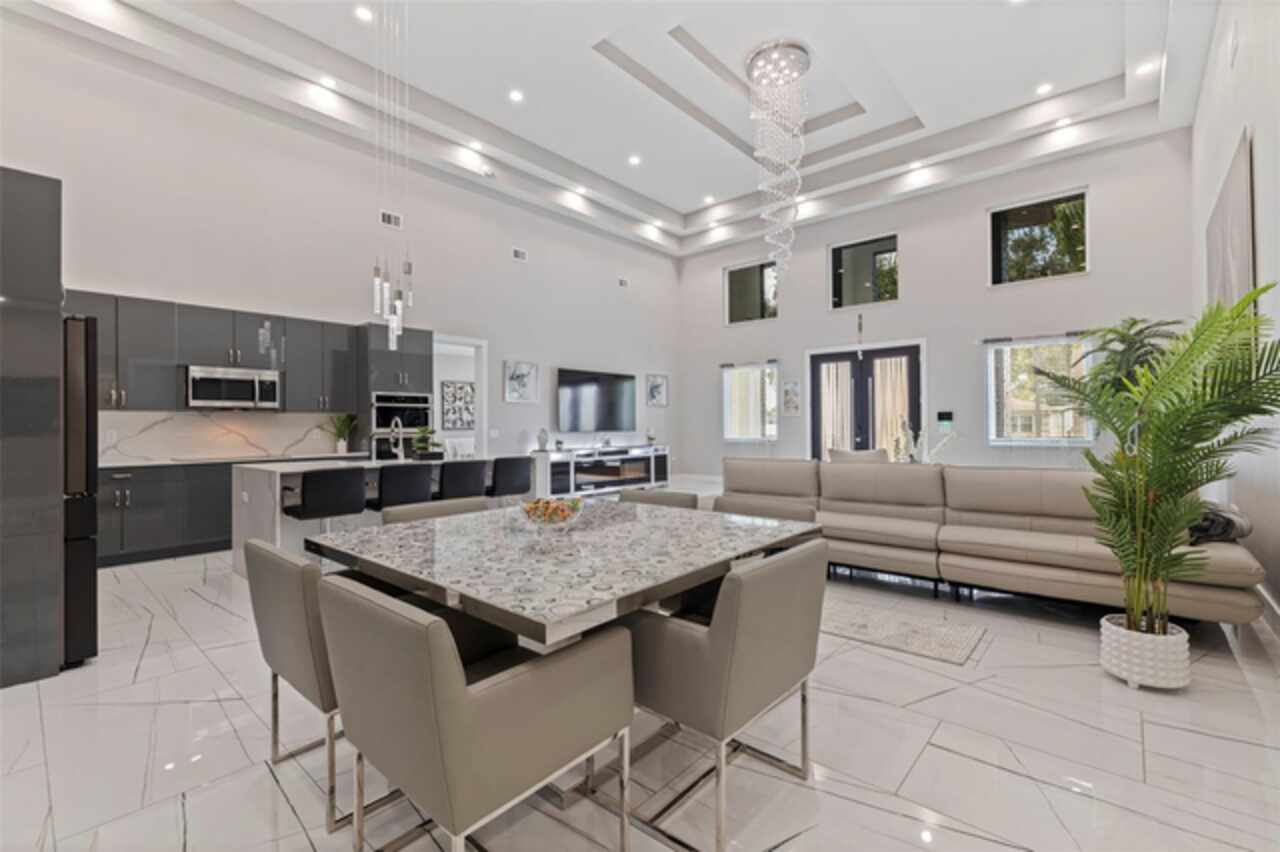 Custom built in 2023 with solid block construction, this showstopping residence blends sleek, modern architecture with luxurious everyday functionality—all in a non-flood zone. Towering stacked-stone columns, soaring ceilings, and a bold double-door entry create an unforgettable first impression. Inside, a dramatic open floor plan unfolds with clean lines, oversized windows, and premium finishes throughout, including tile flooring in the main living areas and wide-plank luxury vinyl flooring in the bedrooms. At the heart of the home, a designer kitchen impresses with flat-front modern cabinetry, waterfall quartz countertops, an oversized island with seating, a suite of high-end appliances, and a built-in beverage refrigerator—perfectly positioned to overlook the expansive living and dining areas. The split-bedroom layout offers privacy and flexibility, with the massive primary suite occupying its own wing. This tranquil retreat features a tray ceiling, room for a sitting area, and a spa-worthy ensuite with an oversized walk-in glass shower, dual vanities with quartz counters, and a jaw-dropping custom closet. On the opposite wing, two guest bedrooms share a luxe full bath and their own private hallway for added separation. Out back, the fully fenced yard and covered patio with built-in outdoor kitchen provide a stylish backdrop for entertaining. The oversized lot offers plenty of room for a future pool, while the attached 2-car garage with modern doors and a paver circular driveway enhance the home’s striking curb appeal. Additional highlights include a standing seam metal roof, impact-rated windows and doors, upgraded designer lighting, and an indoor laundry room with storage. Located on a peaceful corner lot with sidewalks and no HOA, this exceptional property offers elevated living in a centrally located neighborhood just minutes from Gulf beaches, downtown St. Pete, and local dining and shopping. A rare opportunity to own a true custom modern build in a prime, high-and-dry location.