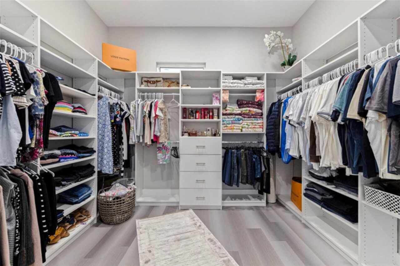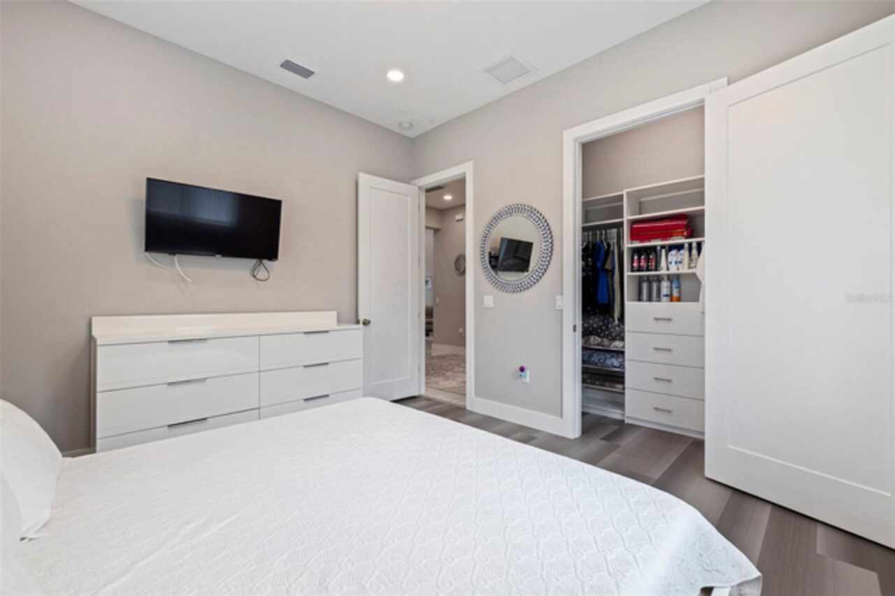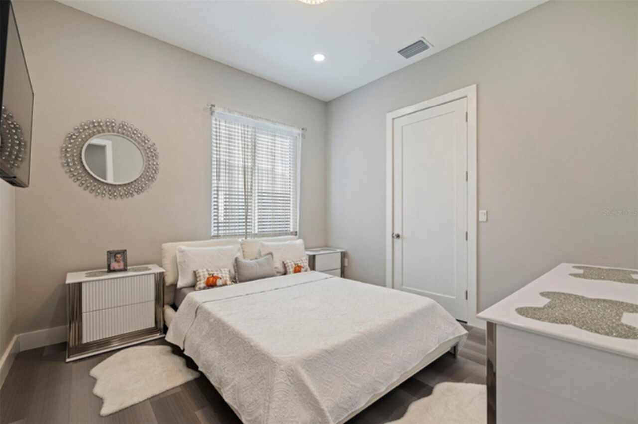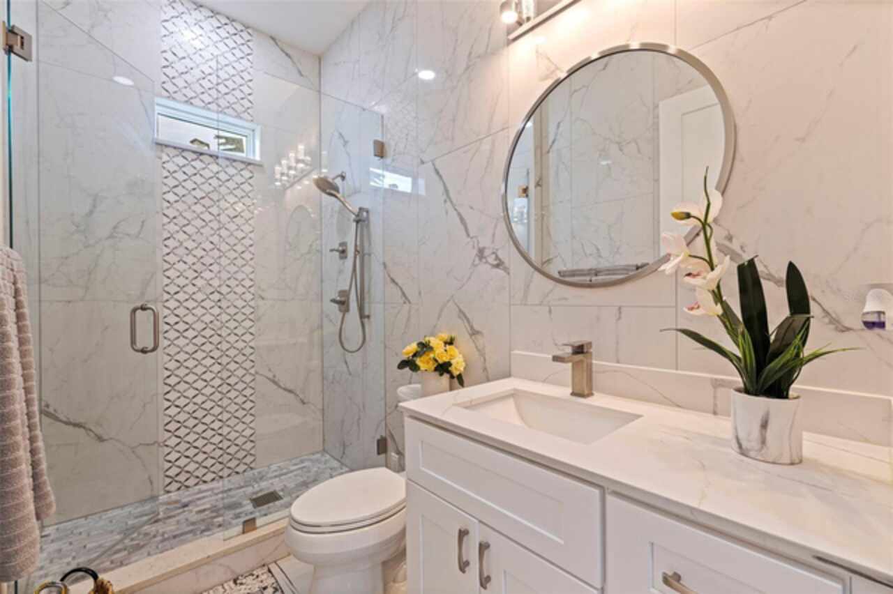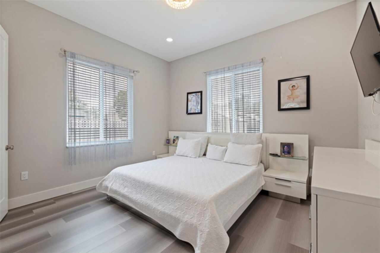 Custom built in 2023 with solid block construction, this showstopping residence blends sleek, modern architecture with luxurious everyday functionality—all in a non-flood zone. Towering stacked-stone columns, soaring ceilings, and a bold double-door entry create an unforgettable first impression. Inside, a dramatic open floor plan unfolds with clean lines, oversized windows, and premium finishes throughout, including tile flooring in the main living areas and wide-plank luxury vinyl flooring in the bedrooms. At the heart of the home, a designer kitchen impresses with flat-front modern cabinetry, waterfall quartz countertops, an oversized island with seating, a suite of high-end appliances, and a built-in beverage refrigerator—perfectly positioned to overlook the expansive living and dining areas. The split-bedroom layout offers privacy and flexibility, with the massive primary suite occupying its own wing. This tranquil retreat features a tray ceiling, room for a sitting area, and a spa-worthy ensuite with an oversized walk-in glass shower, dual vanities with quartz counters, and a jaw-dropping custom closet. On the opposite wing, two guest bedrooms share a luxe full bath and their own private hallway for added separation. Out back, the fully fenced yard and covered patio with built-in outdoor kitchen provide a stylish backdrop for entertaining. The oversized lot offers plenty of room for a future pool, while the attached 2-car garage with modern doors and a paver circular driveway enhance the home’s striking curb appeal. Additional highlights include a standing seam metal roof, impact-rated windows and doors, upgraded designer lighting, and an indoor laundry room with storage. Located on a peaceful corner lot with sidewalks and no HOA, this exceptional property offers elevated living in a centrally located neighborhood just minutes from Gulf beaches, downtown St. Pete, and local dining and shopping. A rare opportunity to own a true custom modern build in a prime, high-and-dry location.