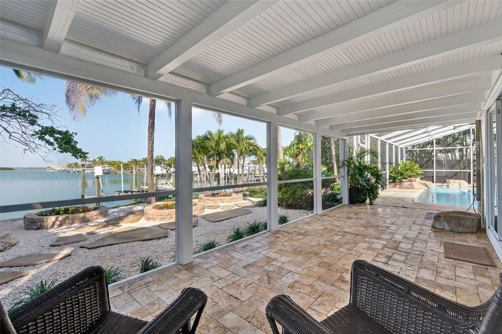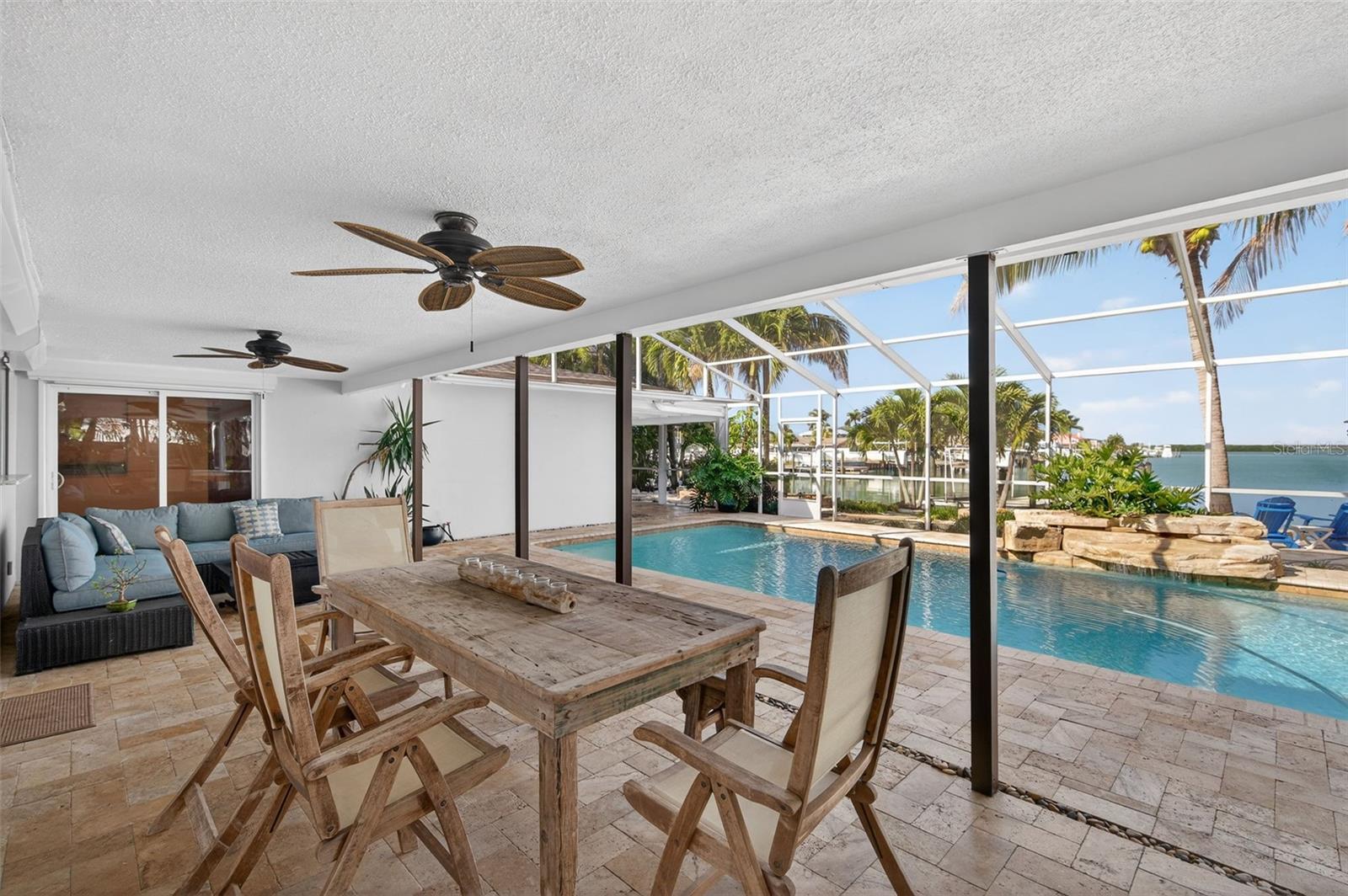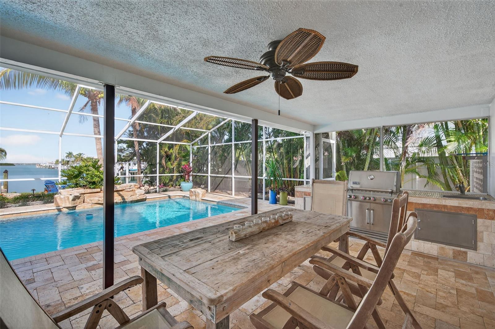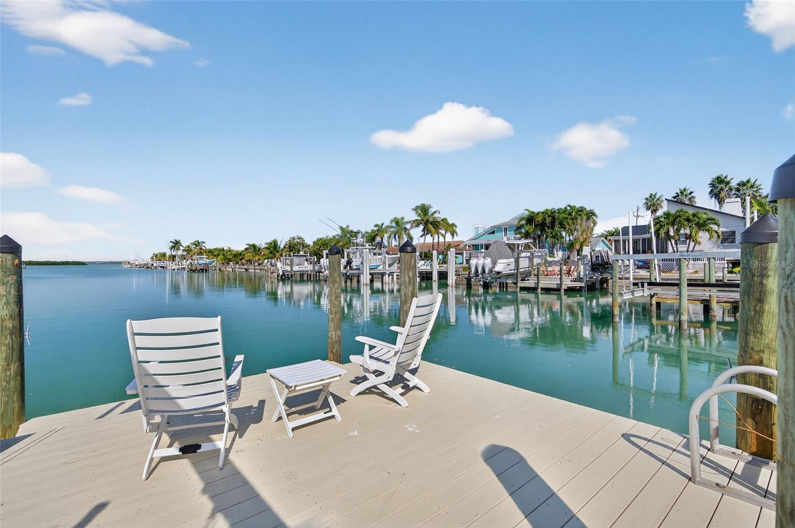 Welcome to one of the most desirable island retreat homes presently on the market. The lush, tropically landscaped home is located at the end of an exceptionally wide deep-water canal on the Isle of Capri. This serene beach location is just a 5-minute walk to the sparkling Gulf Of-Mexico and world-famous Treasure Island Beach. Showcasing incredible open-water views, this home is move-in condition and ready for its new owner. Travertine pavers cover the huge driveway with parking for up to eight vehicles. An expansive, storage shed located in front has been custom-designed to appear as a second garage and perfectly matches the residence. Enter through the custom-designed front door into a combination living room and breakfast dining area. The fabulous full-size breakfast area has two sliding glass doors providing a picturesque view of the pool and the expansive waterway beyond. The brand new kitchen features custom cabinetry, quartz countertops, cooktop with custom overhead vent and a sink and prep area overlooking both the pool and water. Immediately adjacent is the large formal dining room, complete with a stunning fireplace—this versatile space could also serve as a den. The magnificent master suite includes a wet bar/coffee bar with a wine refrigerator. The views are amazing through four sliding glass doors that open to a private screened lanai overlooking the pool and waterway. The master bath features a soaking tub with custom built-in shelving, an open stall shower, and a beautifully designed California Closet with abundant space for two. There are two additional extra-large bedrooms. Each have their own ensuite full baths with one, also doubling as a convenient pool bath for guests. The garage has been completely refurbished with all-new paint and features a built-in laundry area and a uniquely designed large storage closet with barn doors. Step outside to the back patio and pool area—where the show truly begins. A complete outdoor kitchen, perfect for entertaining, sits beneath a large covered lanai that spans the entire width of the home and opens onto an exceptionally large custom-designed swimming pool within a full screen enclosure. A tastefully designed hot-and-cold rainfall shower, complete with six body jets and a handheld wand, is conveniently located in the lanai for pool guests. The tropically landscaped backyard is a true gem, featuring a custom stone walkway, multiple raised planters, and a beautiful travertine patio complete with fire pit overlooking the property’s 84' seawall with unobstructed waterway and island views. The recently renovated boat dock with both water and power, includes Trex decking, piling covers, and a new 12, 000-lb electric boat lift. The dock is large enough to accommodate a table and multiple chairs, offering yet another space to enjoy the breathtaking scenery. Extensive inprovements have recently been completed: New Roof- 2025, New Kitchen Appliances- 20225, New Pool Pump- 2025, New AC/Heat- 2025. New hot Water Heater- 2025, New Duct Work-2021, New Attic insulation -2021 to name a few. This serene beach location is just a 10-minute walk to the lively waterfront development of John’s Pass Village with its many restaurants, bars and shops. Don’t miss your opportunity to own one of the premier residences in the area and begin enjoying "On The Water" Florida living at its finest!.