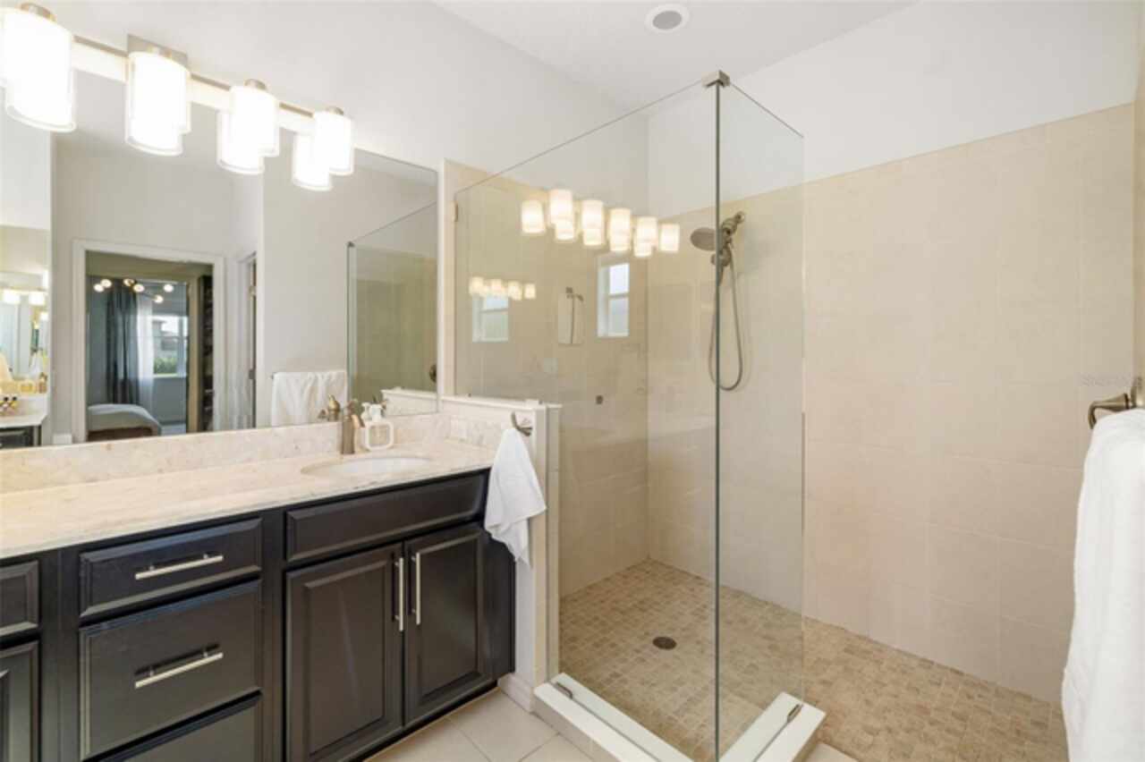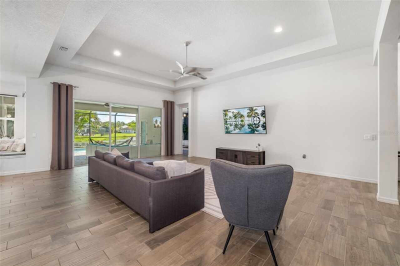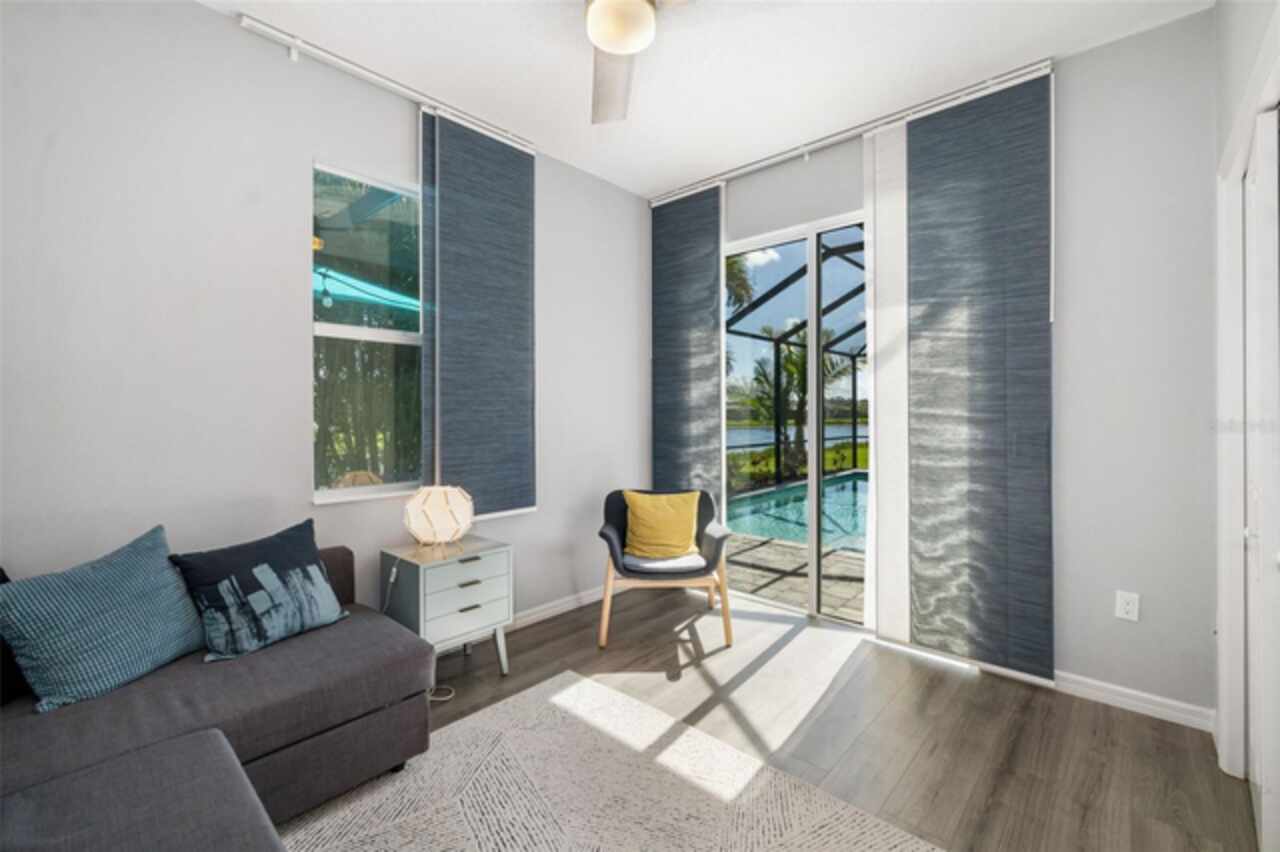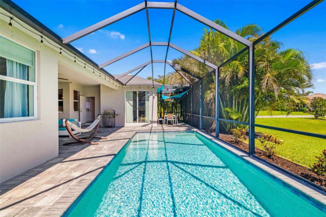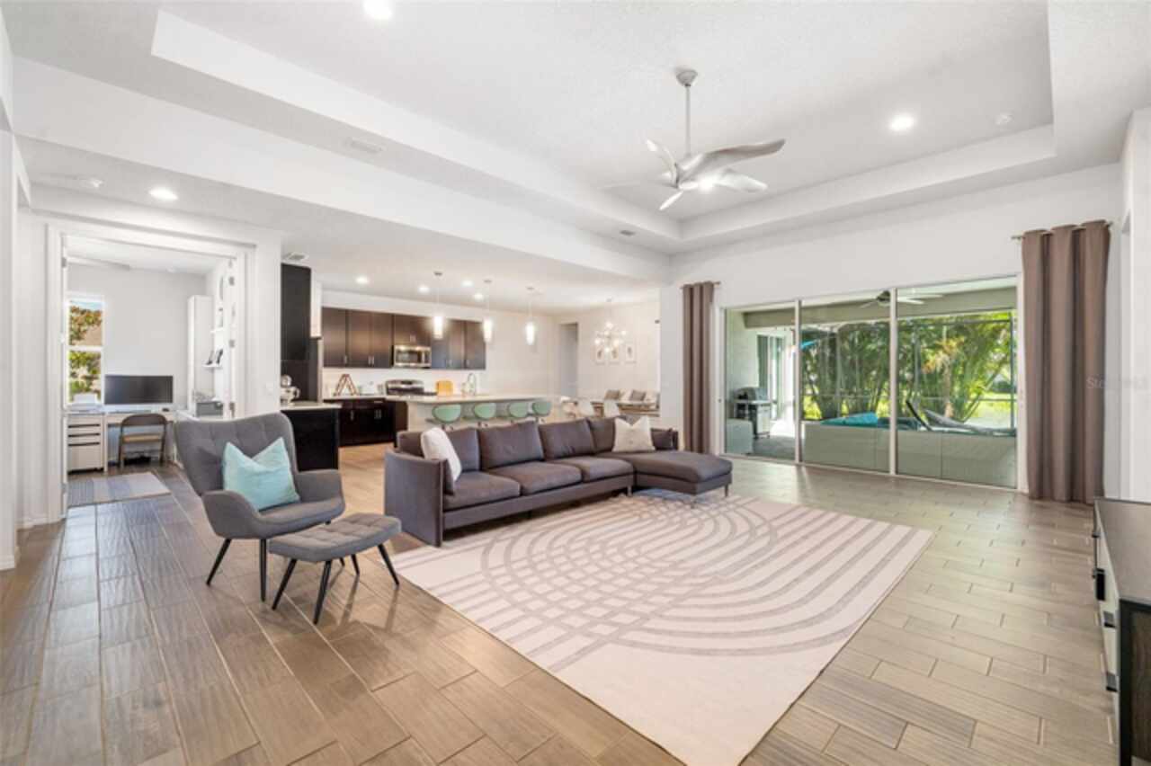 Premium private water views and an oversized corner lot set this Greyhawk Landing multigenerational Florida home apart. Built by Homes by Towne, this 4-bedroom, 2.5-bath residence, office, den space potential 5th bedroom, blends timeless design with modern comfort surrounded by lush tropical Florida palms. The open floor plan highlights tray ceilings, wood-look tile floors, and living spaces that are bright bringing in the natural light and flowing effortlessly out to the screened in lanai. Enjoy year-round living with a heated saltwater pool, large, covered areas, and serene lake views. The chef’s kitchen features quartz counters, island, gas range, and stainless appliances. The primary suite is a serene retreat with its own access to the lanai and pool, custom geometric accent wall, and designer lighting. A sliding barn door leads to the spa-like ensuite bath complete with dual sinks, a Roman walk-in shower, private water closet, makeup vanity, and a spacious walk-in closet. Additional features include engineered hardwood in bedrooms, laundry room, and 3-car garage. Greyhawk Landing, allows fencing, and residence have access to two resort-style pools, fitness centers, tennis and pickleball courts, playgrounds, trails that wind throughout the community, fishing pier, soccer and baseball fields and clubhouses, large bodies of lakes, lush tropical Florida landscaping, and frequent wildlife sightings. With easy access to Lakewood Ranch, shopping, restaurants and I-75, Gulf Coast beaches, top rated schools and colleges, IMG academy, Nathan Benderson Park, this is where everyday living feels like a vacation.