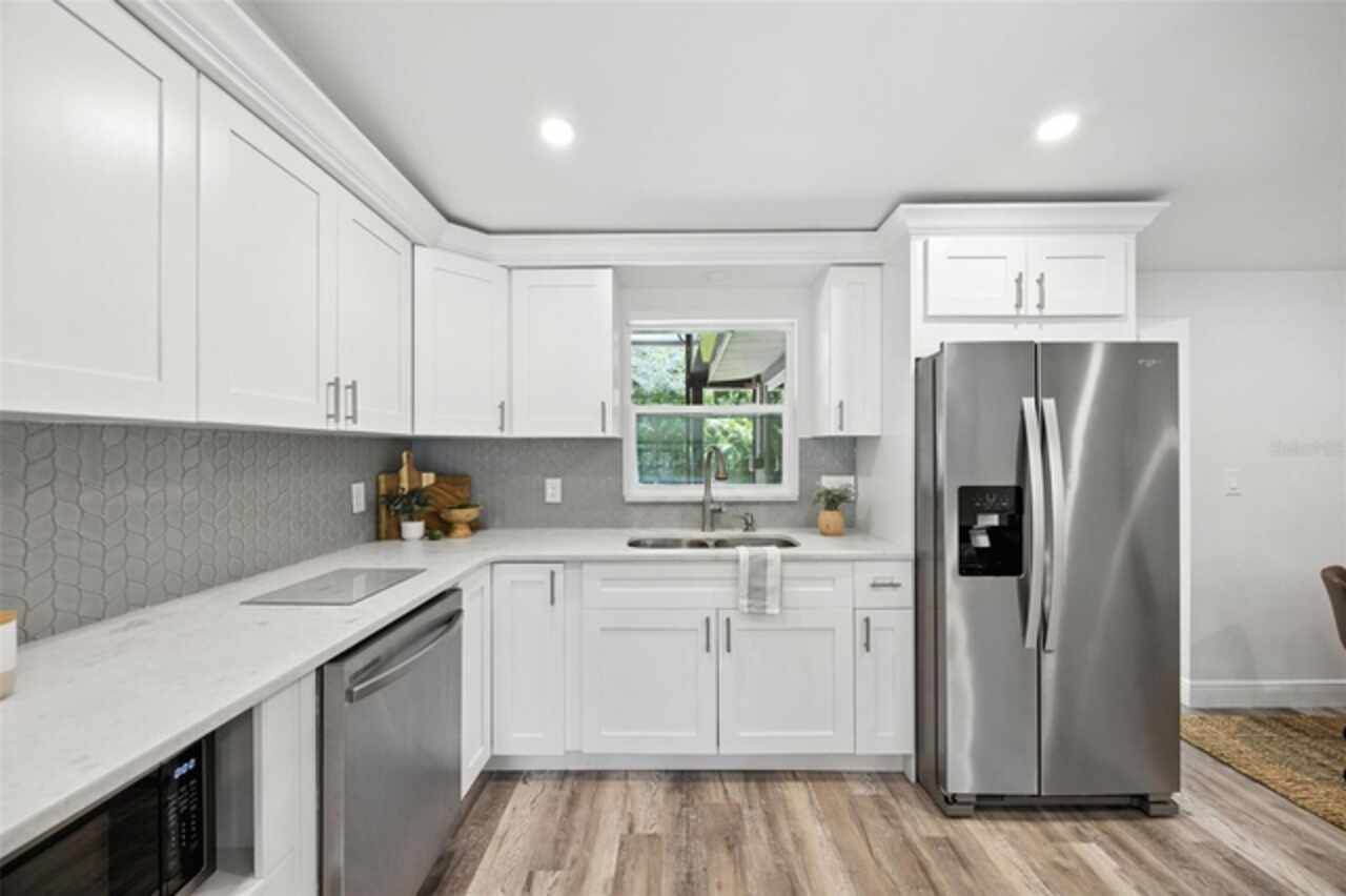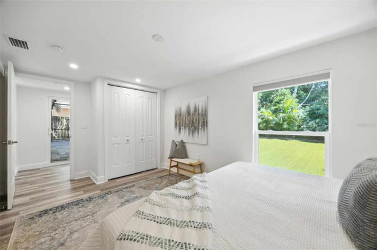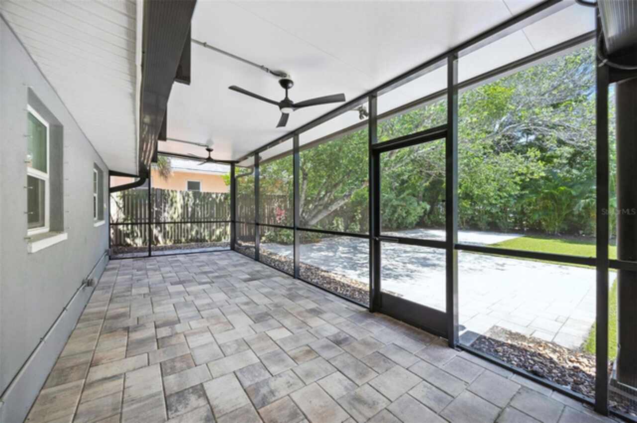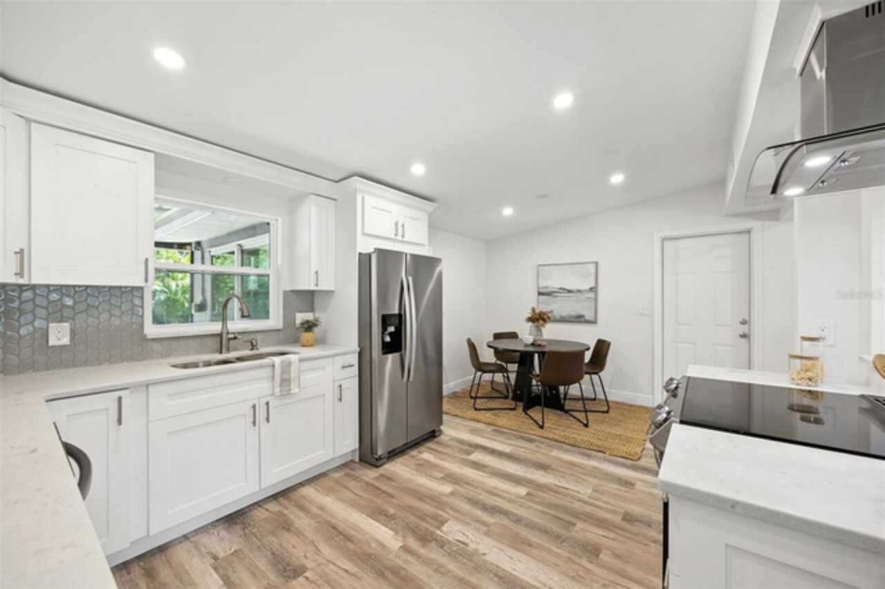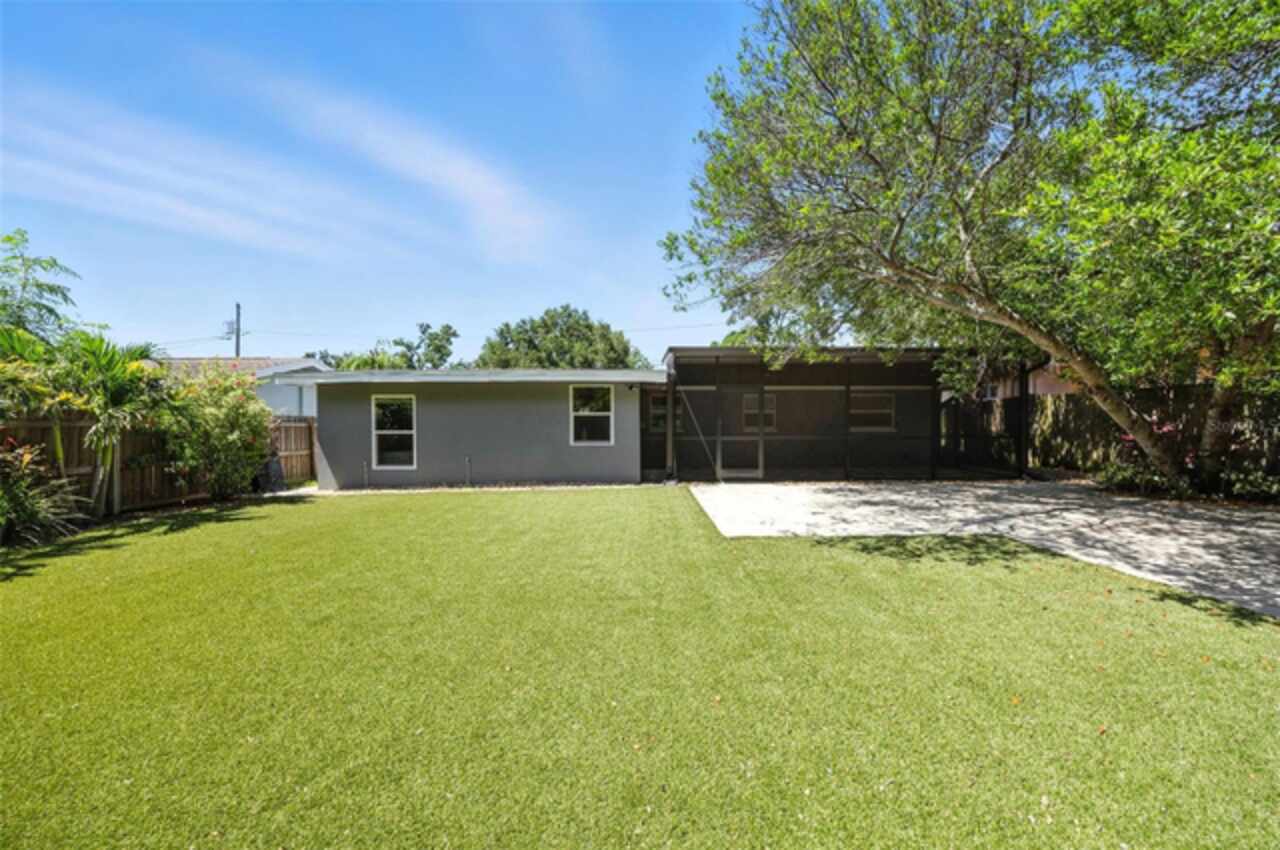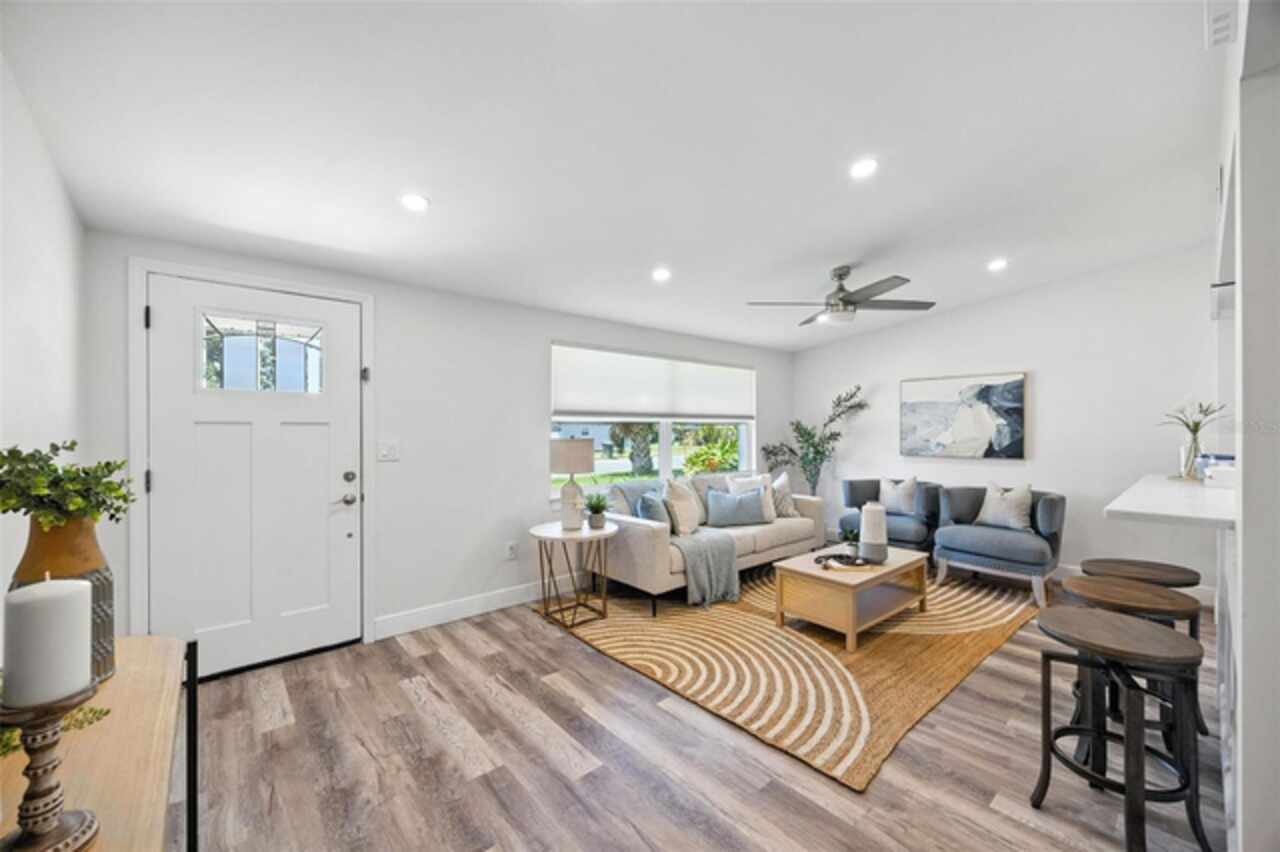 One or more photo(s) has been virtually staged. Settled in Dunedin’s beloved golf-cart district, this fully re-imagined 3-bed | 2-bath home with a stylish office nook puts the entire downtown scene at your fingertips—award-winning eateries, craft breweries, indie coffee spots, the Pinellas Trail, Weaver Park, and the City Pier are all a quick stroll or cart ride away. Located in no Flood Zone. Inside, everything feels brand-new: roof, HVAC, windows, electrical, plumbing, insulation, and level-5 drywall—wrapped in wide-plank flooring and drenched in natural light. The airy great room pivots around a show-stopper kitchen featuring a leathered-granite two-tier island—counter height below and a raised bar for tall stools, custom cabinetry, sleek vent-hood range, and an eye-catching designer backsplash. It’s the perfect stage for gathering friends and family. Just beyond the work-from-home nook, the private primary retreat serves up a a gorgeous view to the grand fenced-in patio and a bath clad in luxe tile. Two additional bedrooms share a chic hall bath on their own wing, offering ideal separation for guests or little ones. Slide the glass doors open to a backyard designed for Florida living: a screened-in rear porch leads to an expansive paver patio and a plush astro-turf lawn big enough for your future pool. The yard is also dialed-in for easy maintenance with a front-yard sprinkler system and drip-line irrigation for the back garden beds, controlled via smartphone app—a true low-maintenance haven for grilling, lounging, or unforgettable starlit evenings around the fire pit.