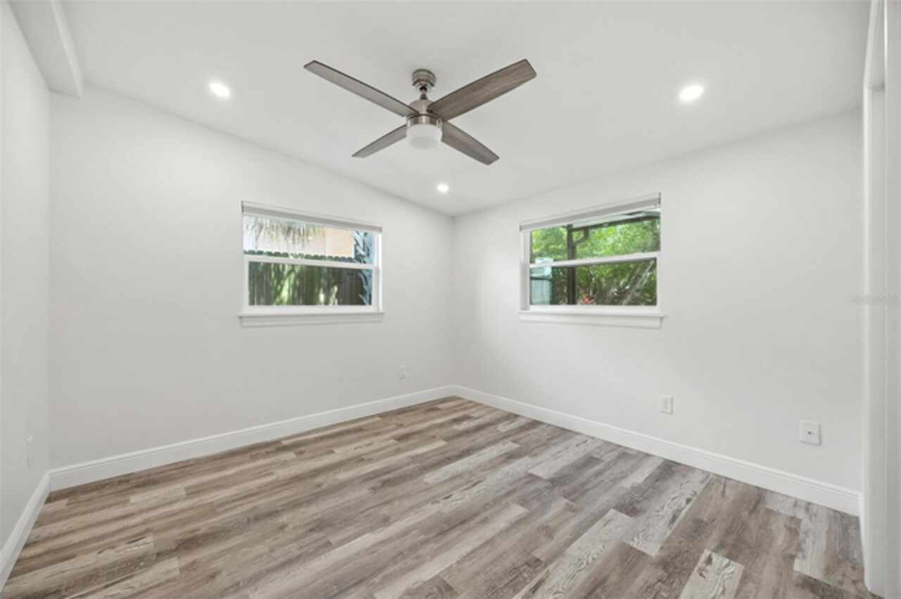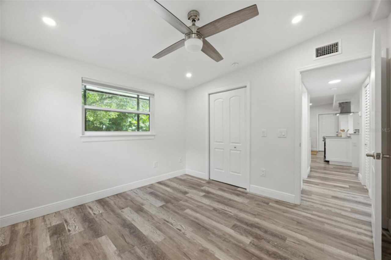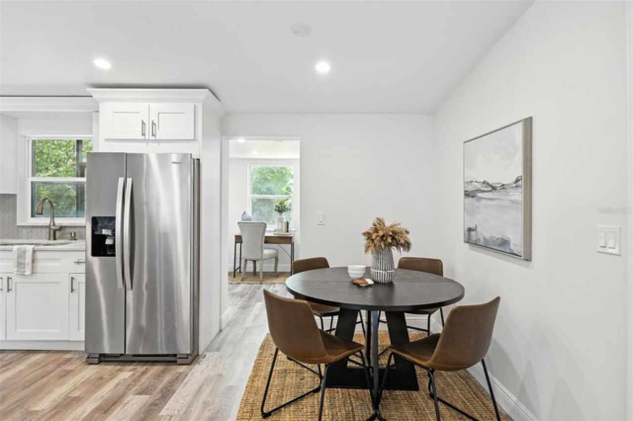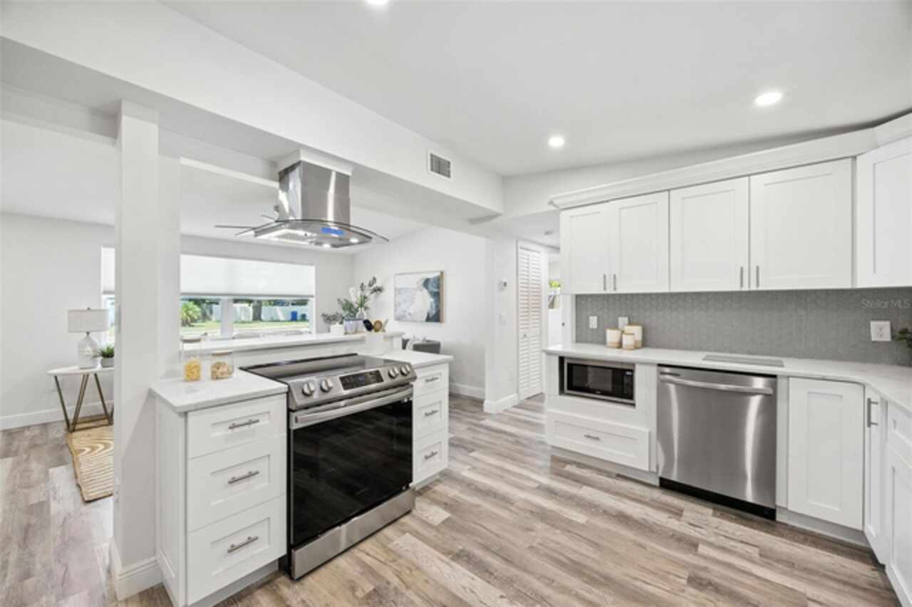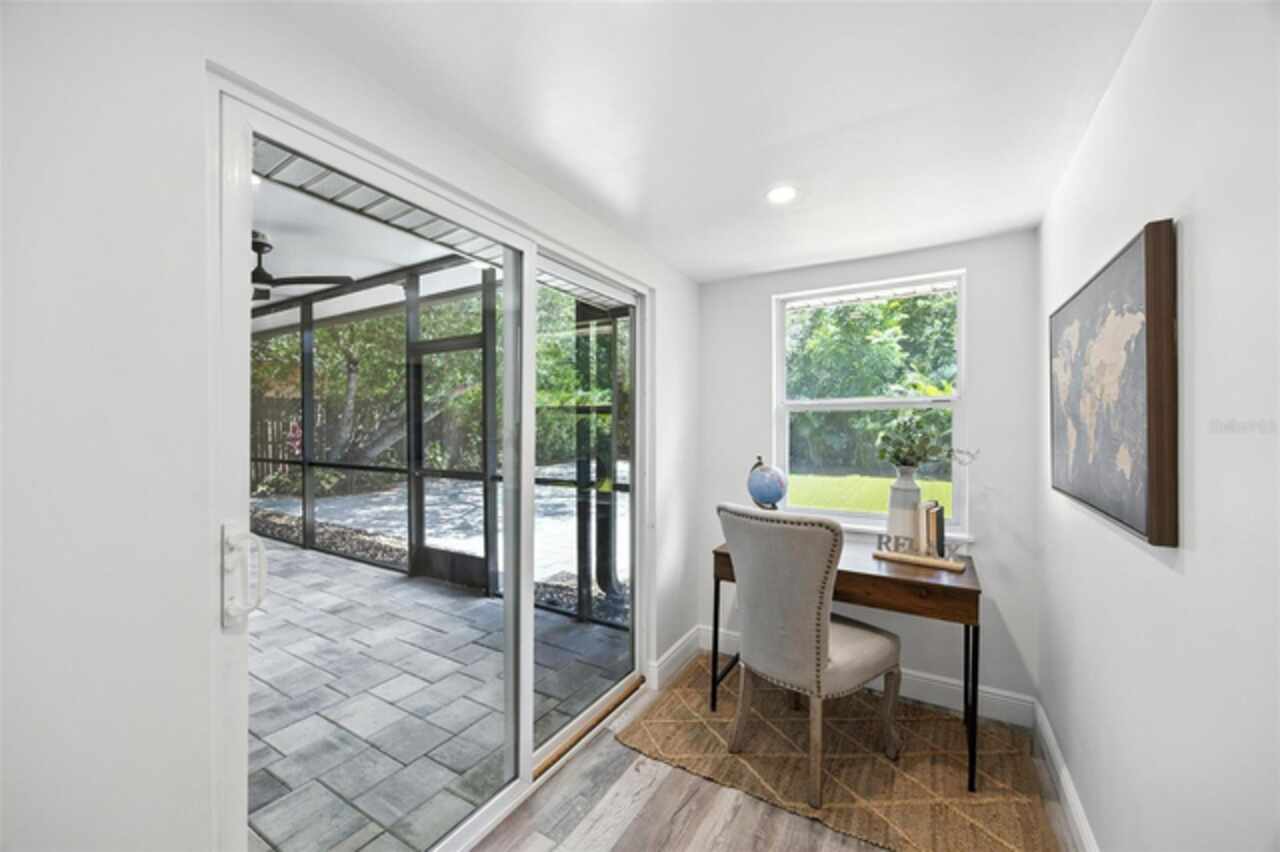 One or more photo(s) has been virtually staged. Settled in Dunedin’s beloved golf-cart district, this fully re-imagined 3-bed | 2-bath home with a stylish office nook puts the entire downtown scene at your fingertips—award-winning eateries, craft breweries, indie coffee spots, the Pinellas Trail, Weaver Park, and the City Pier are all a quick stroll or cart ride away. Located in no Flood Zone. Inside, everything feels brand-new: roof, HVAC, windows, electrical, plumbing, insulation, and level-5 drywall—wrapped in wide-plank flooring and drenched in natural light. The airy great room pivots around a show-stopper kitchen featuring a leathered-granite two-tier island—counter height below and a raised bar for tall stools, custom cabinetry, sleek vent-hood range, and an eye-catching designer backsplash. It’s the perfect stage for gathering friends and family. Just beyond the work-from-home nook, the private primary retreat serves up a a gorgeous view to the grand fenced-in patio and a bath clad in luxe tile. Two additional bedrooms share a chic hall bath on their own wing, offering ideal separation for guests or little ones. Slide the glass doors open to a backyard designed for Florida living: a screened-in rear porch leads to an expansive paver patio and a plush astro-turf lawn big enough for your future pool. The yard is also dialed-in for easy maintenance with a front-yard sprinkler system and drip-line irrigation for the back garden beds, controlled via smartphone app—a true low-maintenance haven for grilling, lounging, or unforgettable starlit evenings around the fire pit.