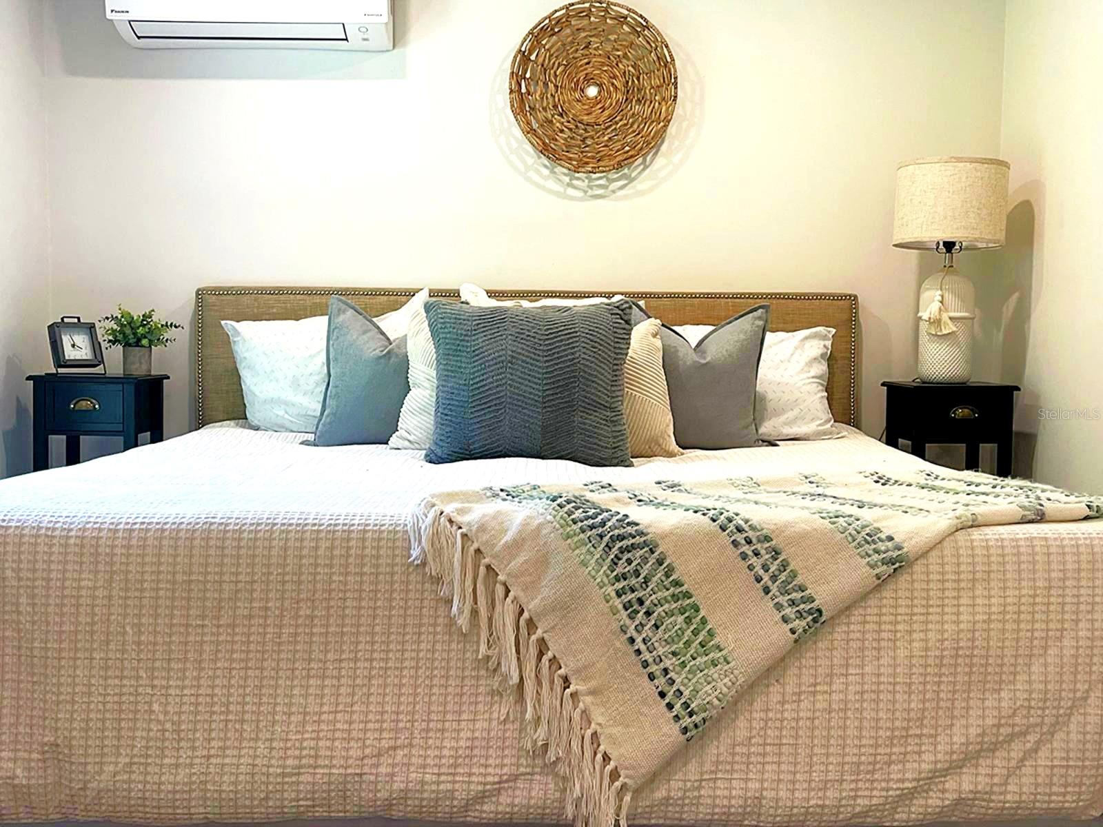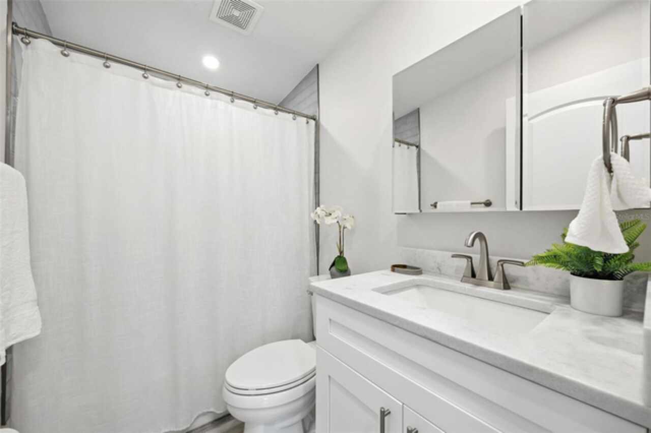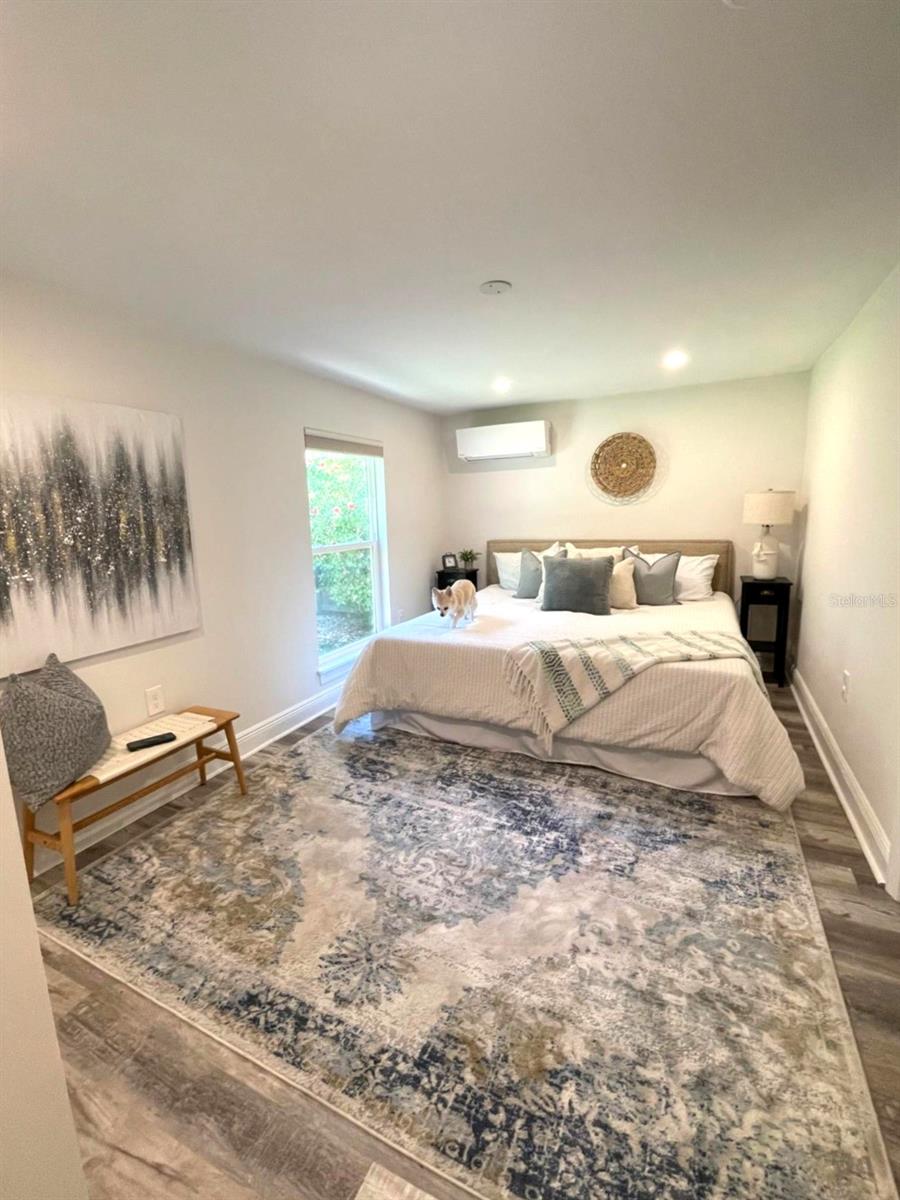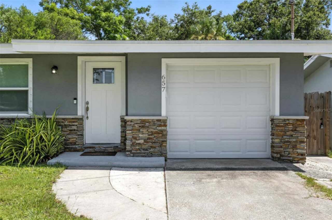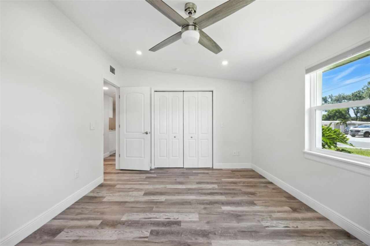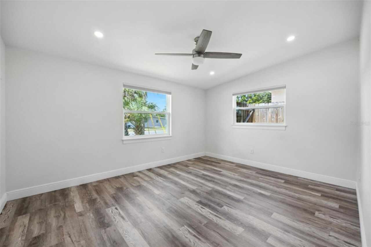 One or more photo(s) has been virtually staged. Settled in Dunedin’s beloved golf-cart district, this fully re-imagined 3-bed | 2-bath home with a stylish office nook puts the entire downtown scene at your fingertips—award-winning eateries, craft breweries, indie coffee spots, the Pinellas Trail, Weaver Park, and the City Pier are all a quick stroll or cart ride away. Located in no Flood Zone. Inside, everything feels brand-new: roof, HVAC, windows, electrical, plumbing, insulation, and level-5 drywall—wrapped in wide-plank flooring and drenched in natural light. The airy great room pivots around a show-stopper kitchen featuring a leathered-granite two-tier island—counter height below and a raised bar for tall stools, custom cabinetry, sleek vent-hood range, and an eye-catching designer backsplash. It’s the perfect stage for gathering friends and family. Just beyond the work-from-home nook, the private primary retreat serves up a a gorgeous view to the grand fenced-in patio and a bath clad in luxe tile. Two additional bedrooms share a chic hall bath on their own wing, offering ideal separation for guests or little ones. Slide the glass doors open to a backyard designed for Florida living: a screened-in rear porch leads to an expansive paver patio and a plush astro-turf lawn big enough for your future pool. The yard is also dialed-in for easy maintenance with a front-yard sprinkler system and drip-line irrigation for the back garden beds, controlled via smartphone app—a true low-maintenance haven for grilling, lounging, or unforgettable starlit evenings around the fire pit.