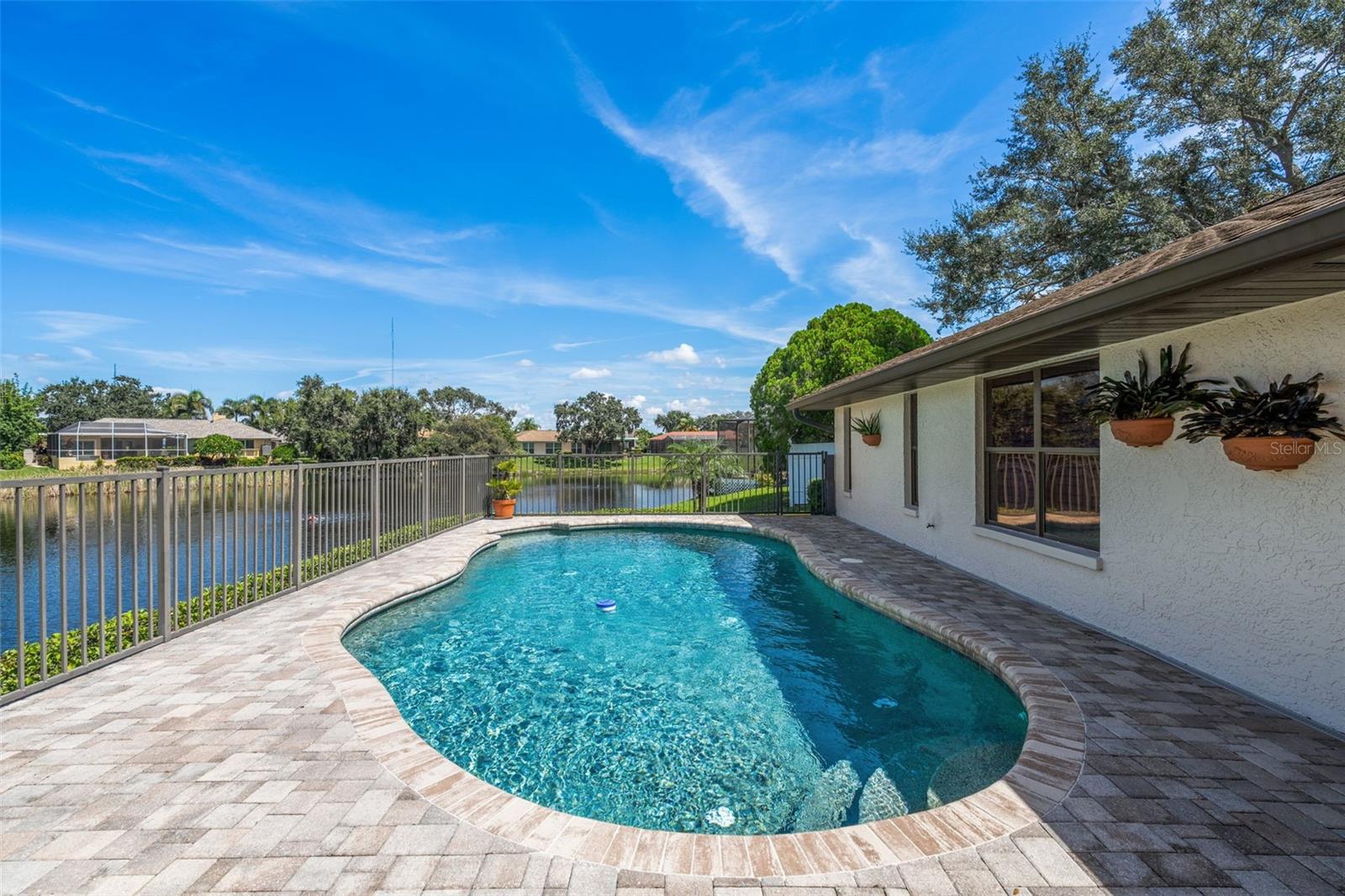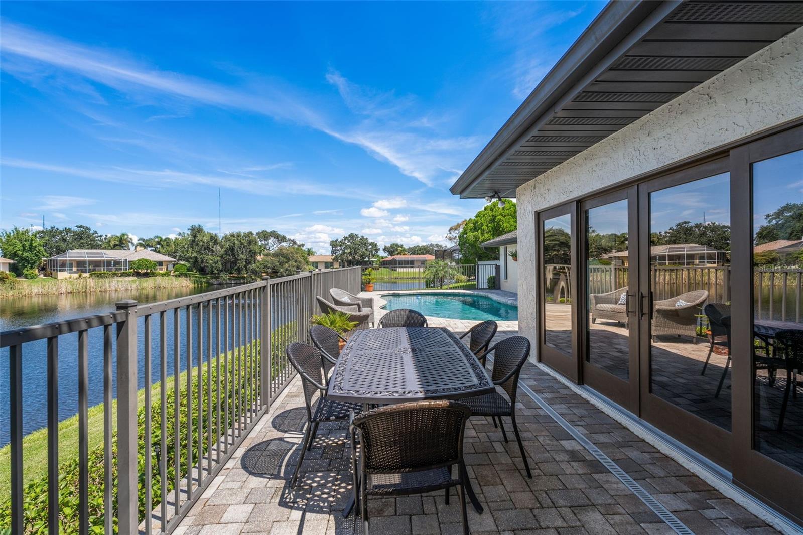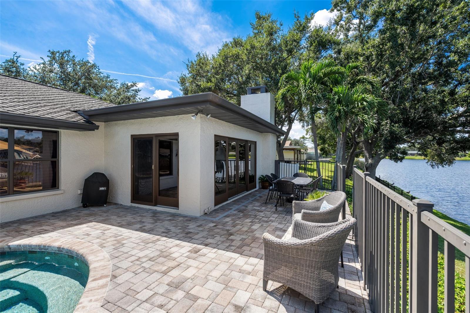 Discover the elegance of Riviera Bay, an established waterfront community, with this meticulously maintained lakefront pool home—a true rarity. Important to note: this home has never flooded! As you approach, you'll be impressed by the mature landscape, paver driveway, and inviting entry that set the tone for this unique property. Step inside to a welcoming foyer adorned with travertine tile floors, leading you to rooms that boast beautiful water views. Enjoy the warmth of the sunroom's wood-burning fireplace or entertain in the beautiful dining and living rooms. For dining al fresco, the tranquil poolside setting by the quiet lake offers the perfect ambiance, day or night. Inside, the kitchen stands out with white Kraftmaid cabinets, some featuring glass fronts for displaying your cherished items. It is complemented by granite countertops, stainless steel appliances, and a spacious breakfast bar. Adjacent, the large family room, enhanced by custom cabinetry, provides a cozy space for gatherings or TV time. Retreat to the primary bedroom, a serene space with an en suite bath, walk-in shower, and custom vanity. The generously sized second bedroom also features an en suite full bath, while the versatile third bedroom can serve as a home office, workout space, nursery, or playroom, conveniently located near the third full bath with a jacuzzi tub. This home showcases attention to detail, with features like a sizable laundry room, plantation shutters, crown molding, recessed lighting, custom cabinetry, aluminum pool deck fencing, exterior lighting, and an irrigation system using reclaimed water. The property's prime location offers proximity to Tampa, Clearwater, downtown St. Petersburg, shopping, and dining, just minutes away. Schedule your private showing today!