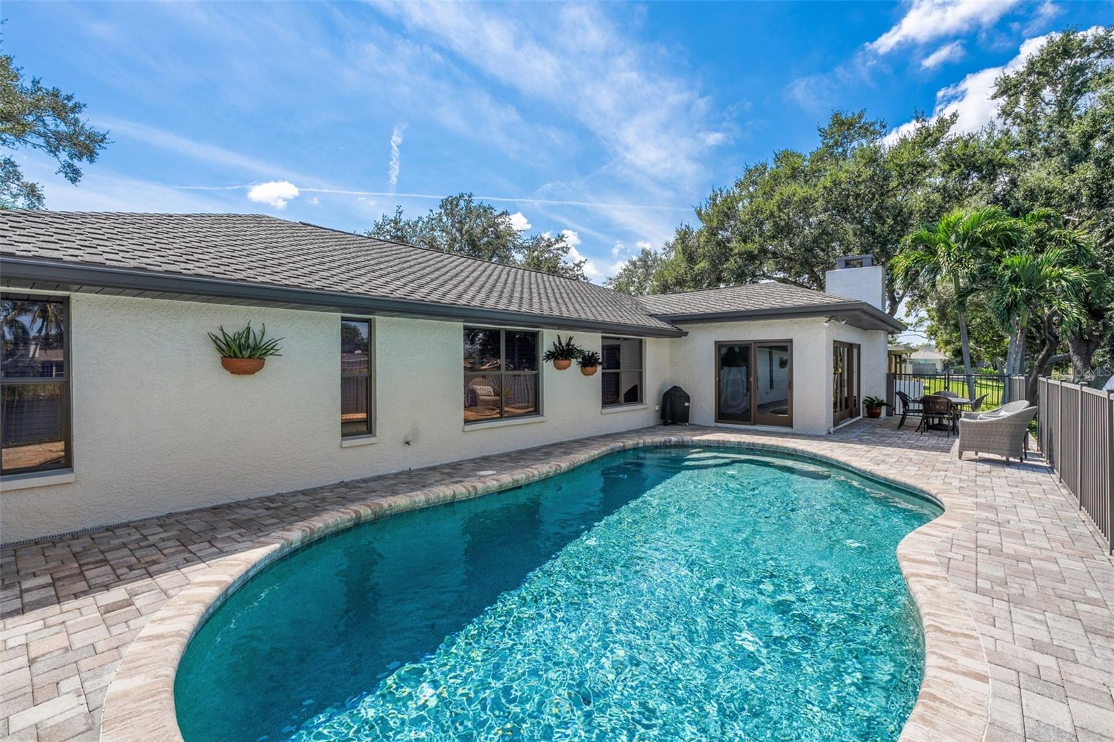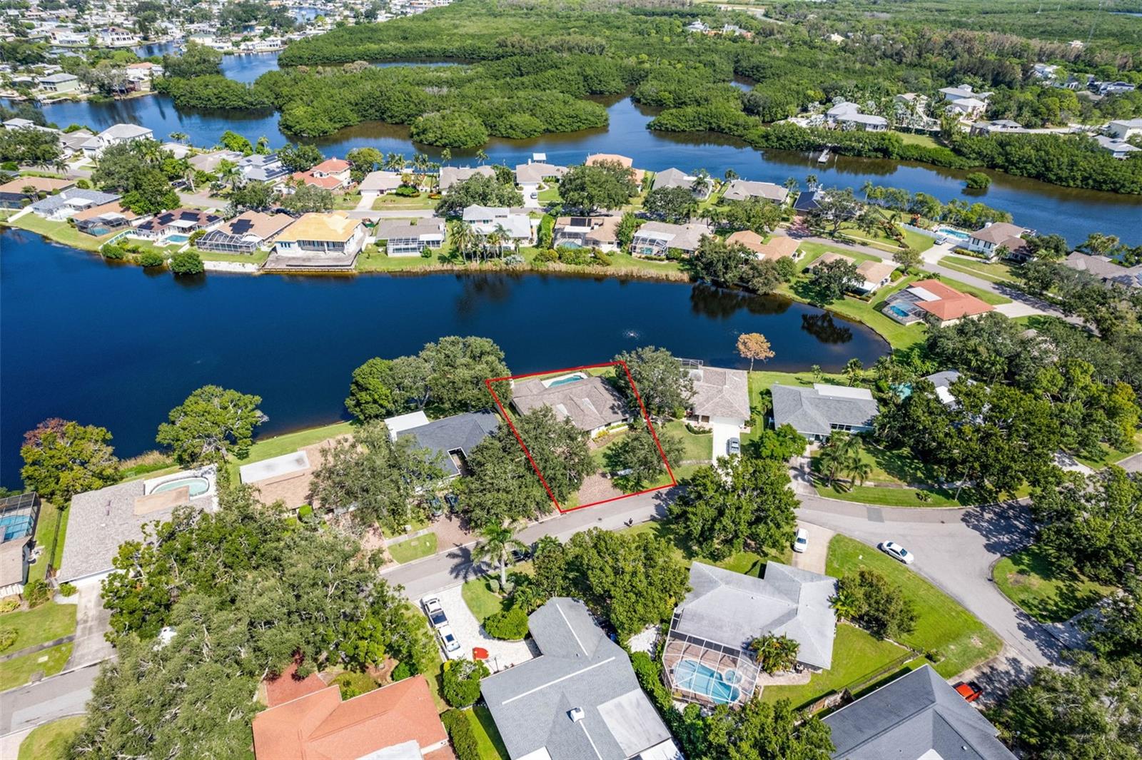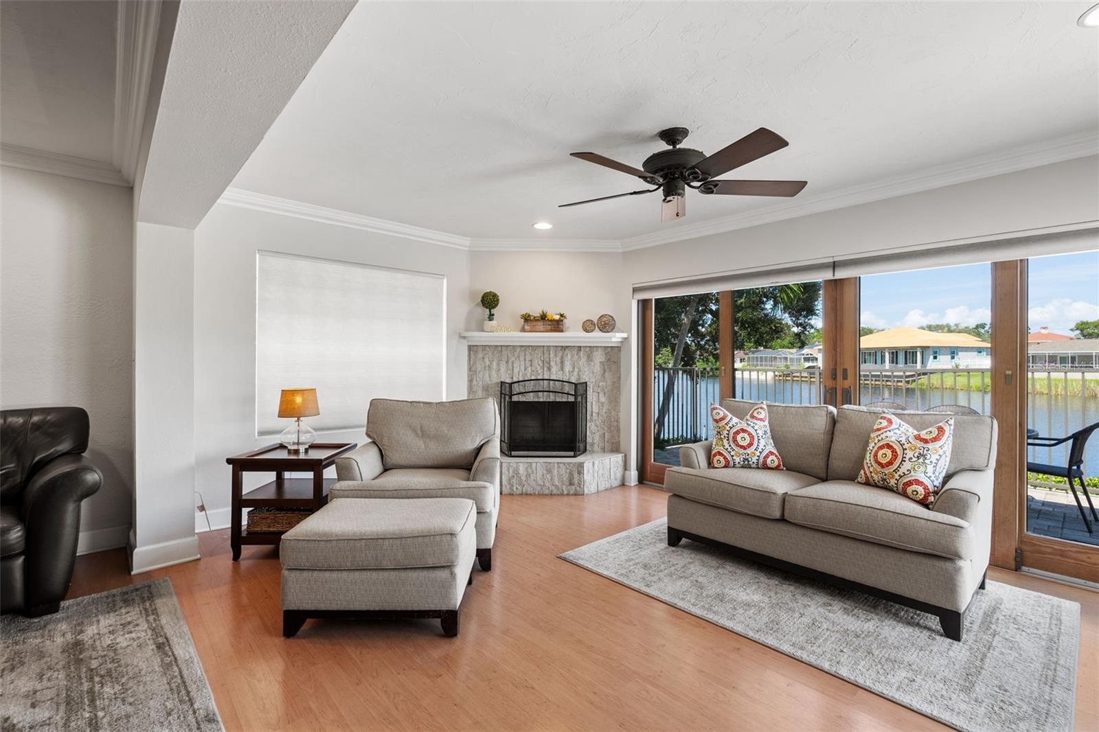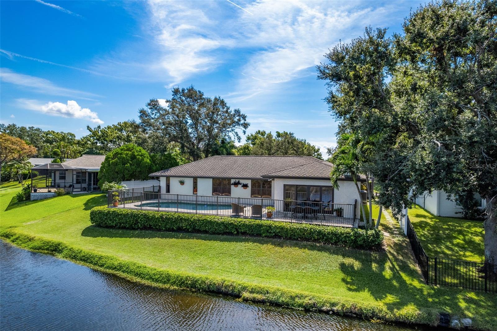 Discover the elegance of Riviera Bay, an established waterfront community, with this meticulously maintained lakefront pool home—a true rarity. Important to note: this home has never flooded! As you approach, you'll be impressed by the mature landscape, paver driveway, and inviting entry that set the tone for this unique property. Step inside to a welcoming foyer adorned with travertine tile floors, leading you to rooms that boast beautiful water views. Enjoy the warmth of the sunroom's wood-burning fireplace or entertain in the beautiful dining and living rooms. For dining al fresco, the tranquil poolside setting by the quiet lake offers the perfect ambiance, day or night. Inside, the kitchen stands out with white Kraftmaid cabinets, some featuring glass fronts for displaying your cherished items. It is complemented by granite countertops, stainless steel appliances, and a spacious breakfast bar. Adjacent, the large family room, enhanced by custom cabinetry, provides a cozy space for gatherings or TV time. Retreat to the primary bedroom, a serene space with an en suite bath, walk-in shower, and custom vanity. The generously sized second bedroom also features an en suite full bath, while the versatile third bedroom can serve as a home office, workout space, nursery, or playroom, conveniently located near the third full bath with a jacuzzi tub. This home showcases attention to detail, with features like a sizable laundry room, plantation shutters, crown molding, recessed lighting, custom cabinetry, aluminum pool deck fencing, exterior lighting, and an irrigation system using reclaimed water. The property's prime location offers proximity to Tampa, Clearwater, downtown St. Petersburg, shopping, and dining, just minutes away. Schedule your private showing today!