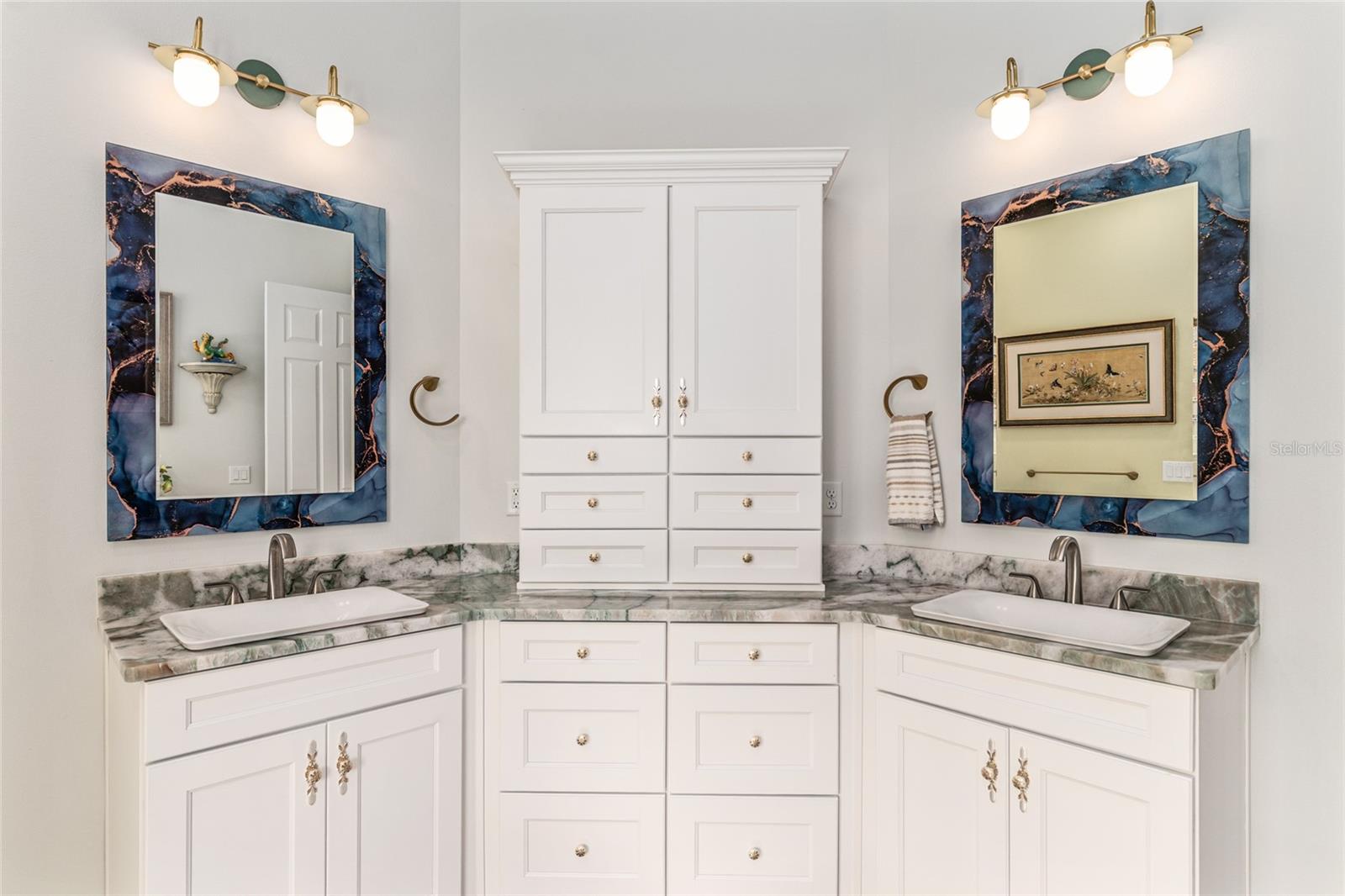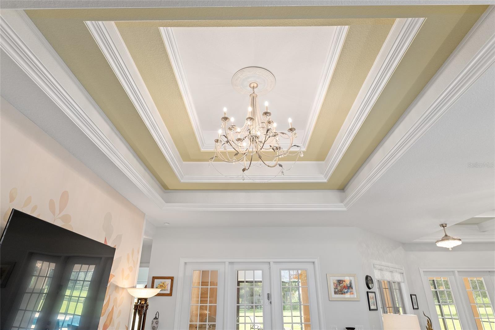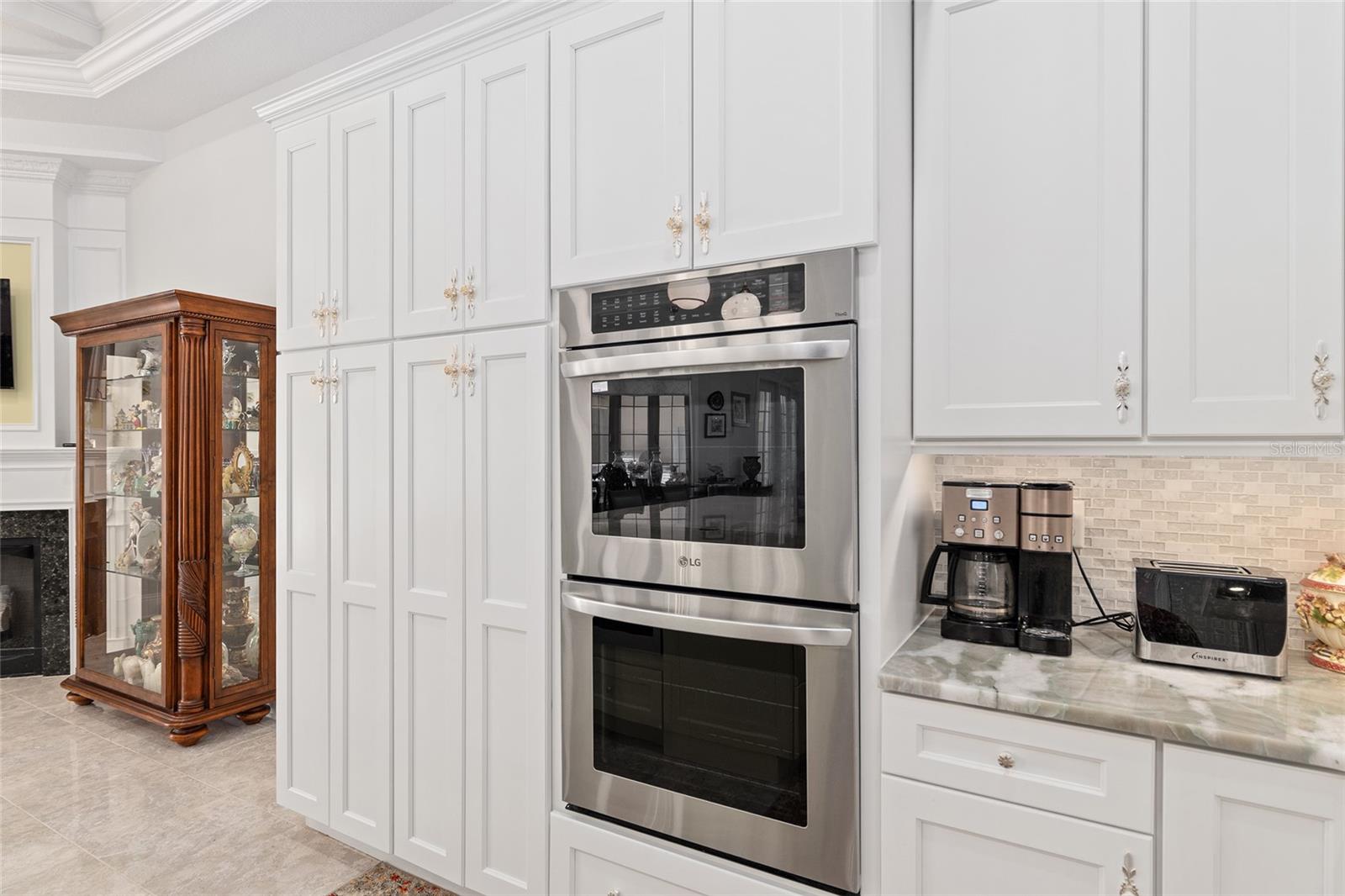 Built-in Features, Ceiling Fans(s), Chair Rail, Crown Molding, Eat-in Kitchen, High Ceilings, Open Floorplan, Primary Bedroom Main Floor, Split Bedroom, Stone Counters, Thermostat, Walk-In Closet(s)
