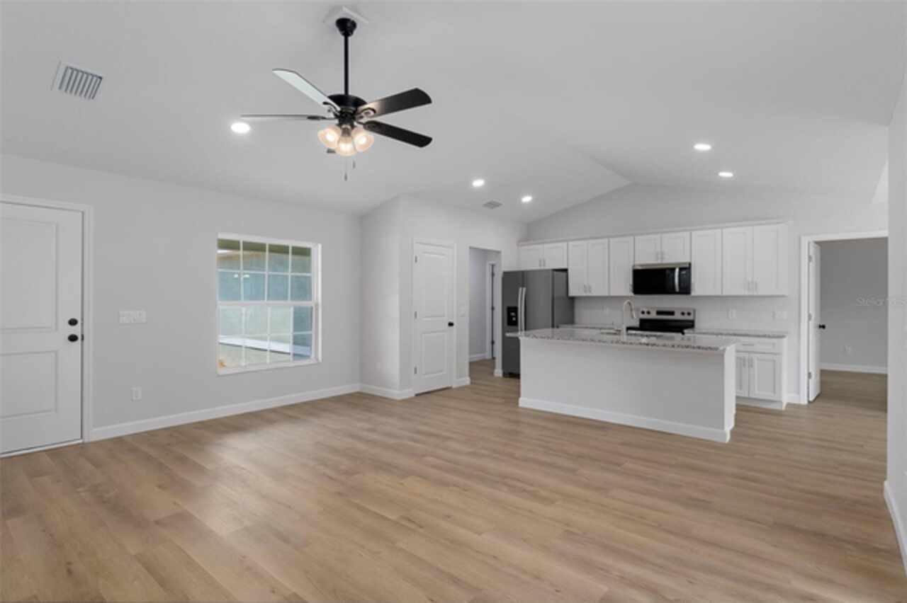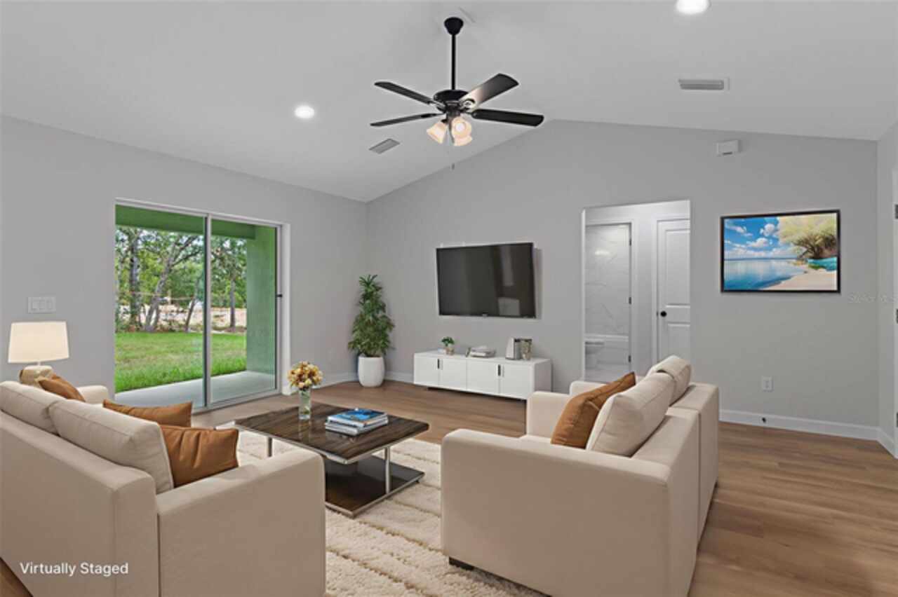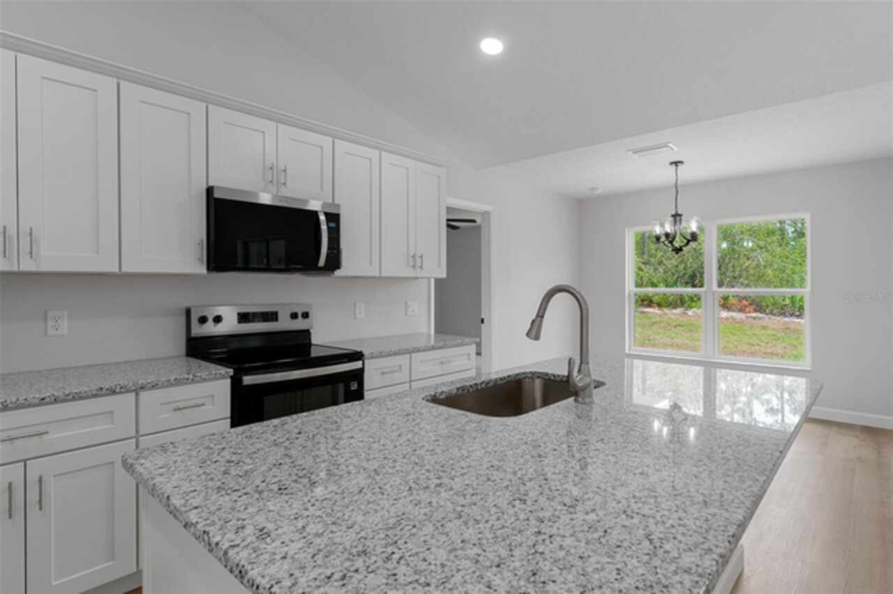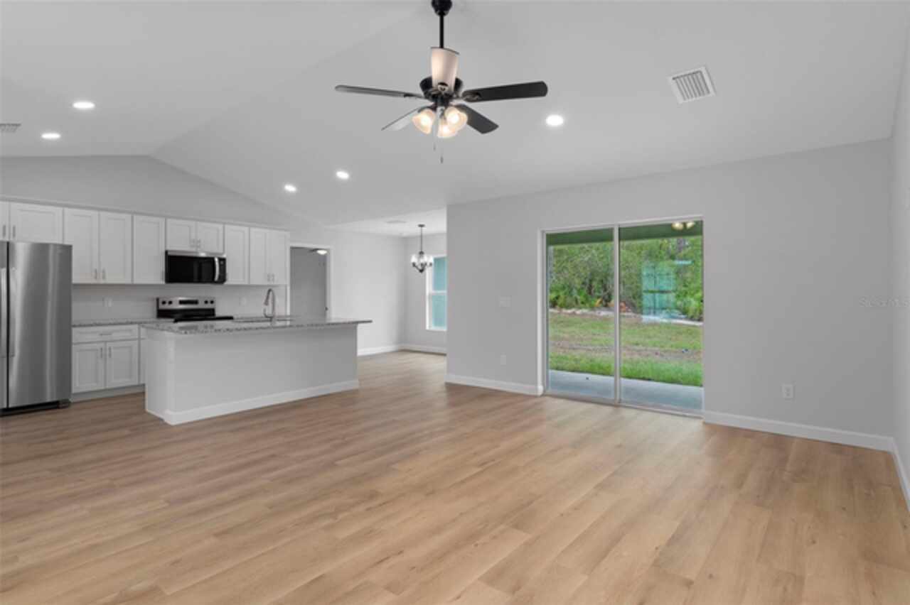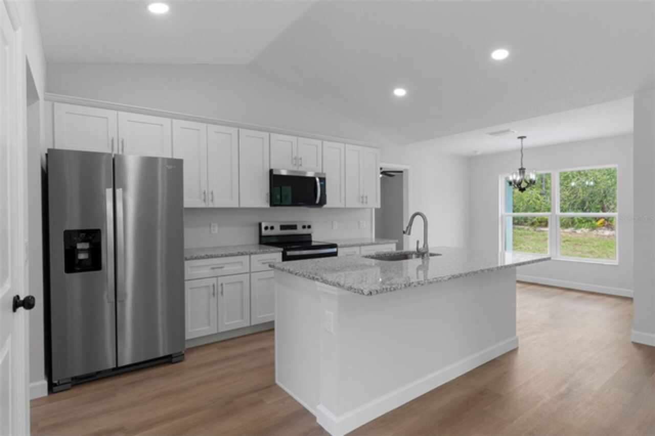 Stunning New Construction with Modern Elegance and Everyday Comfort Step into this beautifully designed brand-new 3-bedroom, 2-bath home featuring an open-concept floor plan and high-end finishes throughout. The heart of the home is a bright, stylish kitchen boasting granite countertops, crisp white cabinetry, stainless steel appliances, and a spacious dining area—perfect for family meals or entertaining friends. Flowing seamlessly from the kitchen, the expansive great room offers an inviting space to relax or gather, all enhanced by durable luxury vinyl plank flooring that runs throughout the home. The bathrooms are finished with elegant tile, adding a touch of timeless sophistication. Unwind in the private primary suite, complete with a walk-in closet and a beautifully appointed ensuite bathroom. An oversized laundry room offers generous storage and convenience for busy households. Enjoy the best of Florida living with both a covered front porch and a covered rear lanai—ideal for morning coffee, evening wine, or simply soaking in the outdoors. This home blends quality craftsmanship, thoughtful design, and modern features—ready for you to move in and make it yours. Some interior photos have been virtually staged.