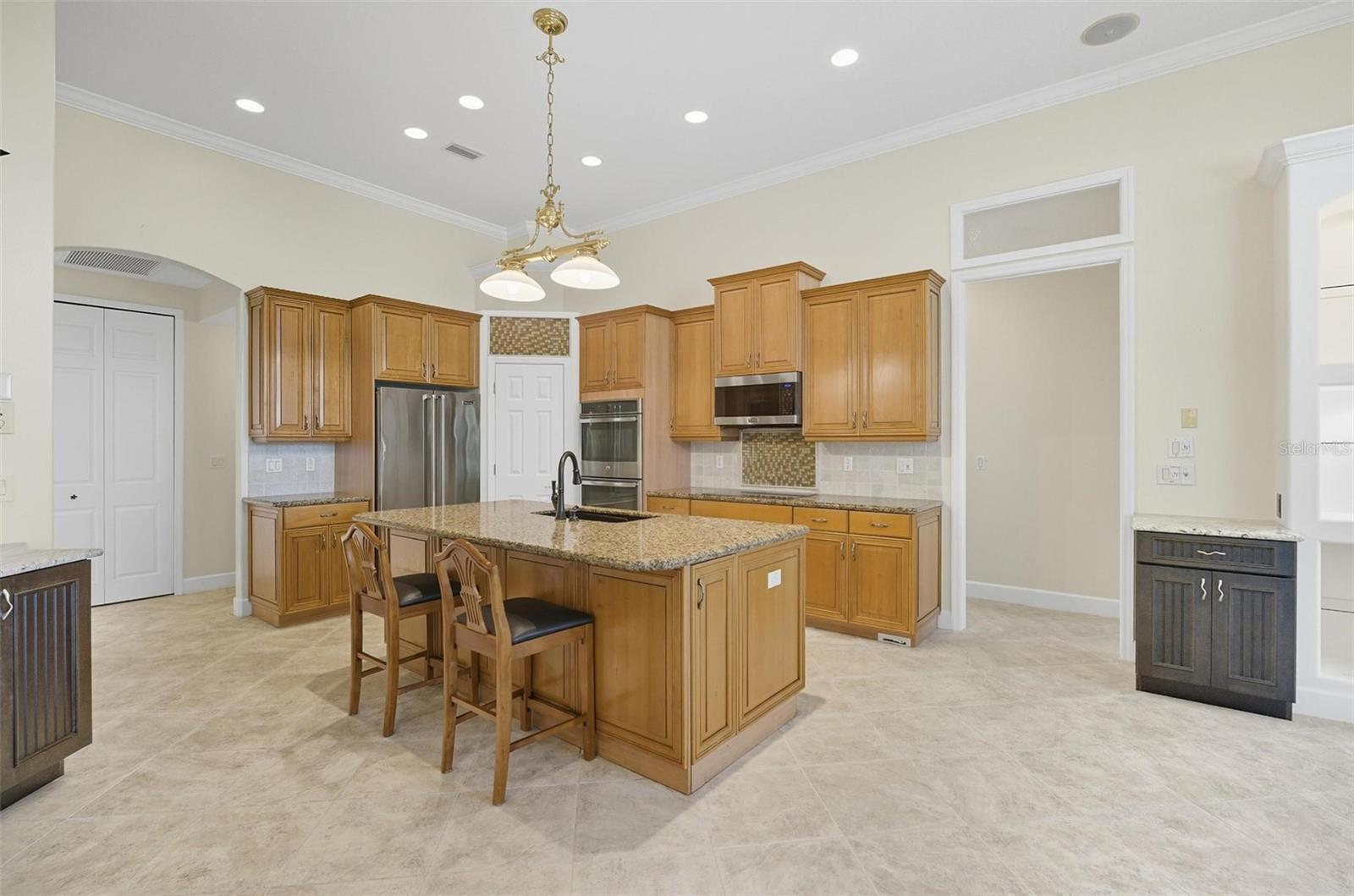 Built-in Features, Ceiling Fans(s), Crown Molding, Eat-in Kitchen, High Ceilings, Kitchen/Family Room Combo, Other, Primary Bedroom Main Floor, Solid Wood Cabinets, Split Bedroom, Stone Counters, Thermostat, Tray Ceiling(s), Walk-In Closet(s), Wet Bar, Window Treatments