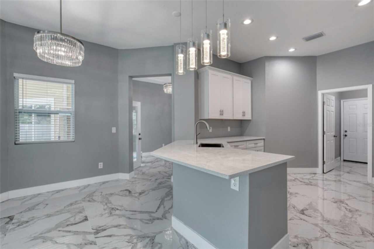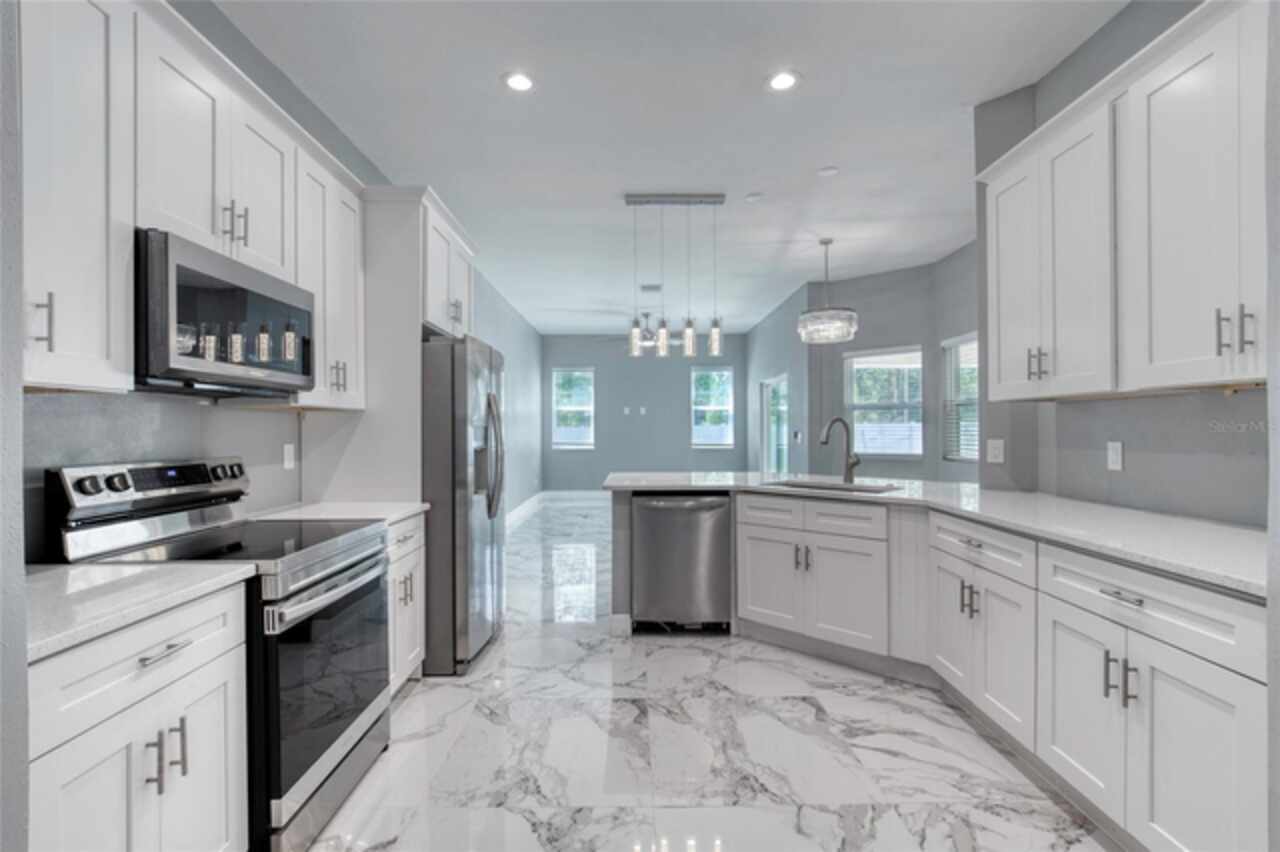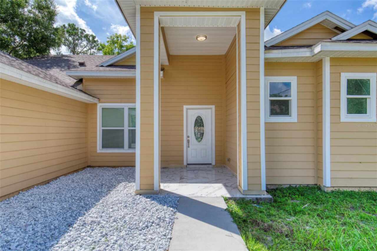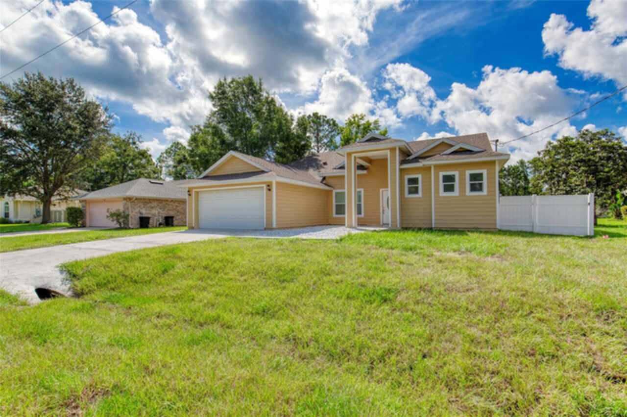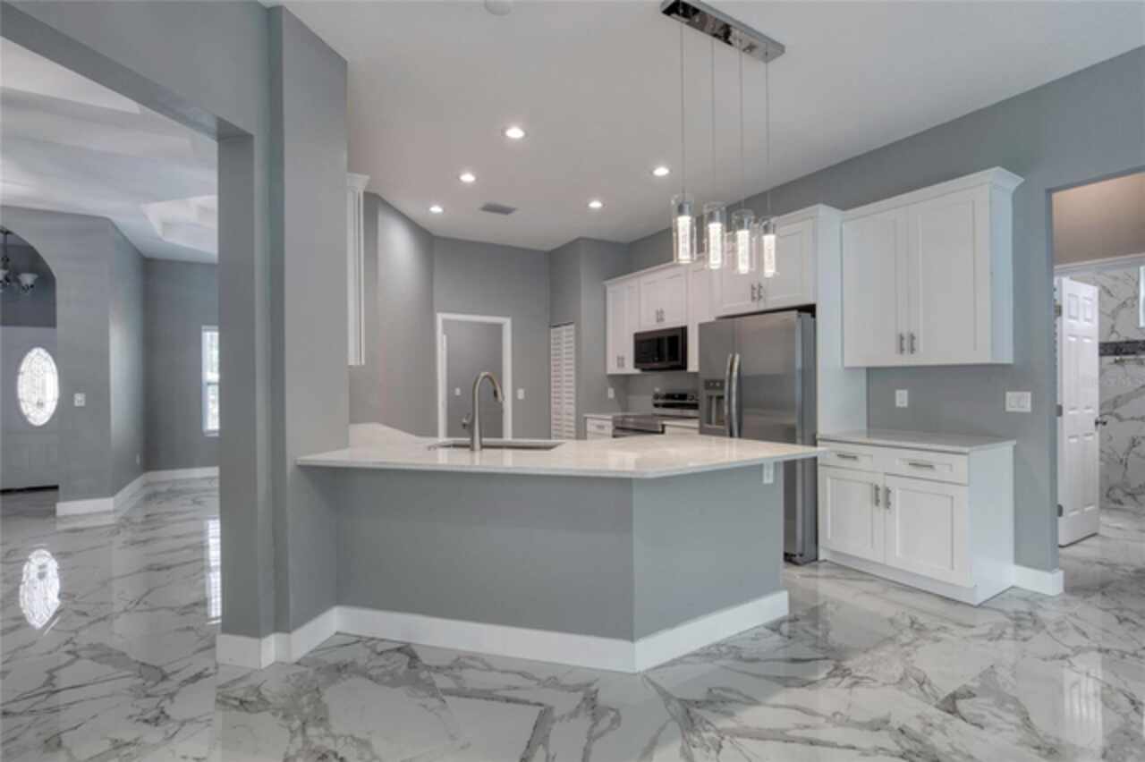 This newly remodeled 3-bedroom, 3-bathroom home in the desirable Pine Lakes subdivision is move-in ready and designed with modern living in mind. Step inside to find 30'' x 30'' porcelain tile floors throughout, a split floor plan offering privacy and function, and a stunning chef's kitchen with quartz countertops that carry through to the bathrooms. The spacious primary suite features elegant tray ceilings, a large walk-in closet, and a spa-like bathroom with dual vanities, a glass-enclosed shower, and a luxurious stand-alone soaking tub. Enjoy seamless indoor-outdoor living with sliding glass doors leading to a deep, covered veranda, complete with its own full outdoor bathroom—perfect for entertaining. The backyard is fully enclosed with a 6' white vinyl privacy fence and offers ample space for a future in-ground pool. Located just moments from Pine Lakes Golf Club, residents can also take advantage of the area's many trails for biking, jogging, and skating. With a brand new roof, hot water heater, and HVAC, this home is turn key ready. All information entered in the MLS in intended to be 100% accurate but cannot be guaranteed.