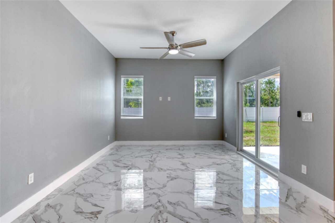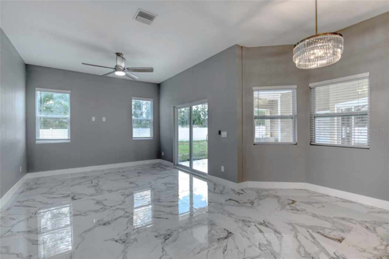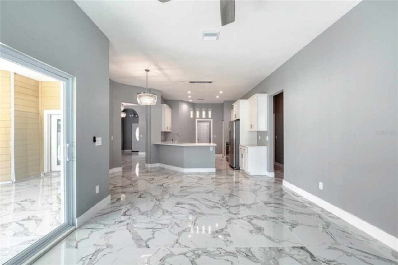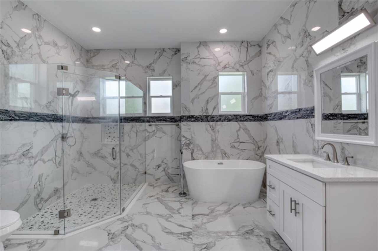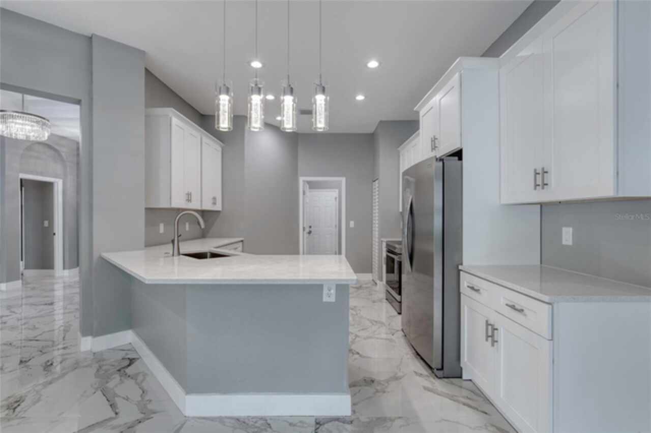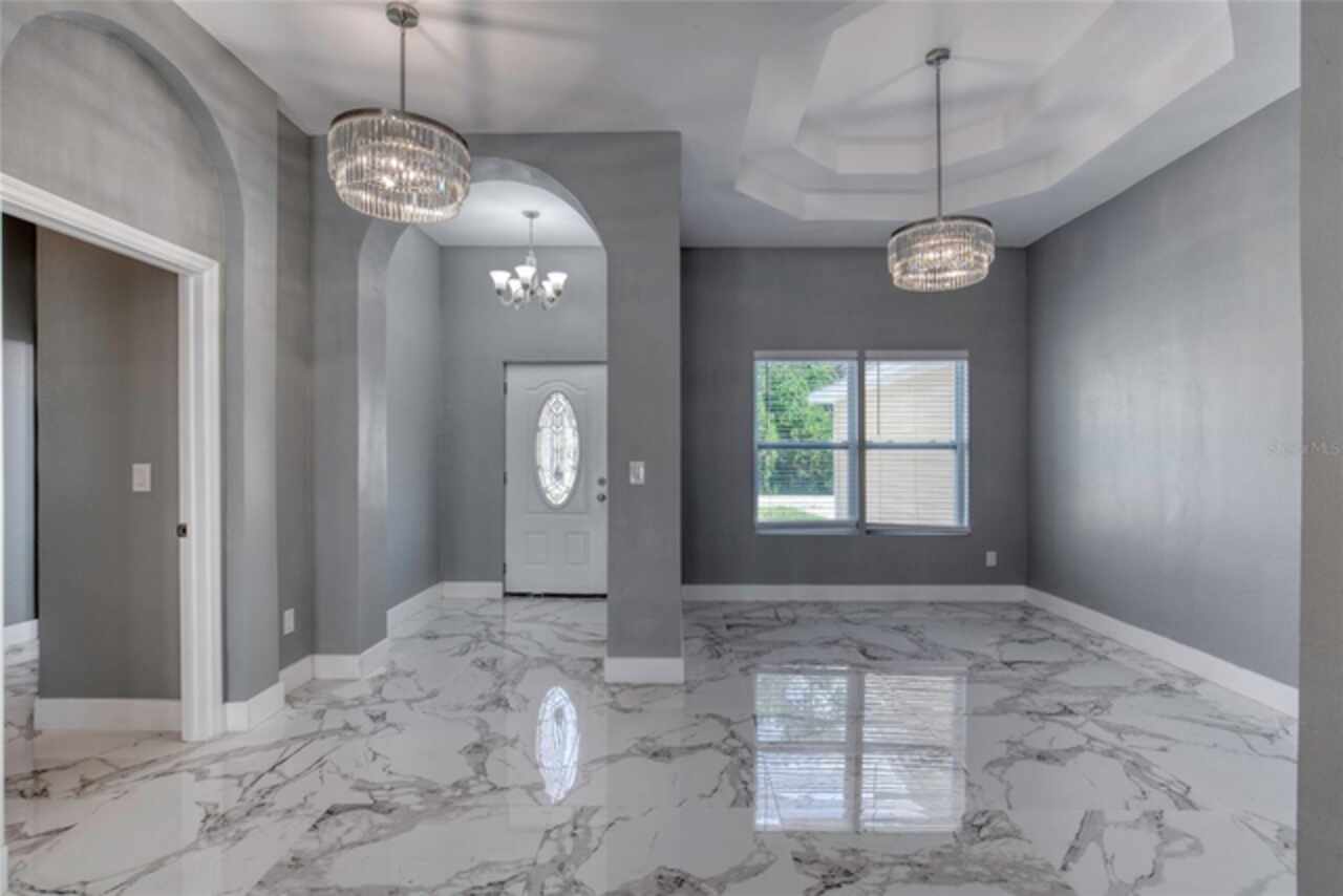 This newly remodeled 3-bedroom, 3-bathroom home in the desirable Pine Lakes subdivision is move-in ready and designed with modern living in mind. Step inside to find 30'' x 30'' porcelain tile floors throughout, a split floor plan offering privacy and function, and a stunning chef's kitchen with quartz countertops that carry through to the bathrooms. The spacious primary suite features elegant tray ceilings, a large walk-in closet, and a spa-like bathroom with dual vanities, a glass-enclosed shower, and a luxurious stand-alone soaking tub. Enjoy seamless indoor-outdoor living with sliding glass doors leading to a deep, covered veranda, complete with its own full outdoor bathroom—perfect for entertaining. The backyard is fully enclosed with a 6' white vinyl privacy fence and offers ample space for a future in-ground pool. Located just moments from Pine Lakes Golf Club, residents can also take advantage of the area's many trails for biking, jogging, and skating. With a brand new roof, hot water heater, and HVAC, this home is turn key ready. All information entered in the MLS in intended to be 100% accurate but cannot be guaranteed.